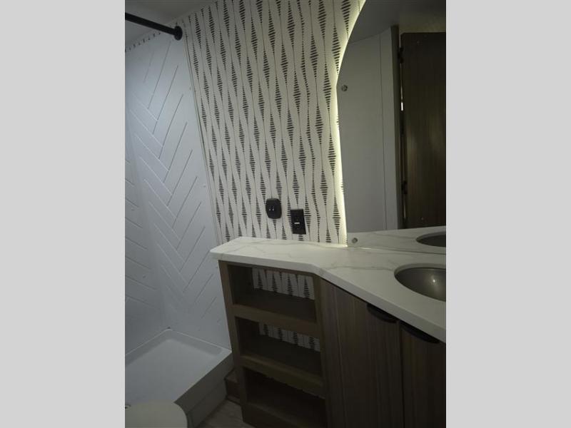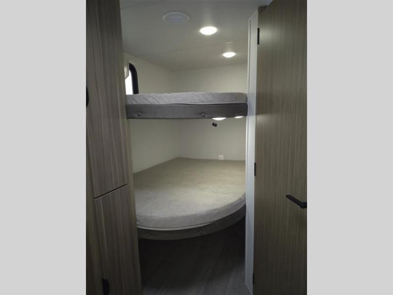 Camping is made easy in this travel trailer with more sleeping space and lots of comforts! The kids or your guests will enjoy the double-size bunks in the back, along with the full bath close by for easy nighttime use. You'll have the front private bedroom with a king bed all to yourselves, and there are dual bedroom wardrobes to keep your space neat and clean. Everyone can meet in the combined kitchen and living room to relax on the super U-lounge with a removable table while the chef of your group makes breakfast on the two burner cooktop. There is also a microwave oven for quick meals, plus a pantry and refrigerator for food storage!