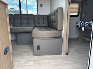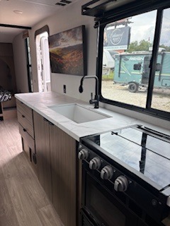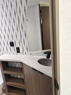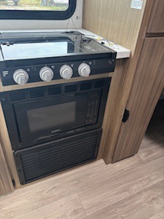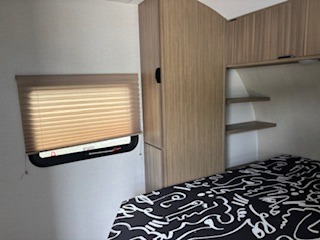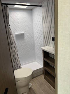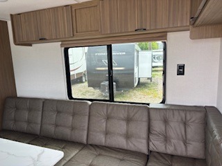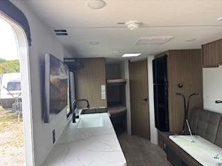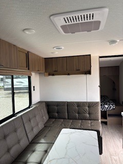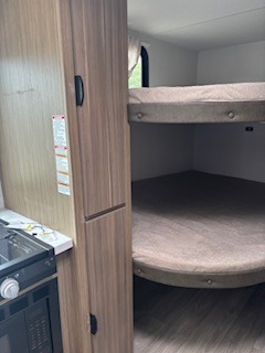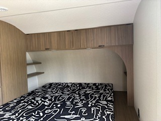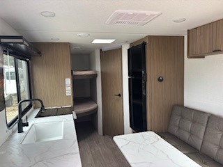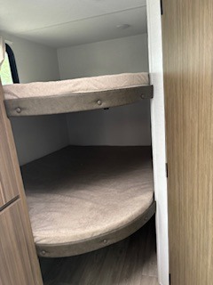 Camping is made easy in this travel trailer with more sleeping space and lots of comforts! The kids or your guests will enjoy the double-size bunks in the back, along with the full bath close by for easy nighttime use. You'll have the front private bedroom with a custom king bed all to yourselves, and there are dual bedroom wardrobes to keep your space neat and clean. Everyone can meet in the combined kitchen and living room to relax on the super U-lounge with a removable table while the chef of your group makes breakfast on the two-burner cooktop. There is also a microwave oven for quick meals, plus a pantry and refrigerator for food storage!