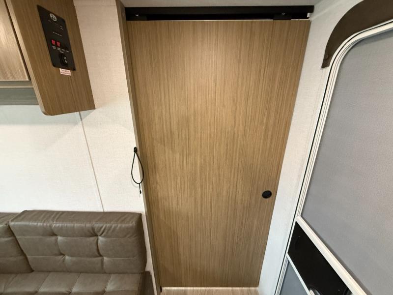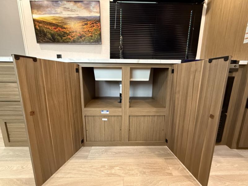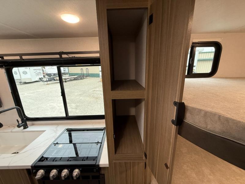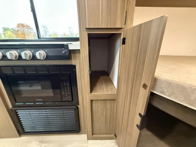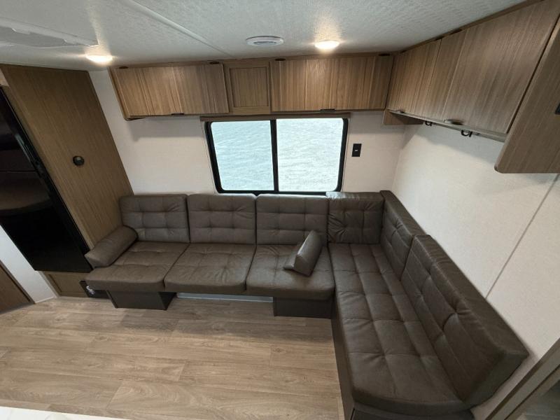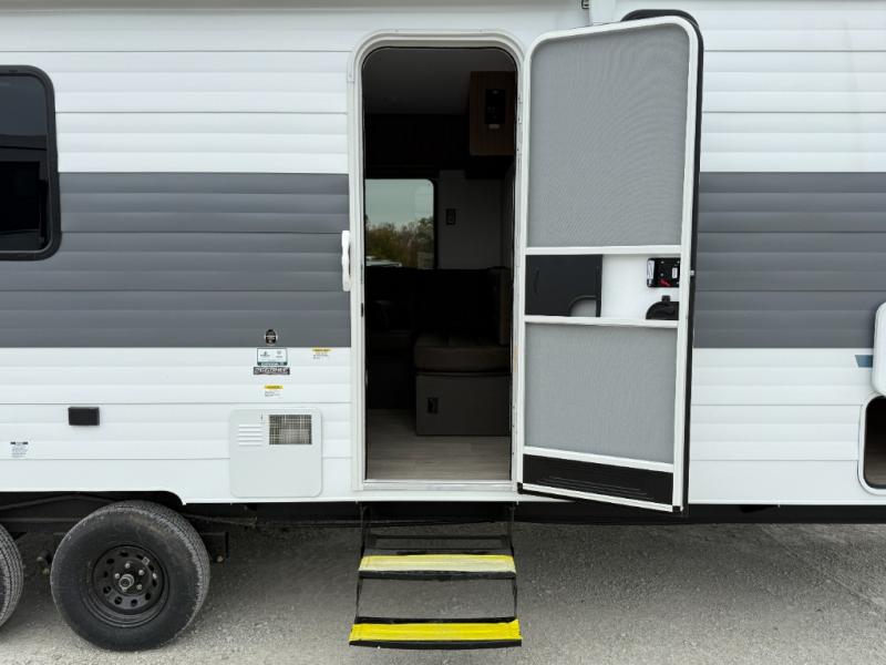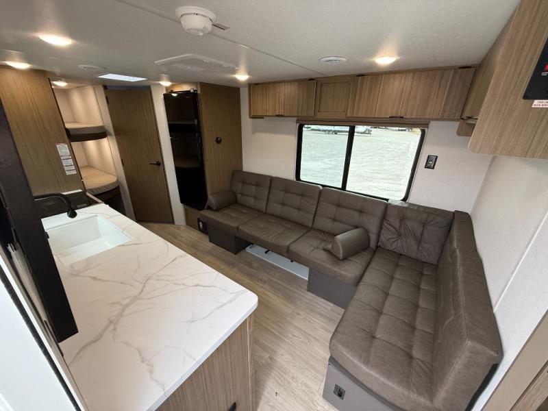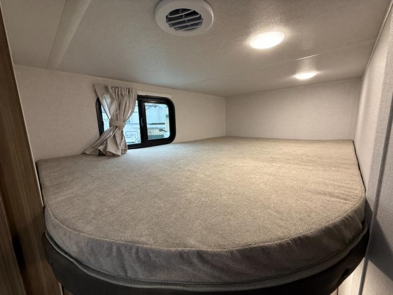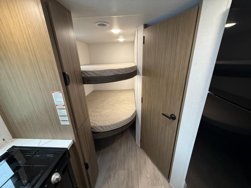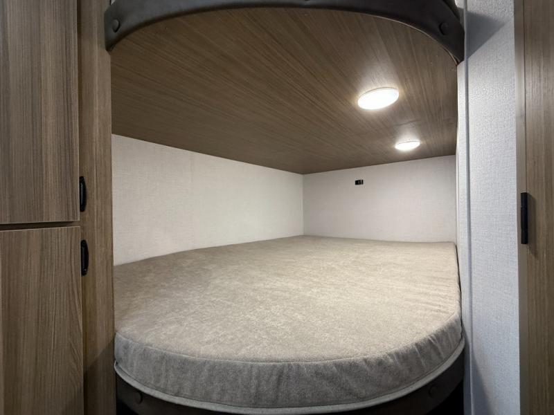 Camping is made easy in this travel trailer with more sleeping space and lots of comforts! The kids or your guests will enjoy the double-size bunks in the back, along with the full bath close by for easy nighttime use. You'll have the front private bedroom with a custom king bed all to yourselves, and there are dual bedroom wardrobes to keep your space neat and clean. Everyone can meet in the combined kitchen and living room to relax on the super U-lounge with a removable table while the chef of your group makes breakfast on the two-burner cooktop. There is also a microwave oven for quick meals, plus a pantry and refrigerator for food storage!