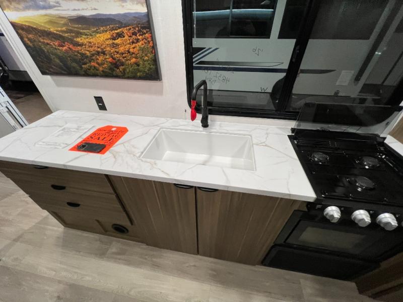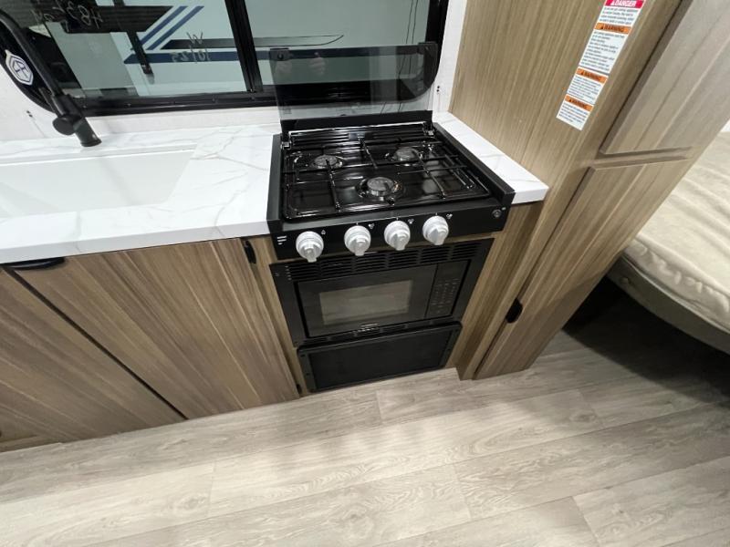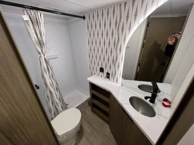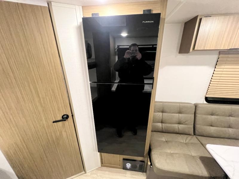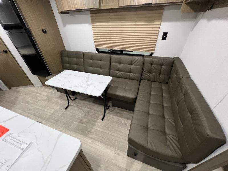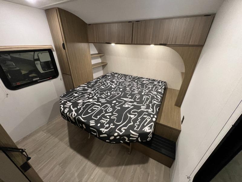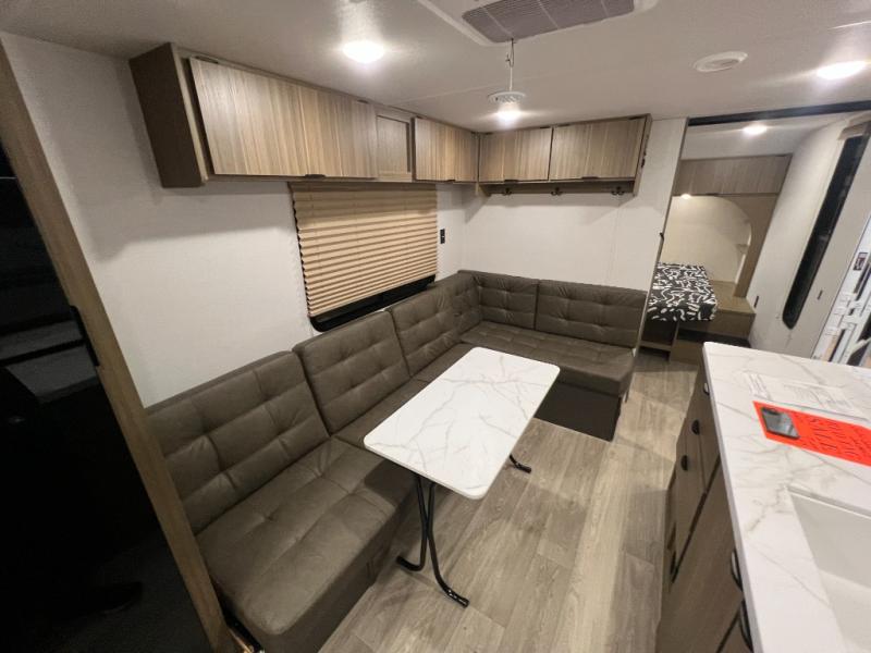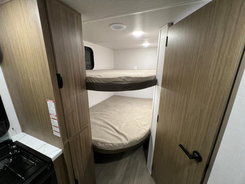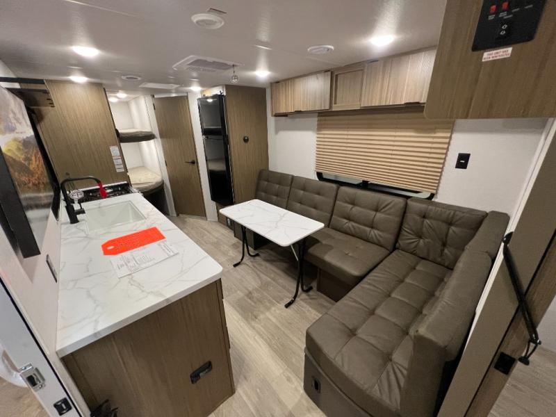 Camping is made easy in this travel trailer with more sleeping space and lots of comforts! The kids or your guests will enjoy the double-size bunks in the back, along with the full bath close by for easy nighttime use. You'll have the front private bedroom with a custom king bed all to yourselves, and there are dual bedroom wardrobes to keep your space neat and clean. Everyone can meet in the combined kitchen and living room to relax on the super U-lounge with a removable table while the chef of your group makes breakfast on the two-burner cooktop. There is also a microwave oven for quick meals, plus a pantry and refrigerator for food storage!