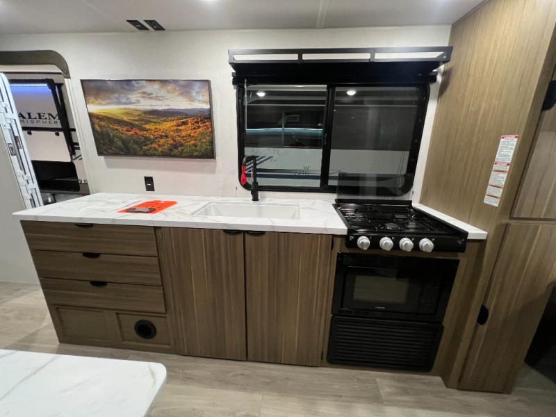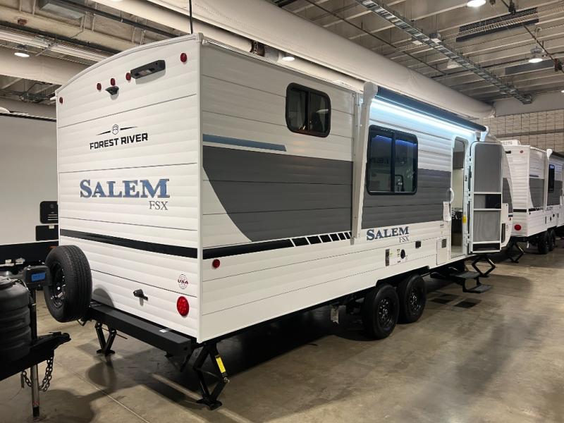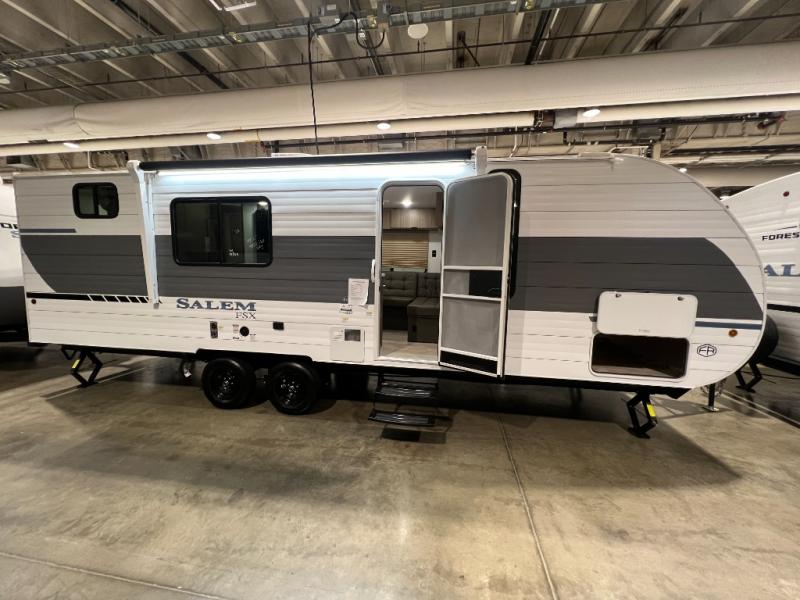 The Forest River Salem FSX travel trailers and toy hauler travel trailers are ultra comfortable and lightweight, perfect for first time or seasoned campers alike! You will love how easy it will be to relax with residential features that will make your space feel just like home, and the durable construction means you can enjoy your RV for years to come. There are a wide variety of floorplans to choose from, including couple's trailers, bunk models, and toy haulers, all with full bath and kitchen amenities and plenty of storage for all your gear!