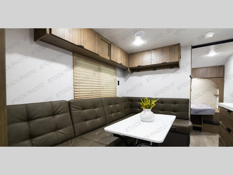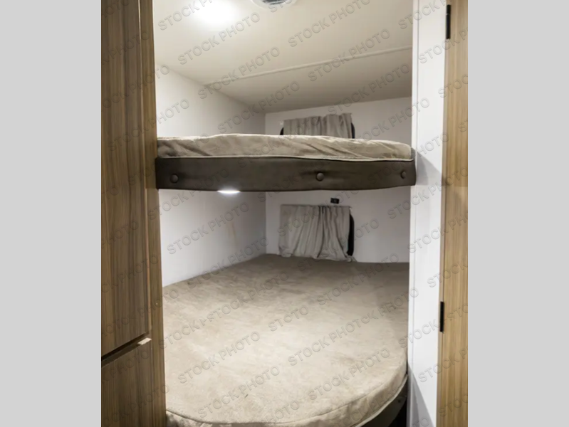 Camping is made easy in this travel trailer with more sleeping space and lots of comforts! The kids or your guests will enjoy the double-size bunks in the back, along with the full bath close by for easy nighttime use. You'll have the front private bedroom with a custom king bed all to yourselves, and there are dual bedroom wardrobes to keep your space neat and clean. Everyone can meet in the combined kitchen and living room to relax on the super U-lounge with a removable table while the chef of your group makes breakfast on the two-burner cooktop. There is also a microwave oven for quick meals, plus a pantry and refrigerator for food storage!