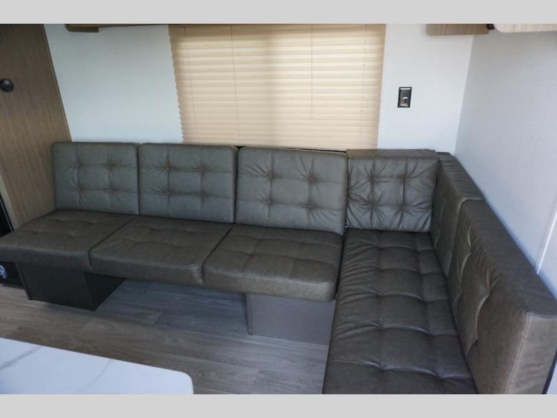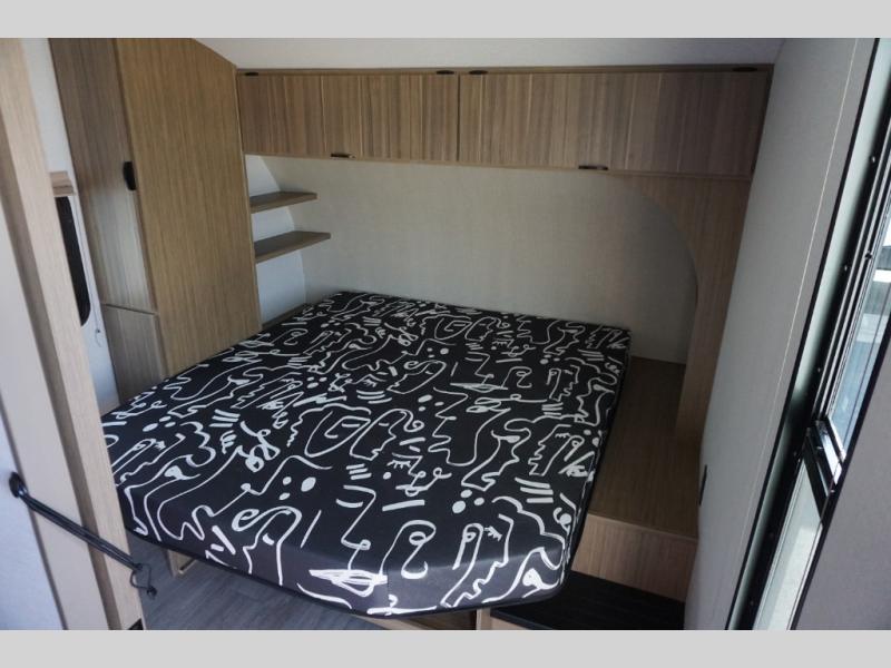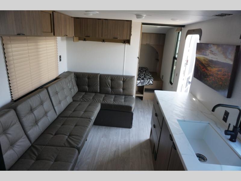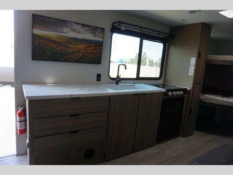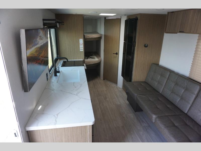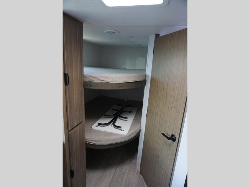 Camping is made easy in this travel trailer with more sleeping space and lots of comforts! The kids or your guests will enjoy the double-size bunks in the back, along with the full bath close by for easy nighttime use. You'll have the front private bedroom with a custom king bed all to yourselves, and there are dual bedroom wardrobes to keep your space neat and clean. Everyone can meet in the combined kitchen and living room to relax on the super U-lounge with a removable table while the chef of your group makes breakfast on the two-burner cooktop. There is also a microwave oven for quick meals, plus a pantry and refrigerator for food storage!