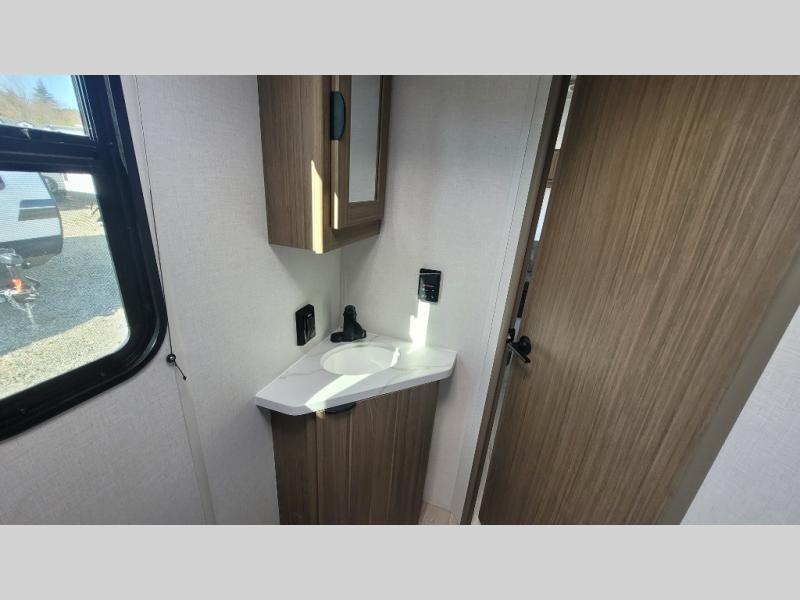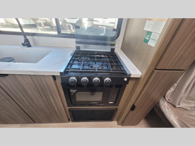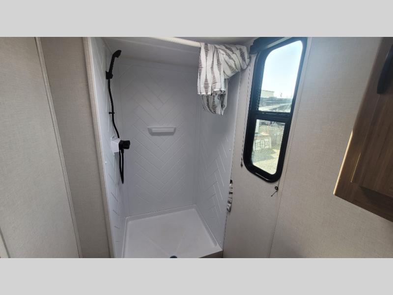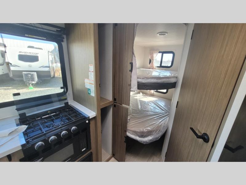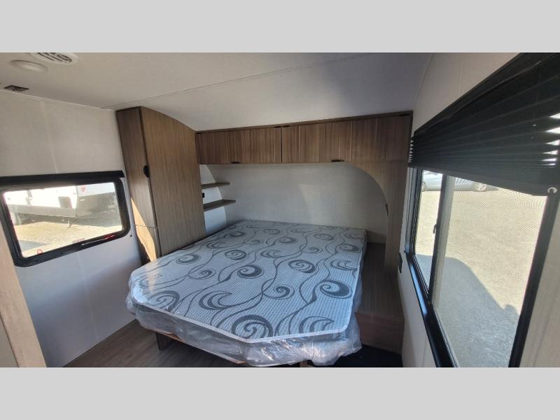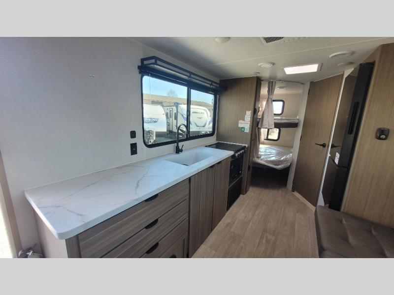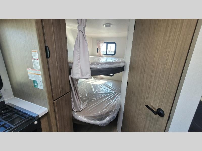 Camping is made easy in this travel trailer with more sleeping space and lots of comforts! The kids or your guests will enjoy the double-size bunks in the back, along with the full bath close by for easy nighttime use. You'll have the front private bedroom with a custom king bed all to yourselves, and there are dual bedroom wardrobes to keep your space neat and clean. Everyone can meet in the combined kitchen and living room to relax on the super U-lounge with a removable table while the chef of your group makes breakfast on the two-burner cooktop. There is also a microwave oven for quick meals, plus a pantry and refrigerator for food storage!