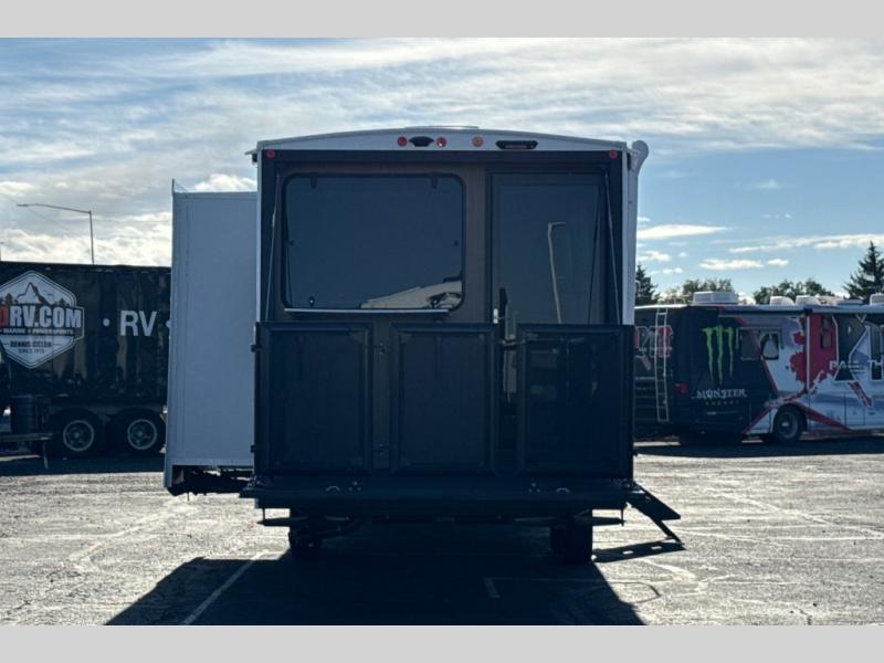 This versatile cargo trailer is one to remember! There is a ramp door that converts to a patio, a large slide out for more interior space, plus a front private bedroom just like at home. Your crew can relax on the super lounge across from the entertainment center or head outdoors to visit under the awning. The chef of your group will love cooking in the kitchen with ample counter space, including a bar top with two stools. There is also a kitchen bar window that will allow the cook to visit with those sitting on the patio, and if you need to bring bicycles along, you can easily load them in through the ramp door!