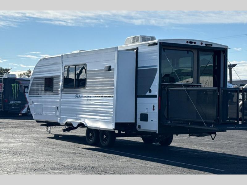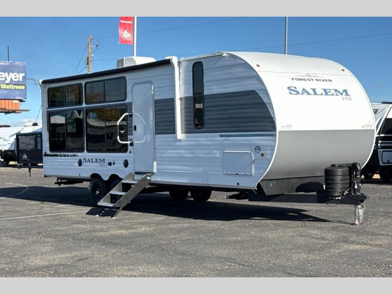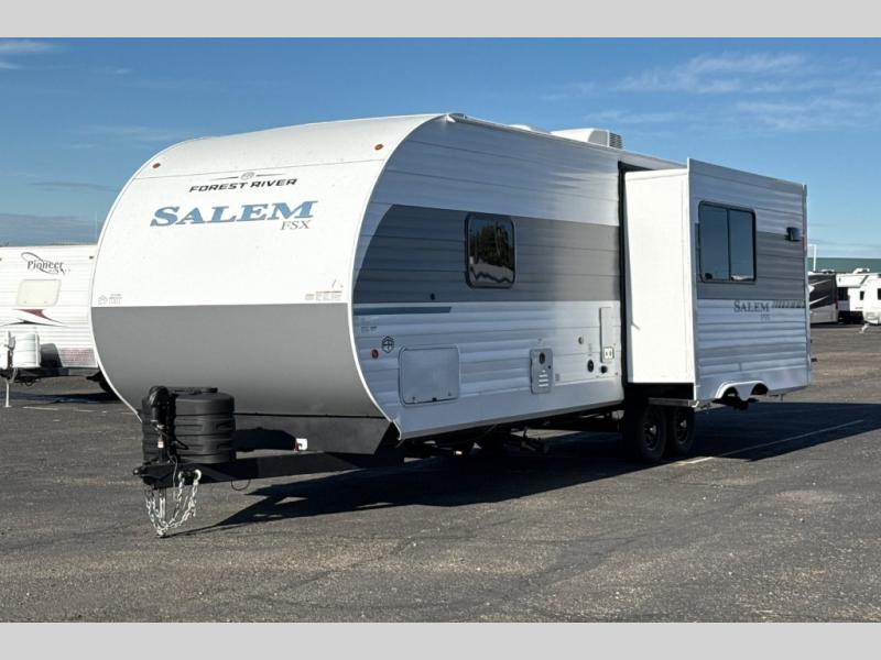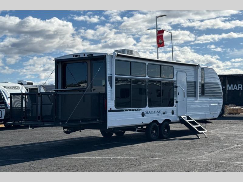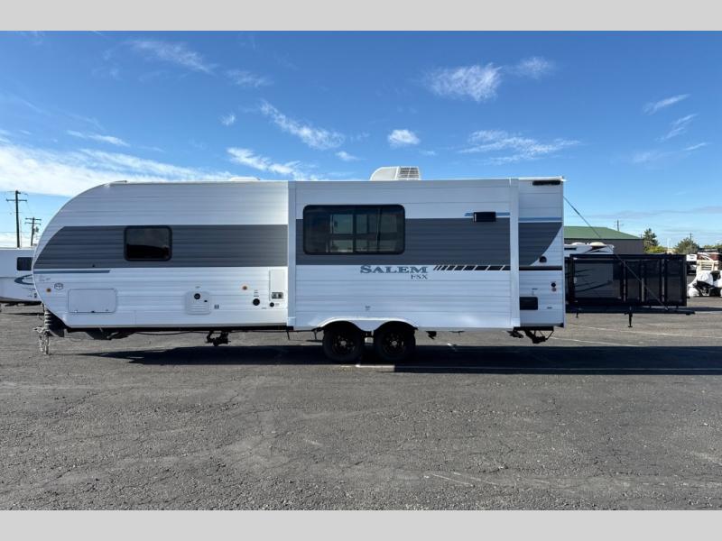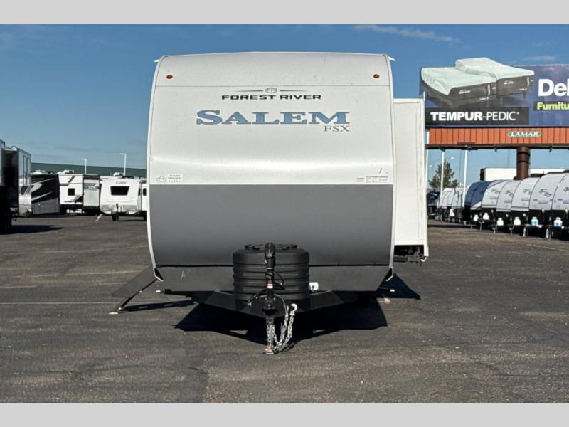 The Forest River Salem FSX travel trailers and toy hauler travel trailers are ultra comfortable and lightweight, perfect for first time or seasoned campers alike! You will love how easy it will be to relax with residential features that will make your space feel just like home, and the durable construction means you can enjoy your RV for years to come. There are a wide variety of floorplans to choose from, including couple's trailers, bunk models, and toy haulers, all with full bath and kitchen amenities and plenty of storage for all your gear!