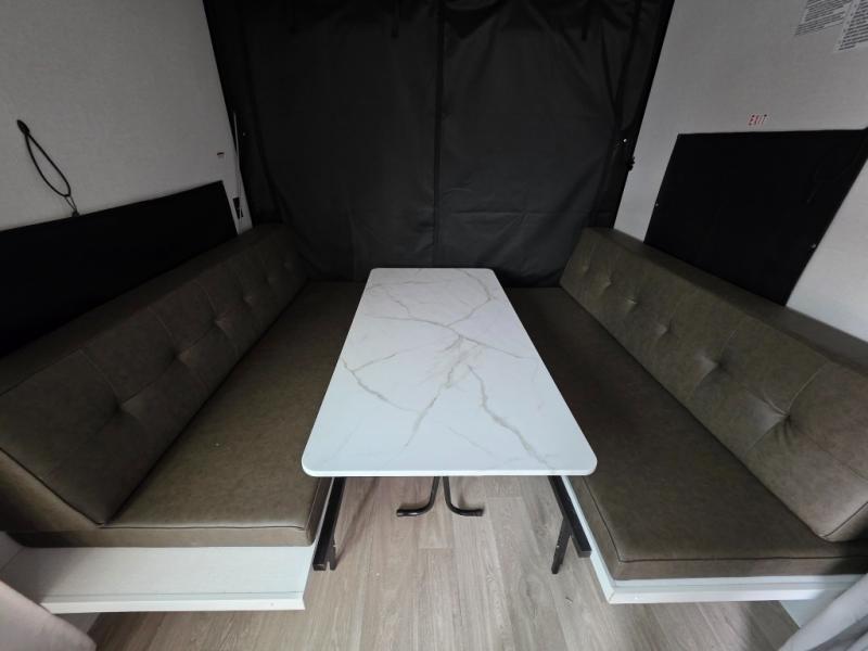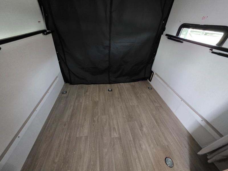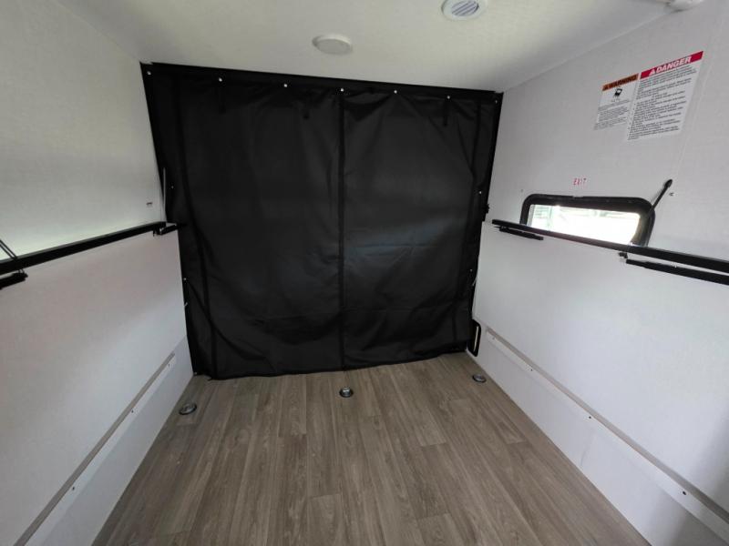Make the most of your vacations with this MAX toy hauler! The 14' garage area includes dual sofa sleepers with a table in between to dine at, plus a 3,000 lb. capacity ramp door for easy unloading. Enjoy the fireplace for a cozy evening indoors while your dinner is cooking on the three-burner cooktop or being heated up in the convection microwave. After a fun day of trail riding, you can clean the mud out of your hair with the 30" x 36" shower in the full bathroom. The front private bedroom has a custom king bed to lay your head on at night, a closet, and wardrobes on either side of the bed for even more clothing storage space.
