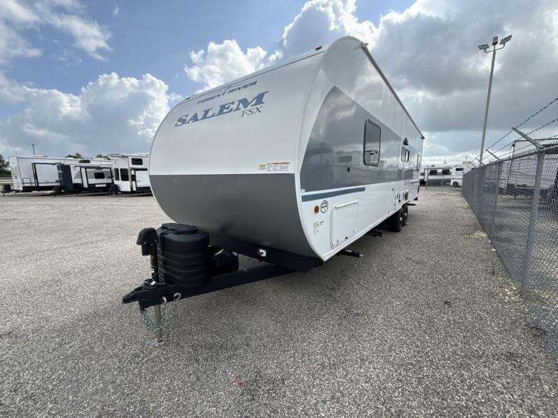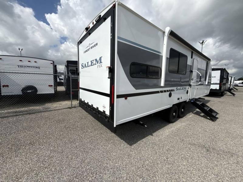 The Forest River Salem FSX travel trailers and toy hauler travel trailers are ultra comfortable and lightweight, perfect for first time or seasoned campers alike! You will love how easy it will be to relax with residential features that will make your space feel just like home, and the durable construction and easy to maintain fiberglass exterior means you can enjoy your RV for years to come. There are a wide variety of floorplans to choose from, including couple's trailers, bunk models, and toy haulers, all with full bath and kitchen amenities and plenty of storage for all your gear!