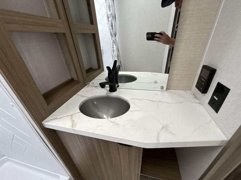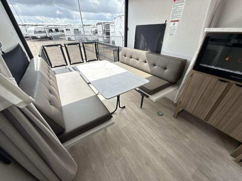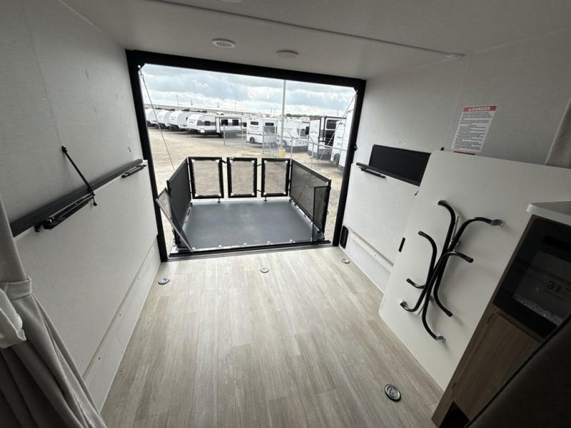 Make the most of your vacations with this Platinum version MAX toy hauler! The 14' garage area includes dual sofa sleepers with a table in between to dine at, plus a 3,000 lb. ramp door for easy unloading. Enjoy the fireplace for a cozy evening indoors while your dinner is cooking on the three burner cooktop or being heated up in the microwave. After a fun day of trail riding, you can clean the mud out of your hair with the 30" x 36" shower with a skylight in the full bathroom. The front private bedroom has a king bed to lay your head on at night, shoe storage under the bed, a walk-in closet, and wardrobes on either side of the bed for even more clothing storage space.