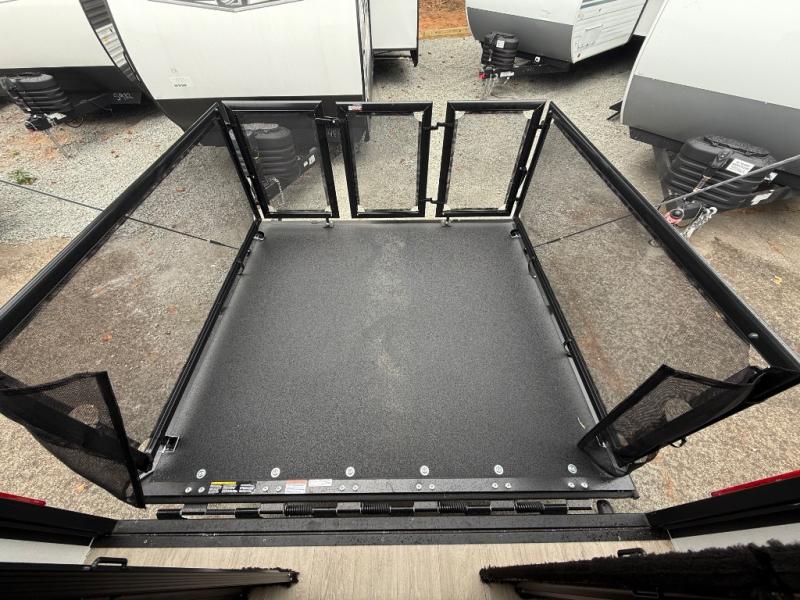 It will be so easy to enjoy camping trips in this spacious versatile cargo trailer for two! The ramp door can convert to a patio with a 1,500 lb. capacity to entertain guest. The main living area is made cozy thanks to the chaise lounge and theater seating directly across from the TV and movie projector with premium sound. The chef of your group will love the large island peninsula for more prep space plus the entire unit is carpet free for easy cleaning. And don't overlook the front private bedroom with a king bed plus a full bath close by to freshen up! This model can also be designed to fit optional toys in if needed; see dealer for more details.