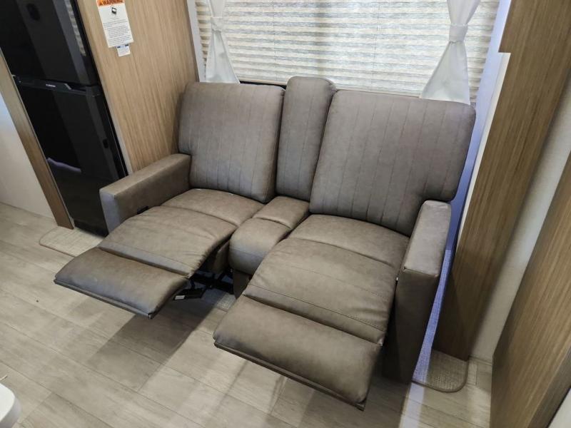 You can bring along your favorite ride-on toys in this MAX platinum toy hauler with a 12' 6" separate garage! Your guests will enjoy two flip-out sofas, a free-standing table, plus one of the dual entry doors here for convenience. Head to the main living area/kitchen to find reclining theater seats with direct TV viewing, a bar with stools, plus plenty of counter space to prep meals. The front private bedroom includes a king bed for a great night's rest, plus dual wardrobes to keep your clothes wrinkle-free. Head outdoors to find a 21' power awning with LED lights and an outside kitchen!