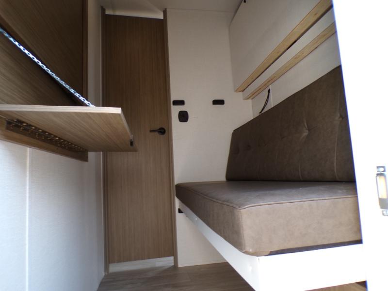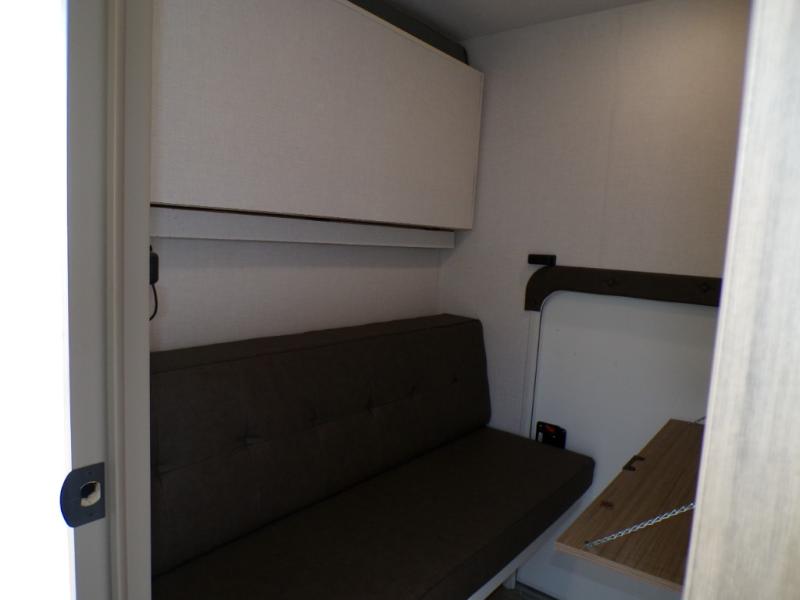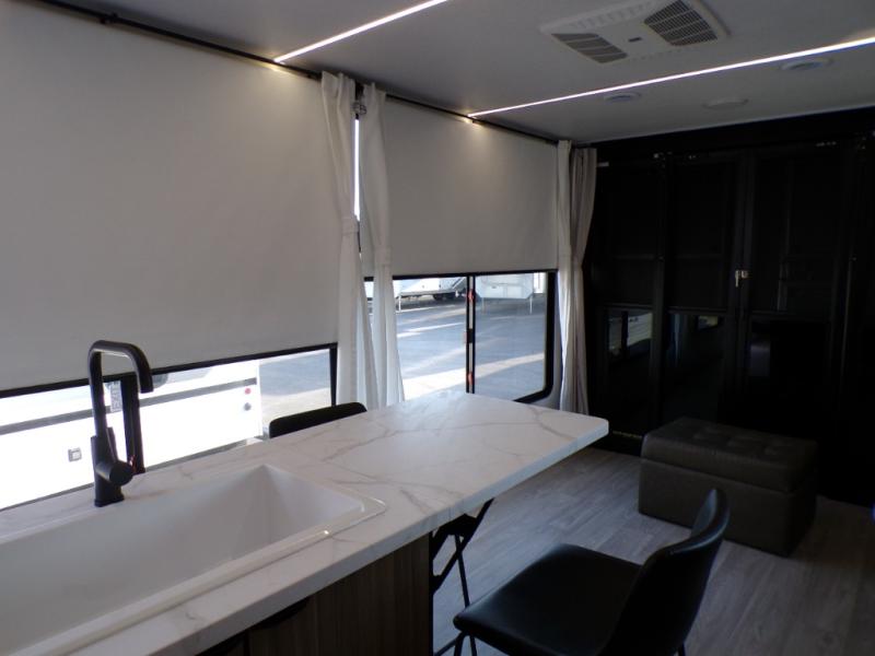 There is a lot to love about this versatile cargo trailer! Starting with the 1,500 lb. patio with a three seasons door that leads into the main living area. The large slide out here features theater seating with a chaise lounge, a dual swinging 12V refrigerator, and cooktop. The kitchen also has a hutch and island with sink and flip-up countertop. You even have a movie theater projector with premium sound to watch your favorite movies in style. The set of bunk beds have their own privacy and a bike door for outside access. Everyone can freshen up with the large shower in the full bathroom. The front private bedroom has a king bed, wardrobes on either side of the bed, and another wardrobe to keep your clothes looking their best! This unit can be designed with optional space to carry larger toys if needed; see dealer for more details.