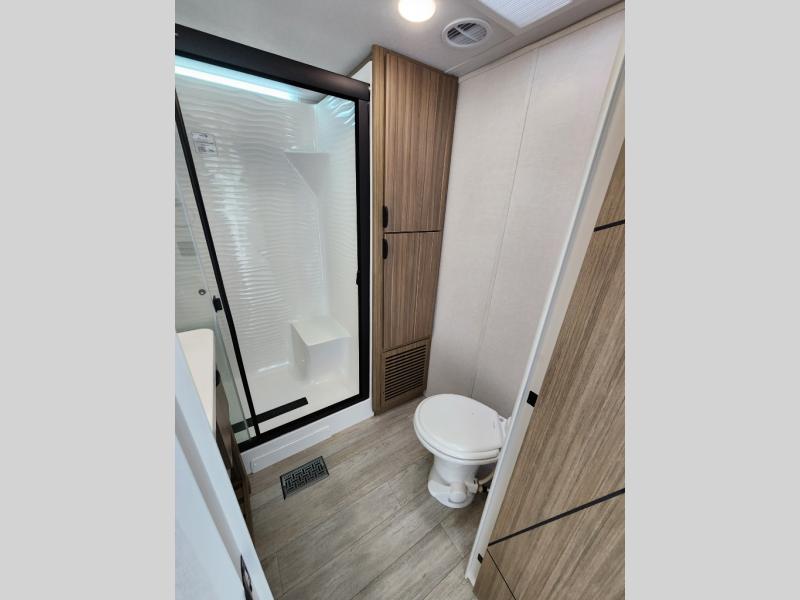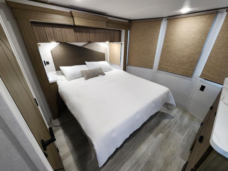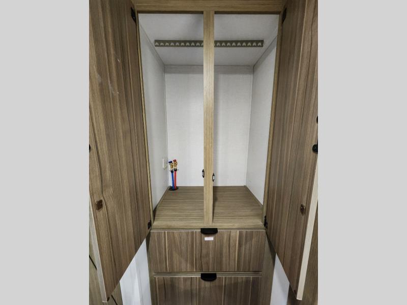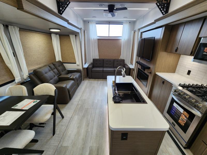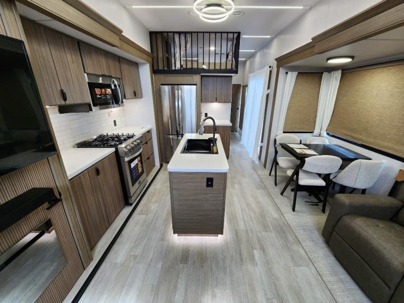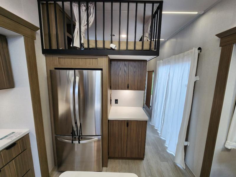 With a double loft in this destination trailer, everyone can join in on the fun! The kids will love having their own space with the two loft areas, one with two 42" x 74" bunk mats and storage area and the other with one 42" x 74" bunk mat and storage area. Plus, you will also have your own privacy with the front private bedroom which features a king bed with Versa-Tilt, front windows for plenty of sunlight to shine through, one of the entry doors, and a closet with optional washer and dryer prep. The full bathroom has a walk-in shower with a seat so everyone can stay clean and refreshed. The kitchen island will not only make your meal prep easier, but also your clean up with the Versa-Sink!