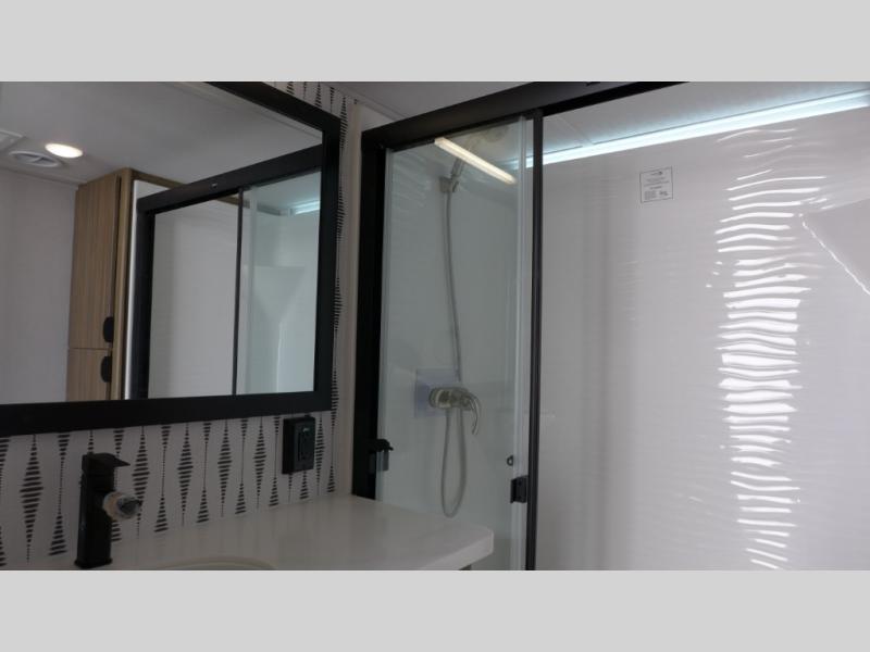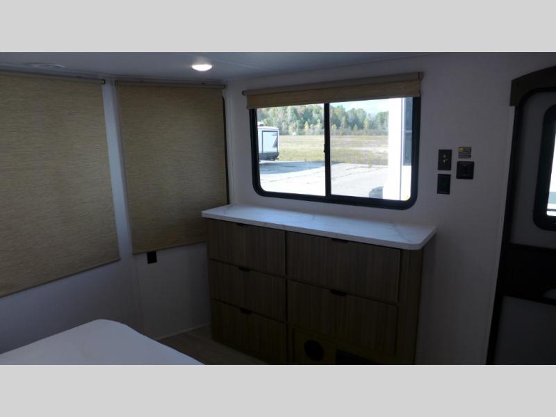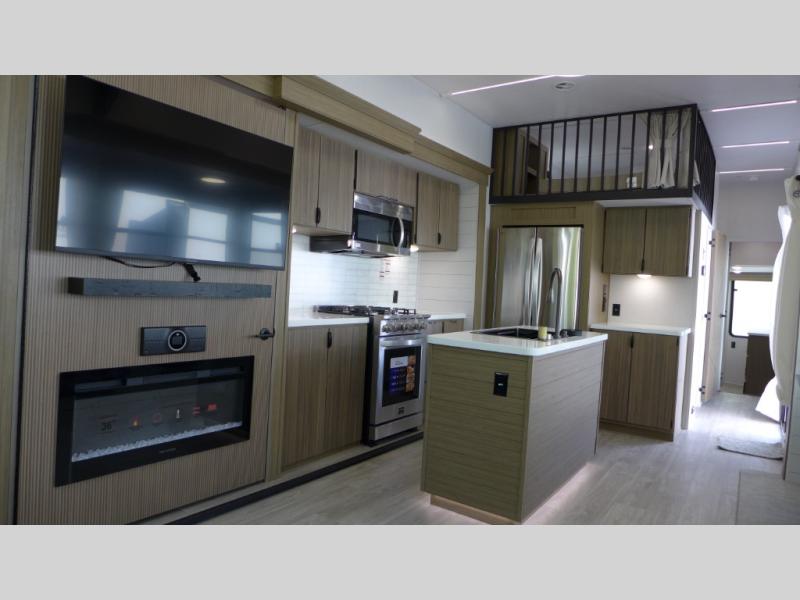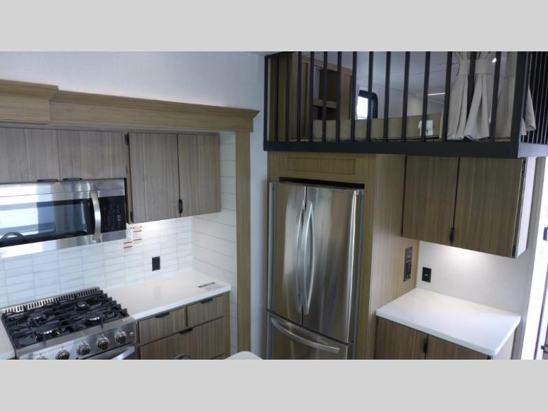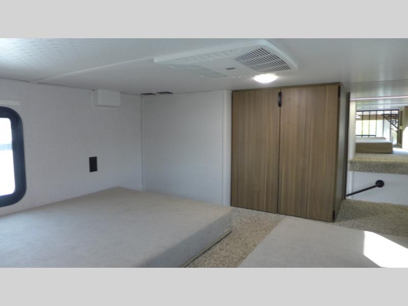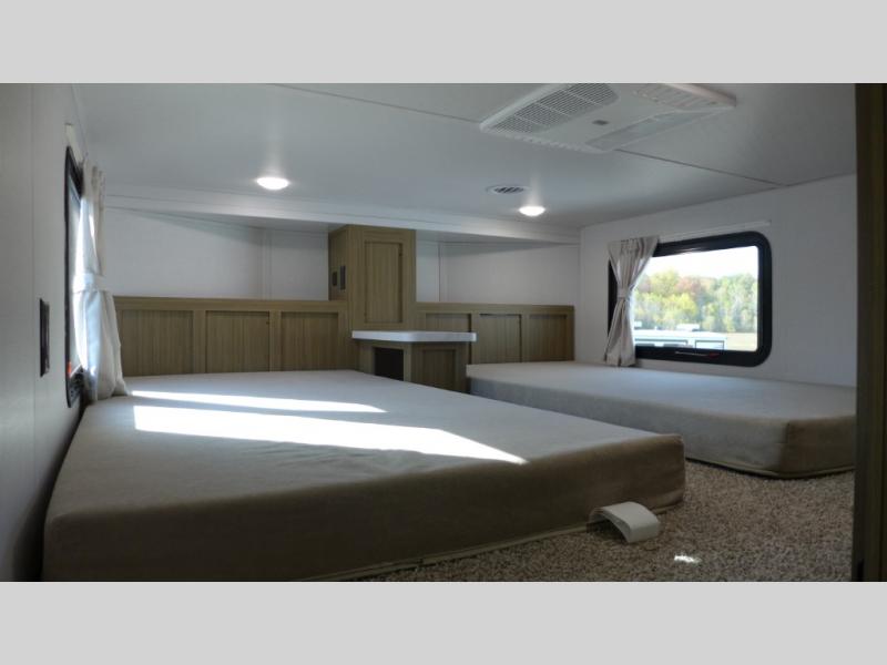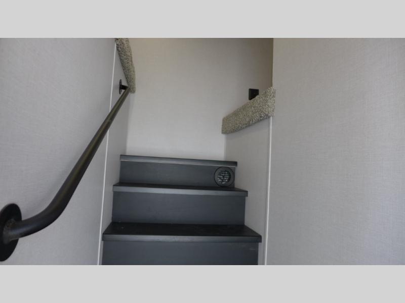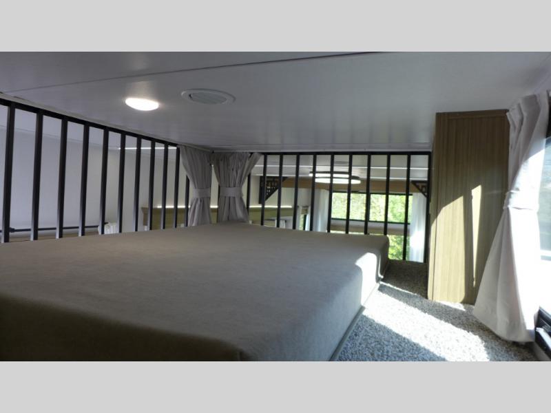 With a double loft in this destination trailer, everyone can join in on the fun! The kids will love having their own space with the two loft areas, one with two 42" x 74" bunk mats and storage area and the other with one 42" x 74" bunk mat and storage area. Plus, you will also have your own privacy with the front private bedroom which features a king bed with Versa-Tilt, front windows for plenty of sunlight to shine through, one of the entry doors, and a closet with optional washer and dryer prep. The full bathroom has a walk-in shower with a seat so everyone can stay clean and refreshed. The kitchen island will not only make your meal prep easier, but also your clean up with the Versa-Sink!