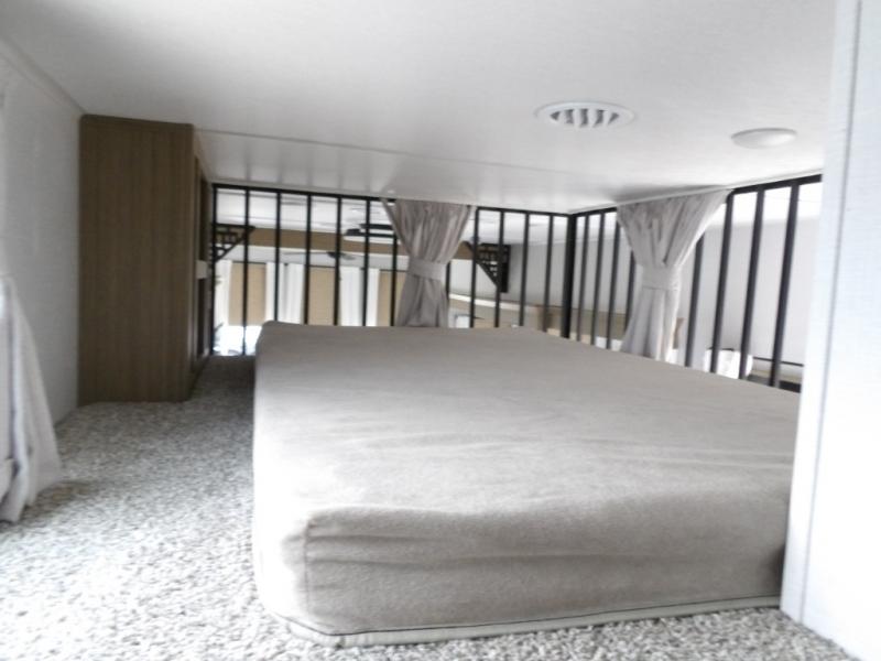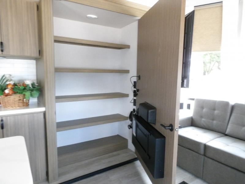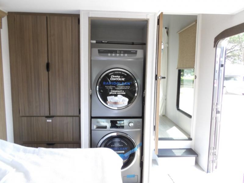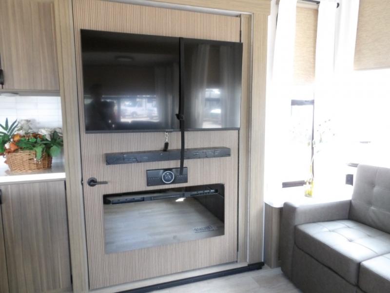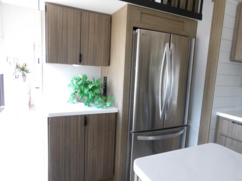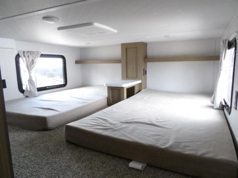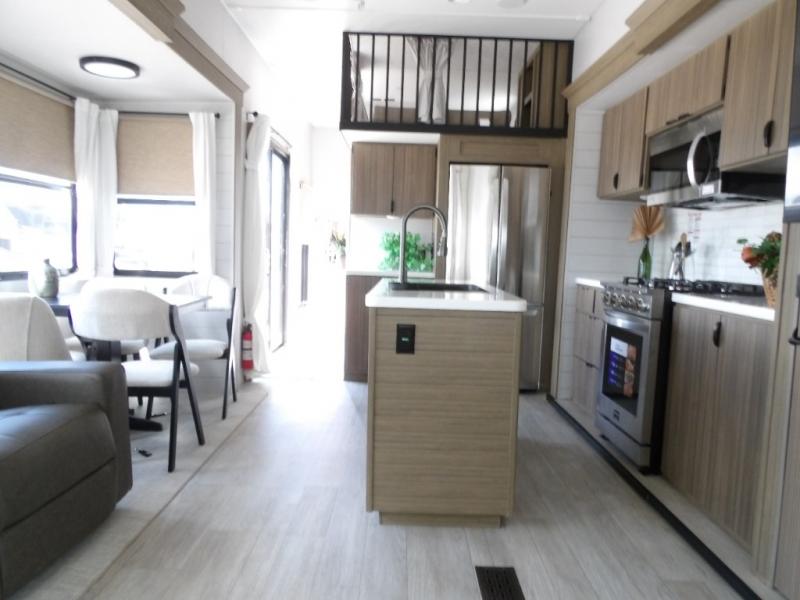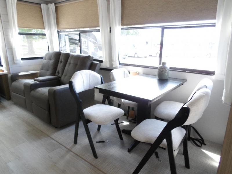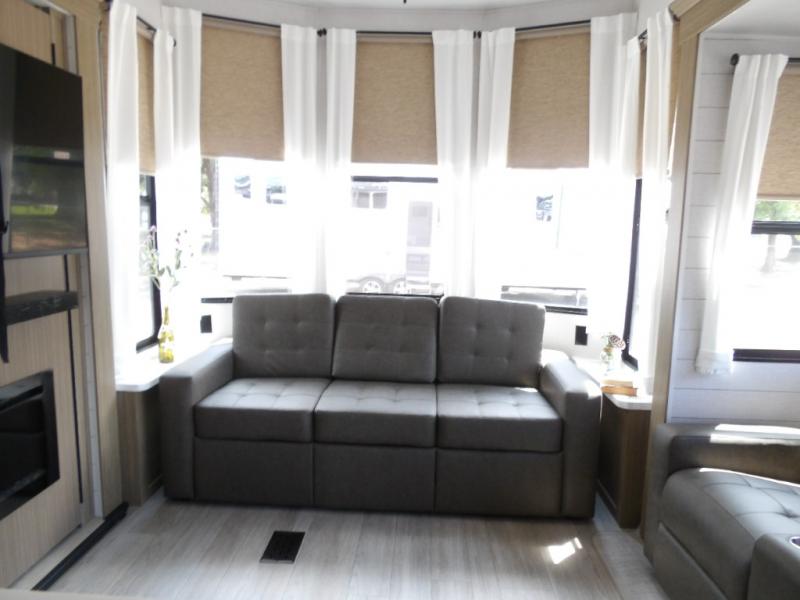 The grandkids will be begging to come along with you on your next getaway in this destination trailer! It features a double loft with three 42" x 74" bunk mats in total above the rear private bedroom. Inside the bedroom, you will find a king bed with Versa-Tilt slide and overhead cabinets, and a closet with optional washer/dryer prep if you want. The walk-in shower with a seat will make it easy for everyone to stay fresh and clean as well. The living and kitchen area feature a kitchen island, a free standing dinette to enjoy meals and play games at, a front sofa, and theater seating across from the entertainment center with a fireplace for those crisp evenings!