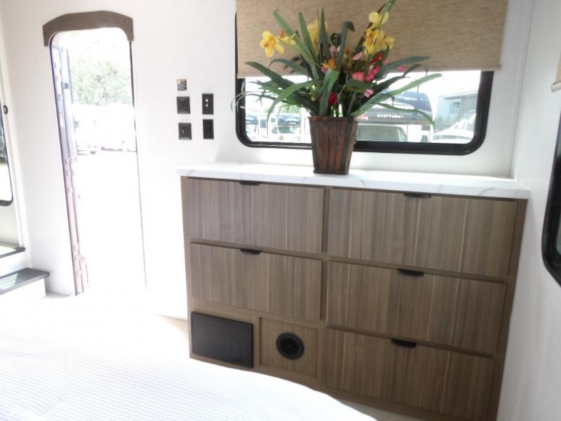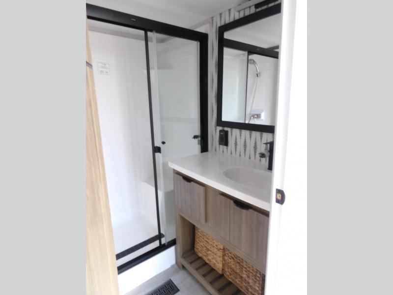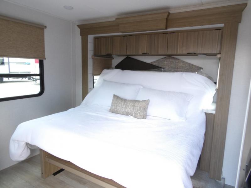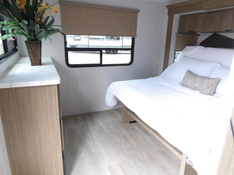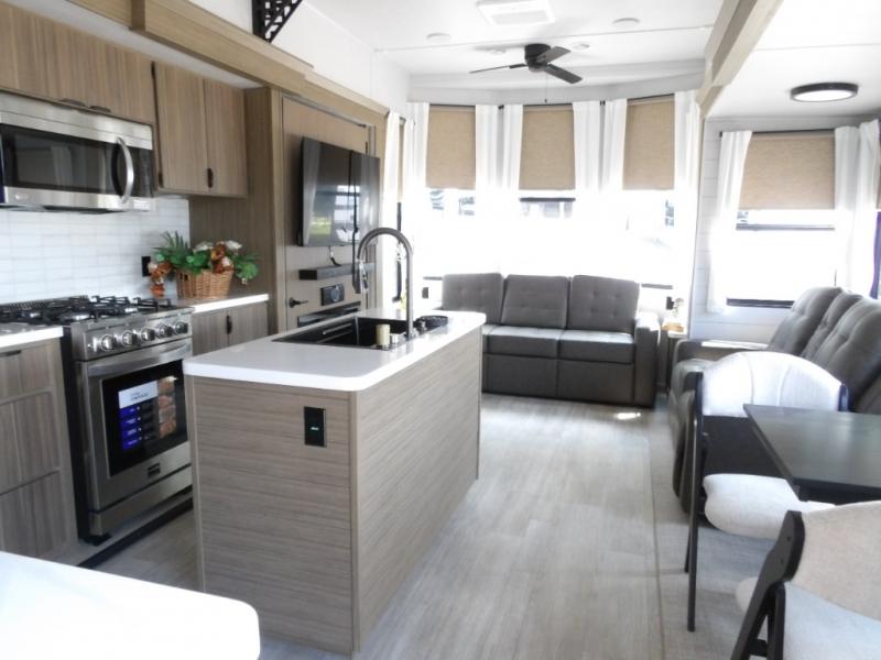 With any Salem Grand Villa destination trailer by Forest River, you can call home wherever you park it! There is a heated and enclosed Accessibelly for added protection, LED "Blade Lighting" under the awning, Lippert On-The-Go ladder prep, plus many more exterior conveniences. Elegant curtain rods and curtains will have you feeling right at home, along with stainless steel kitchen appliances, stylish roller shades, and enhanced floating shelves for added storage. Each model includes heavy duty cabinet hinges for safety and durability, a 60k on-demand tankless water heater for endless hot showers, a JBL 3-Zone media center, plus available options to further customize your trailer.