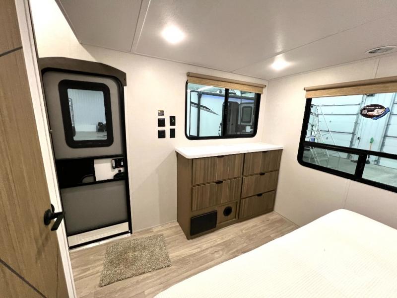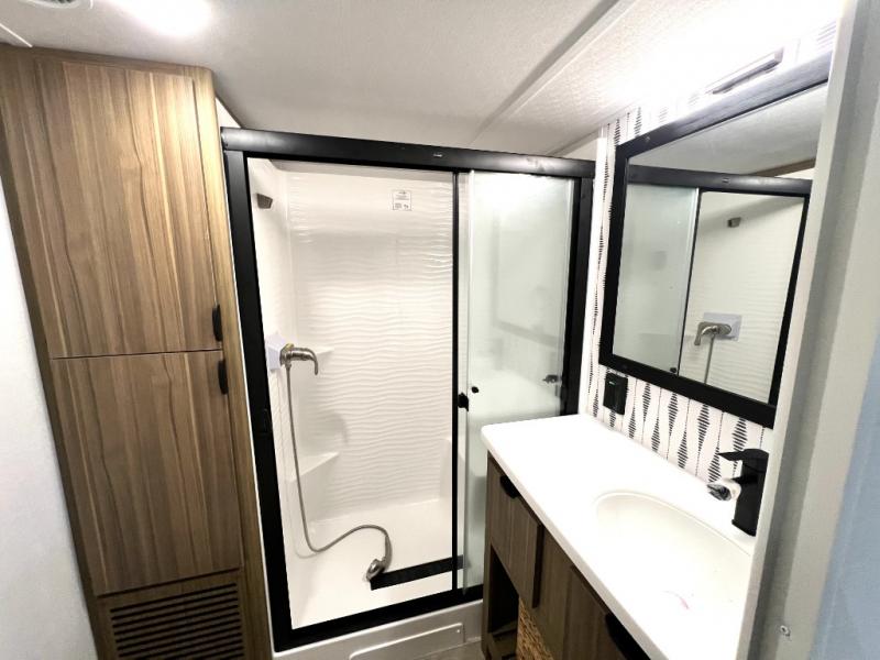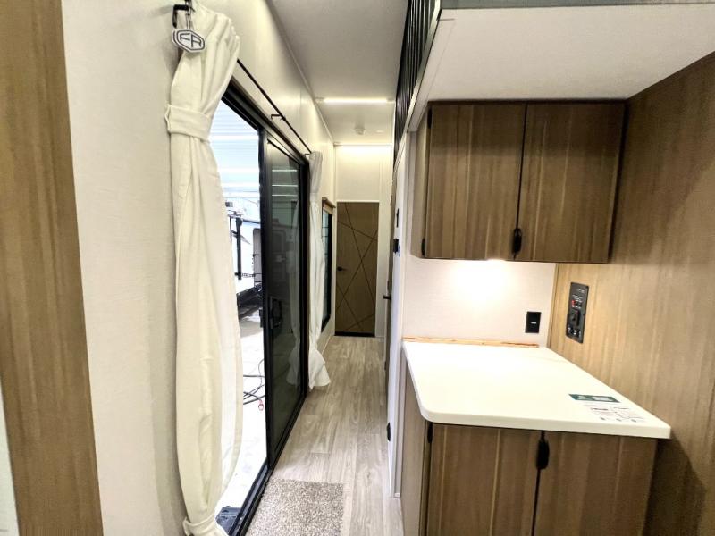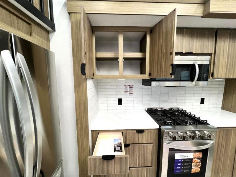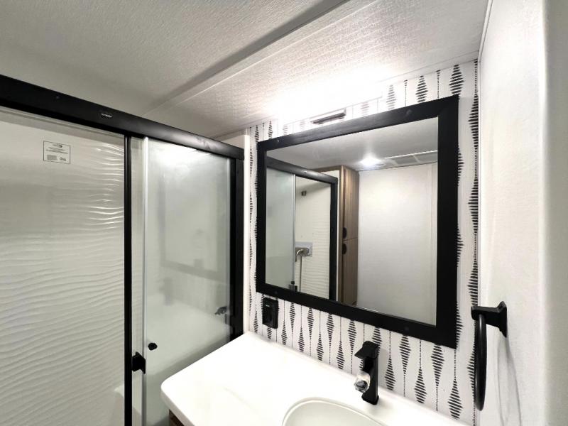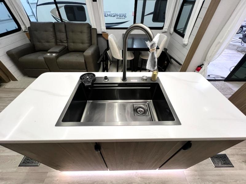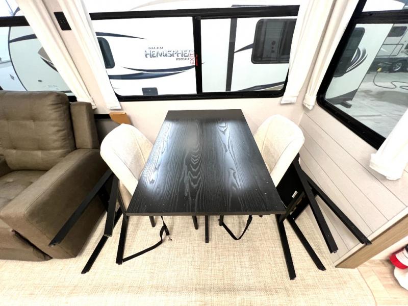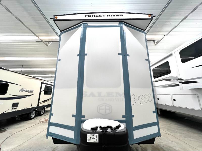 With any Salem Grand Villa destination trailer by Forest River, you can call home wherever you park it! There is a heated and enclosed Accessibelly for added protection, LED "Blade Lighting" under the awning, Lippert On-The-Go ladder prep, plus many more exterior conveniences. Elegant curtain rods and curtains will have you feeling right at home, along with stainless steel kitchen appliances, stylish roller shades, and enhanced floating shelves for added storage. Each model includes heavy duty cabinet hinges for safety and durability, a 60k on-demand tankless water heater for endless hot showers, a JBL 3-Zone media center, plus available options to further customize your trailer.