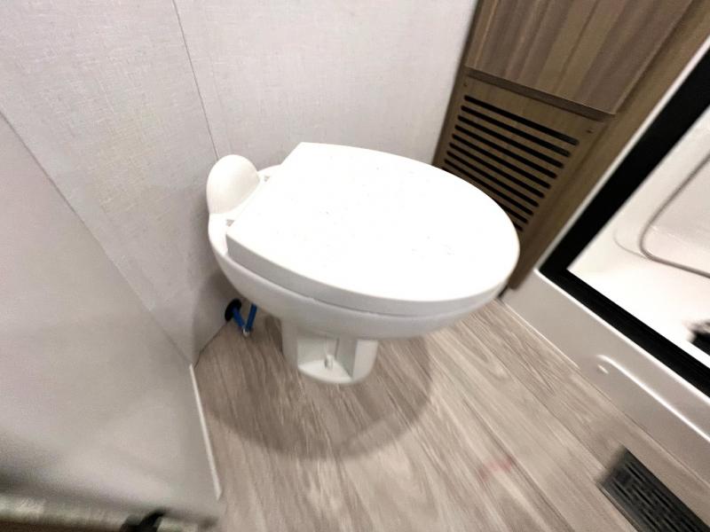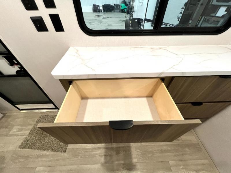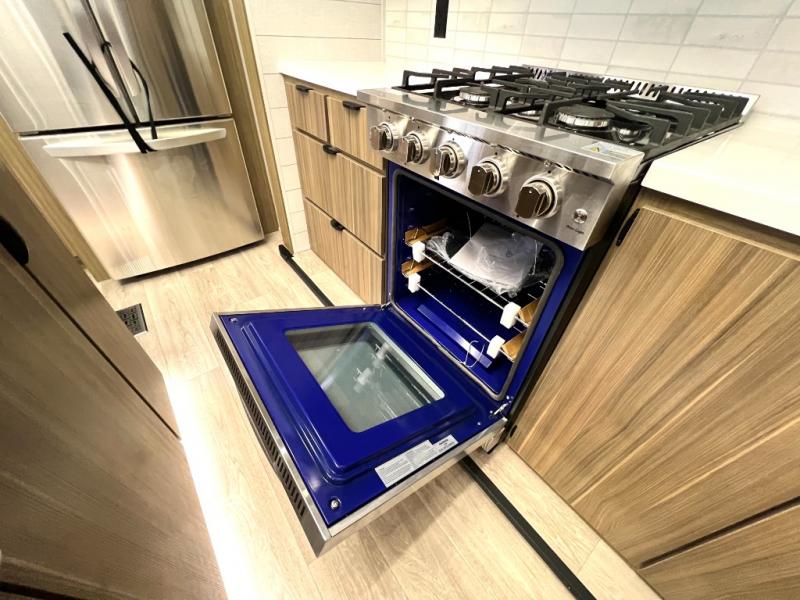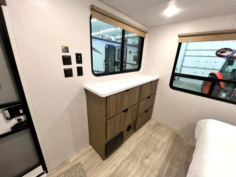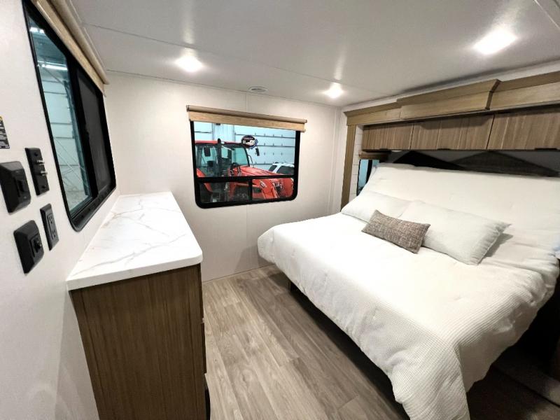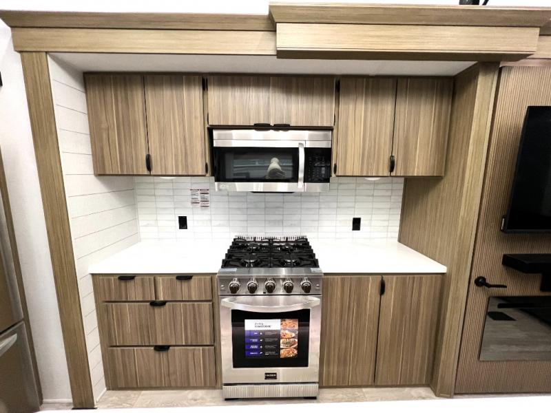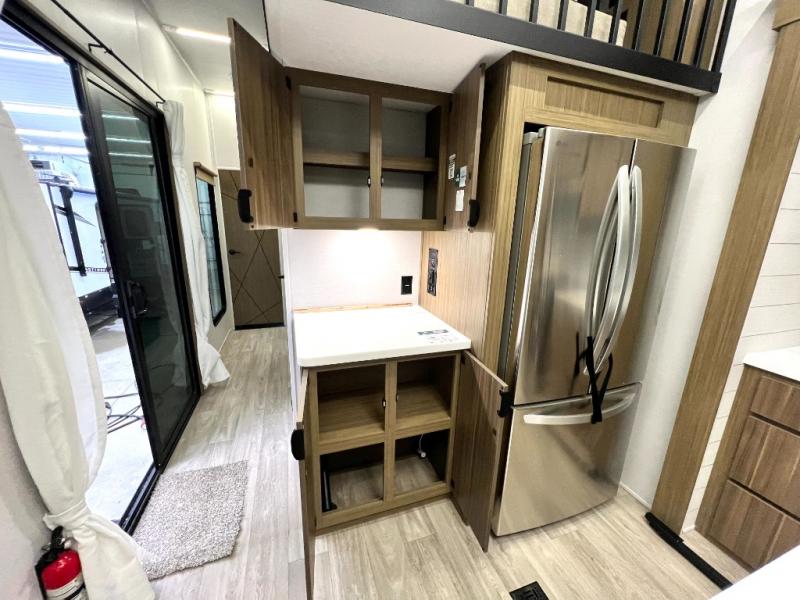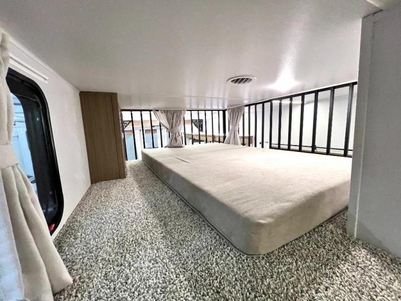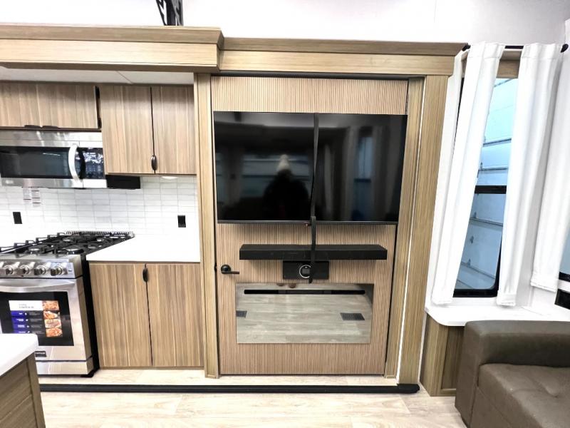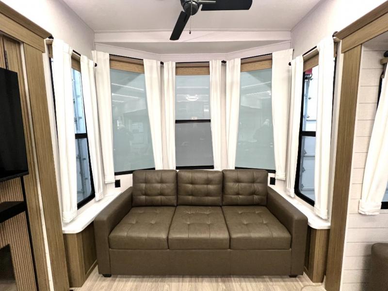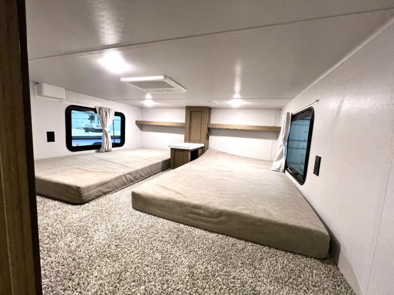 The grandkids will be begging to come along with you on your next getaway in this destination trailer! It features a double loft with three 42" x 74" bunk mats in total above the rear private bedroom. Inside the bedroom, you will find a king bed with Versa-Tilt slide and overhead cabinets, and a closet with optional washer/dryer prep if you want. The walk-in shower with a seat will make it easy for everyone to stay fresh and clean as well. The living and kitchen area feature a kitchen island, a free standing dinette to enjoy meals and play games at, a front sofa, and theater seating across from the entertainment center with a fireplace for those crisp evenings!