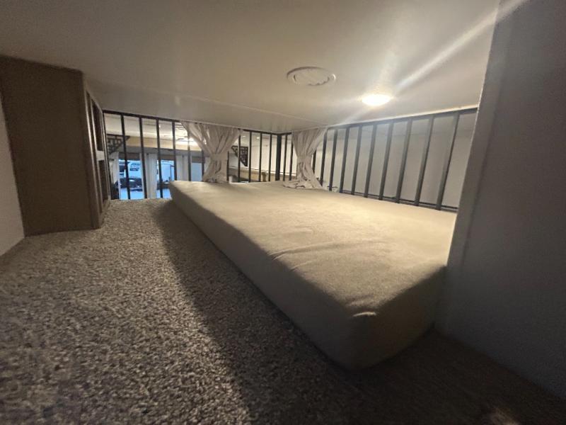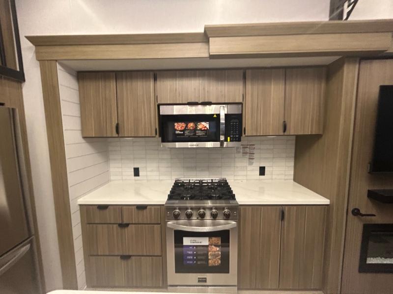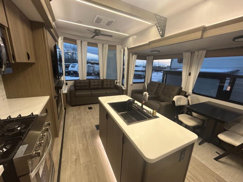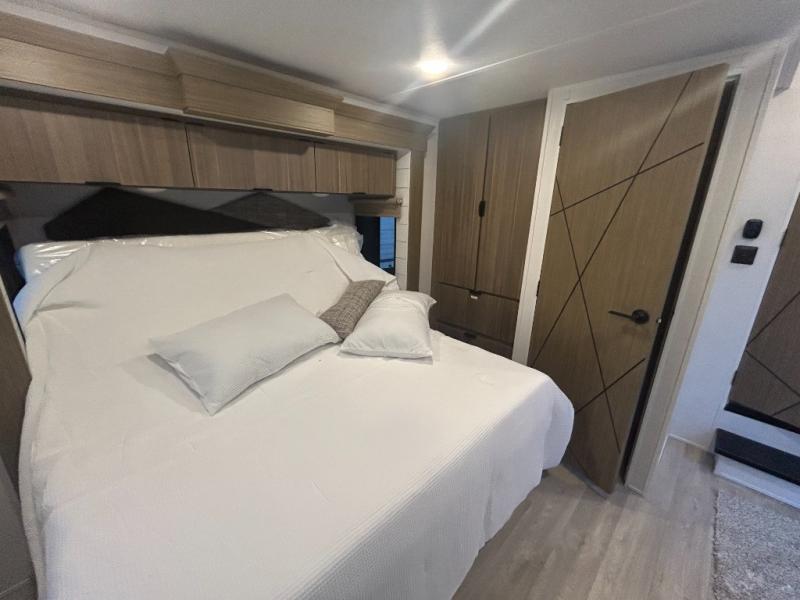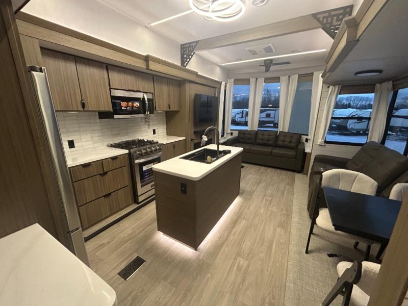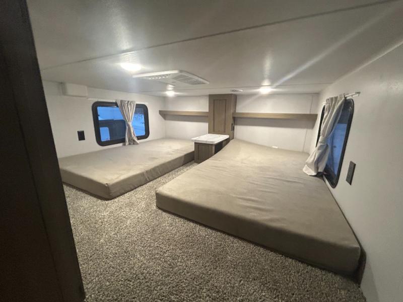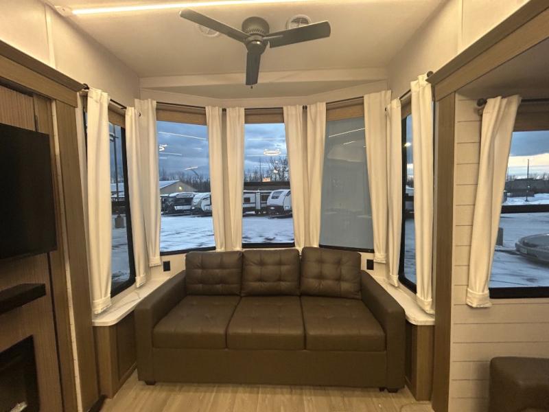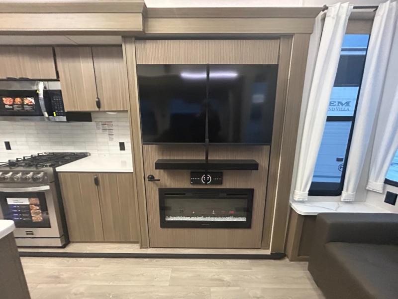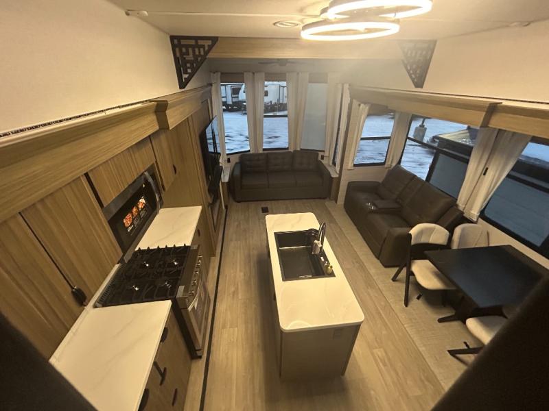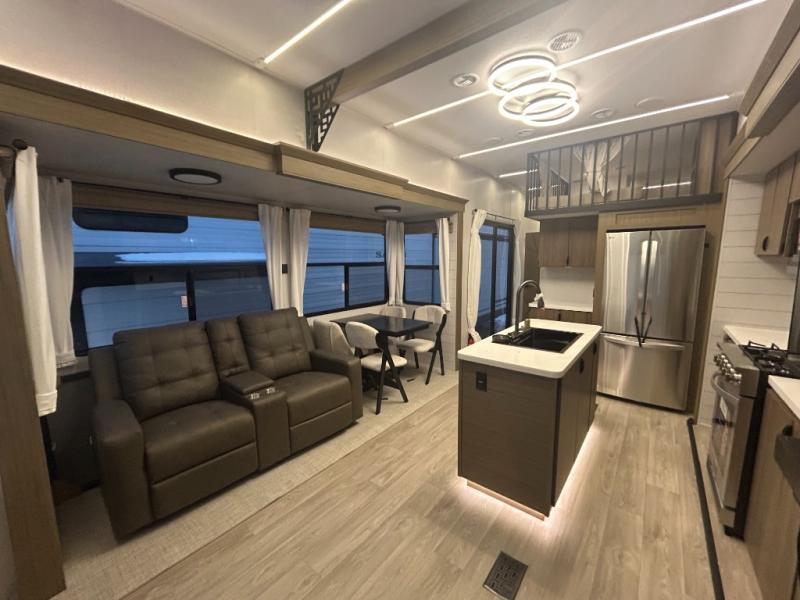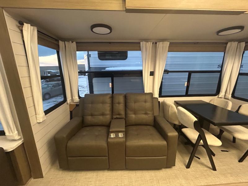 The grandkids will be begging to come along with you on your next getaway in this destination trailer! It features a double loft with three 42" x 74" bunk mats in total above the rear private bedroom. Inside the bedroom, you will find a king bed with Versa-Tilt slide and overhead cabinets, and a closet with optional washer/dryer prep if you want. The walk-in shower with a seat will make it easy for everyone to stay fresh and clean as well. The living and kitchen area feature a kitchen island, a free standing dinette to enjoy meals and play games at, a front sofa, and theater seating across from the entertainment center with a fireplace for those crisp evenings!