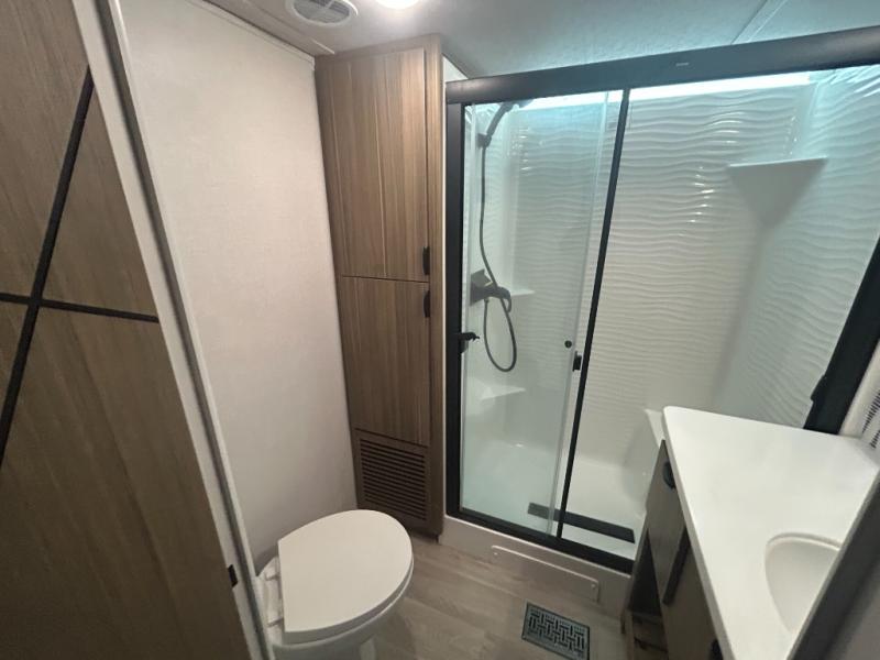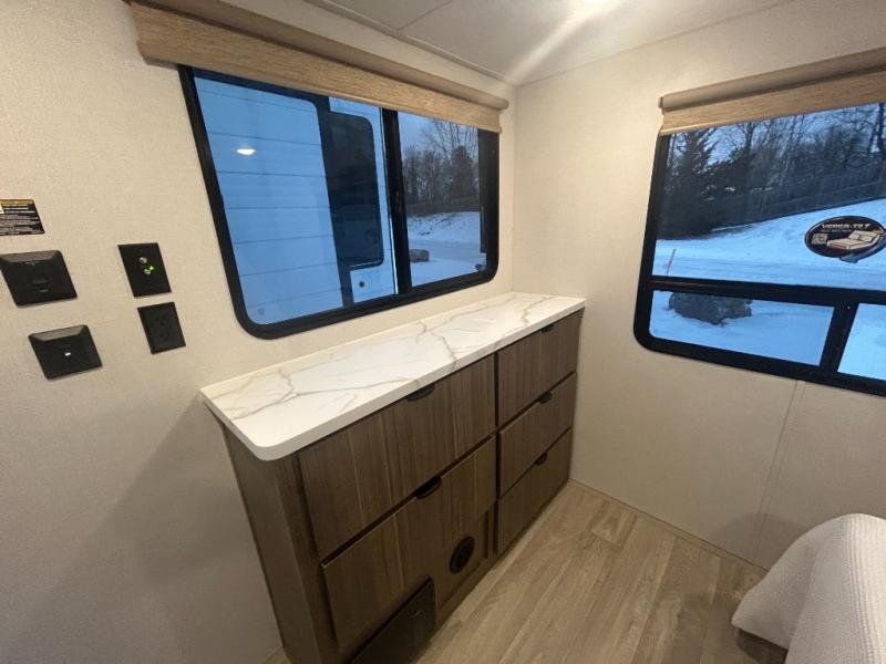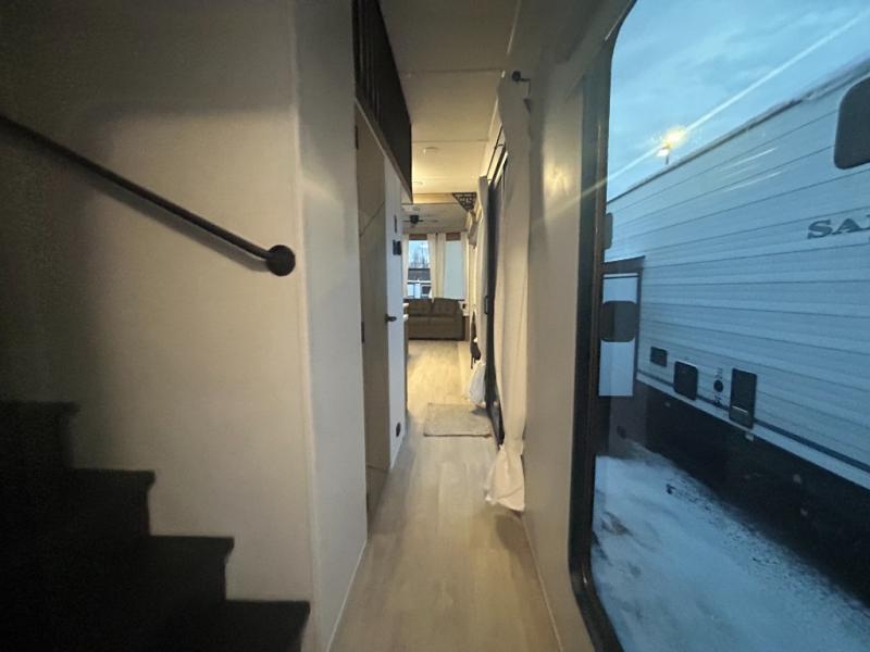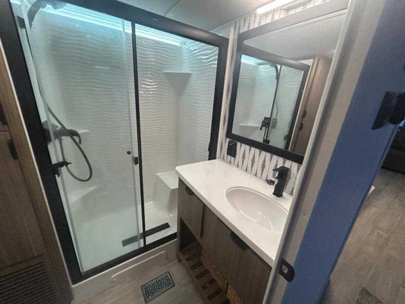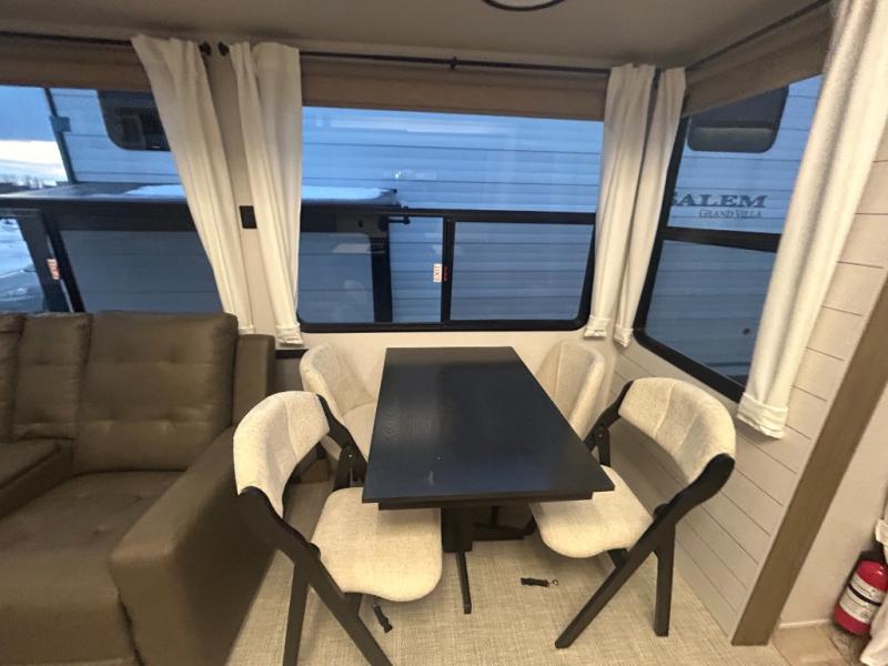 With any Salem Grand Villa destination trailer by Forest River, you can call home wherever you park it! There is a heated and enclosed Accessibelly for added protection, LED "Blade Lighting" under the awning, Lippert On-The-Go ladder prep, plus many more exterior conveniences. Elegant curtain rods and curtains will have you feeling right at home, along with stainless steel kitchen appliances, stylish roller shades, and enhanced floating shelves for added storage. Each model includes heavy duty cabinet hinges for safety and durability, a 60k on-demand tankless water heater for endless hot showers, a JBL 3-Zone media center, plus available options to further customize your trailer.