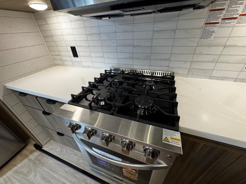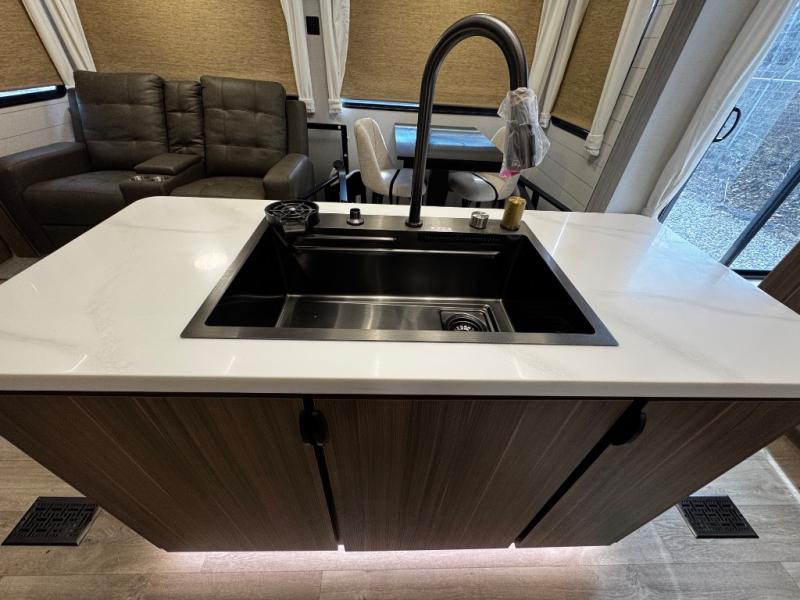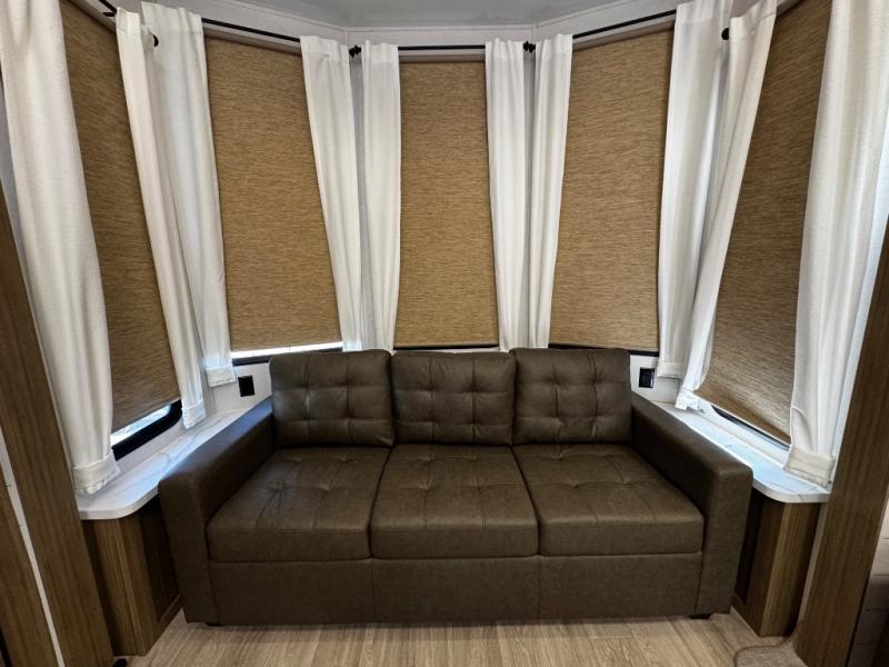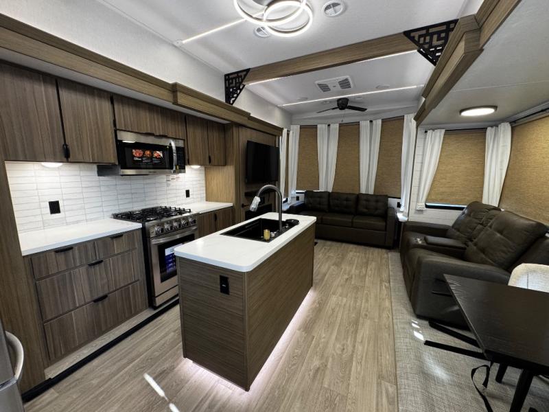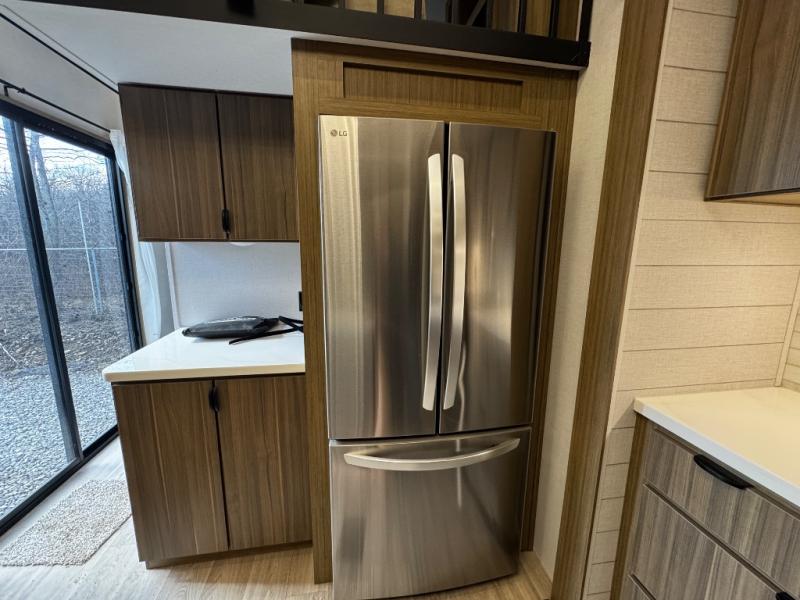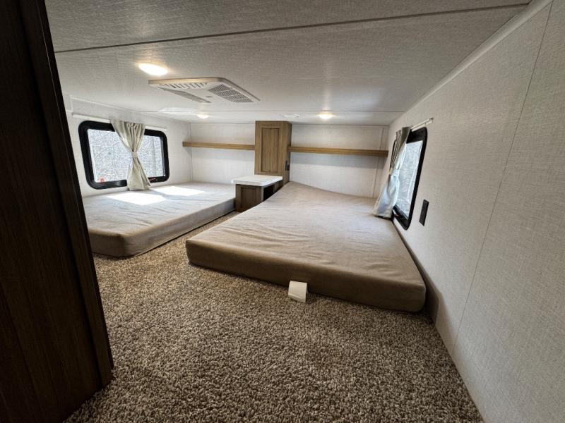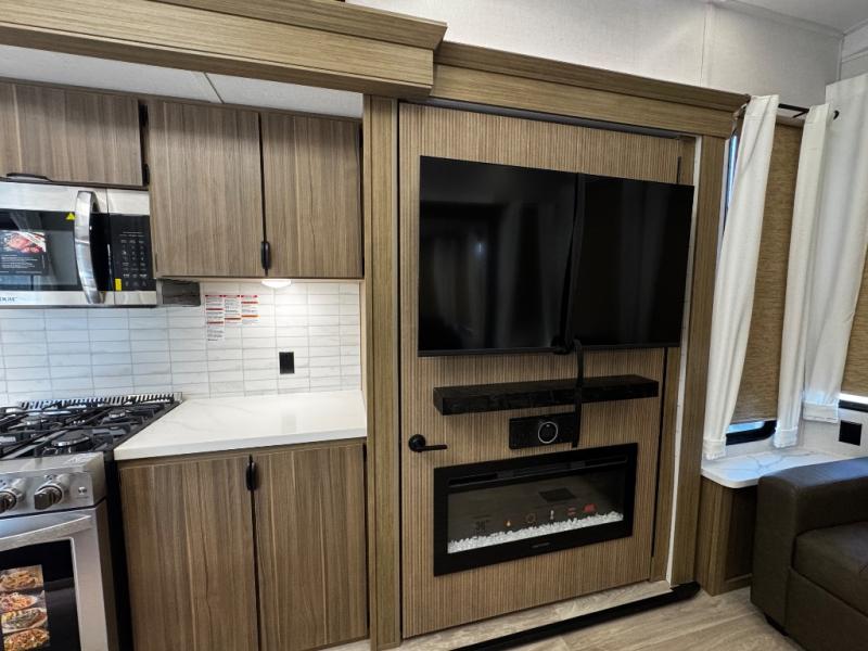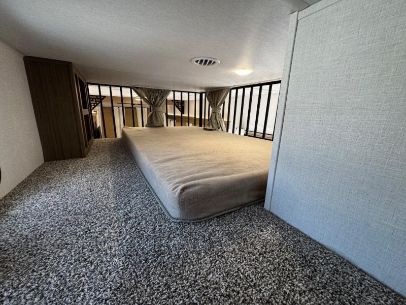The grandkids will be begging to come along with you on your next getaway in this destination trailer! It features a double loft with three 42" x 74" bunk mats in total above the rear private bedroom. Inside the bedroom, you will find a king bed with Versa-Tilt slide and overhead cabinets, and a closet with optional washer/dryer prep if you want. The walk-in shower with a seat will make it easy for everyone to stay fresh and clean as well. The living and kitchen area feature a kitchen island, a free standing dinette to enjoy meals and play games at, a front sofa, and theater seating across from the entertainment center with a fireplace for those crisp evenings!