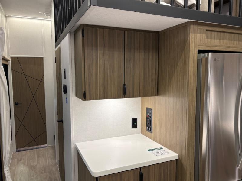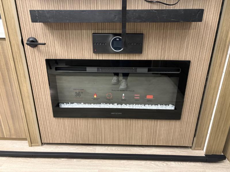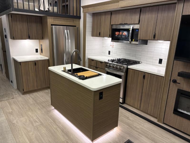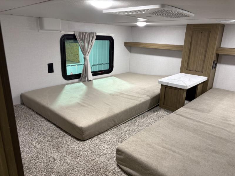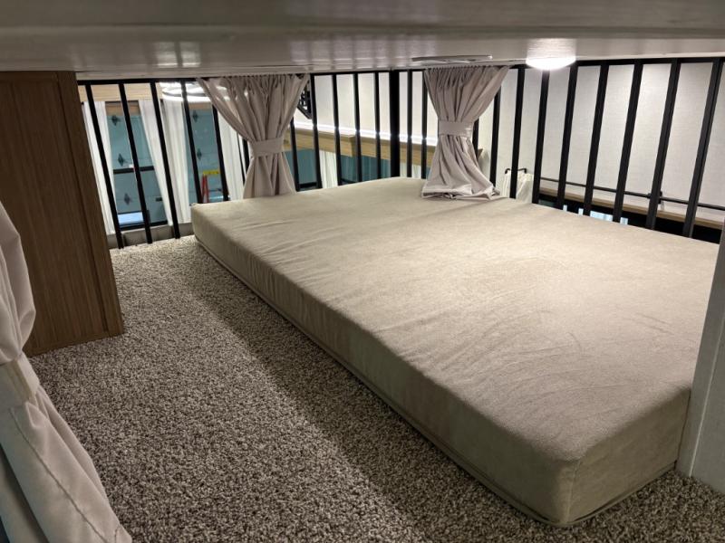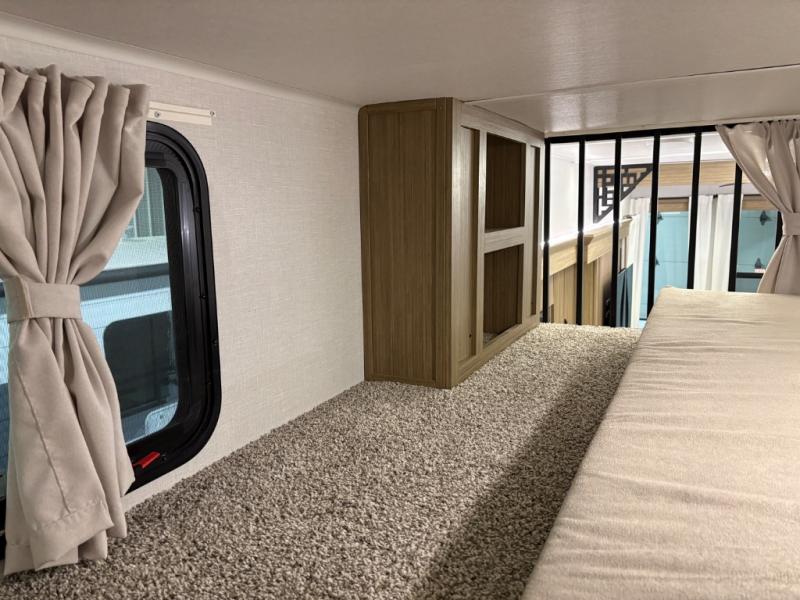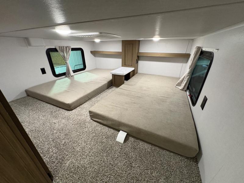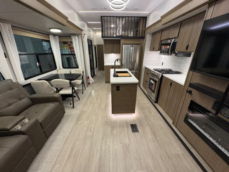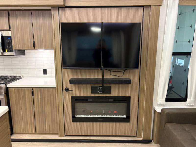 The grandkids will be begging to come along with you on your next getaway in this destination trailer! It features a double loft with three 42" x 74" bunk mats in total above the rear private bedroom. Inside the bedroom, you will find a king bed with Versa-Tilt slide and overhead cabinets, and a closet with optional washer/dryer prep if you want. The walk-in shower with a seat will make it easy for everyone to stay fresh and clean as well. The living and kitchen area feature a kitchen island, a free standing dinette to enjoy meals and play games at, a front sofa, and theater seating across from the entertainment center with a fireplace for those crisp evenings!