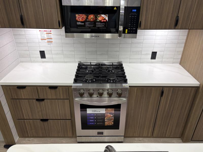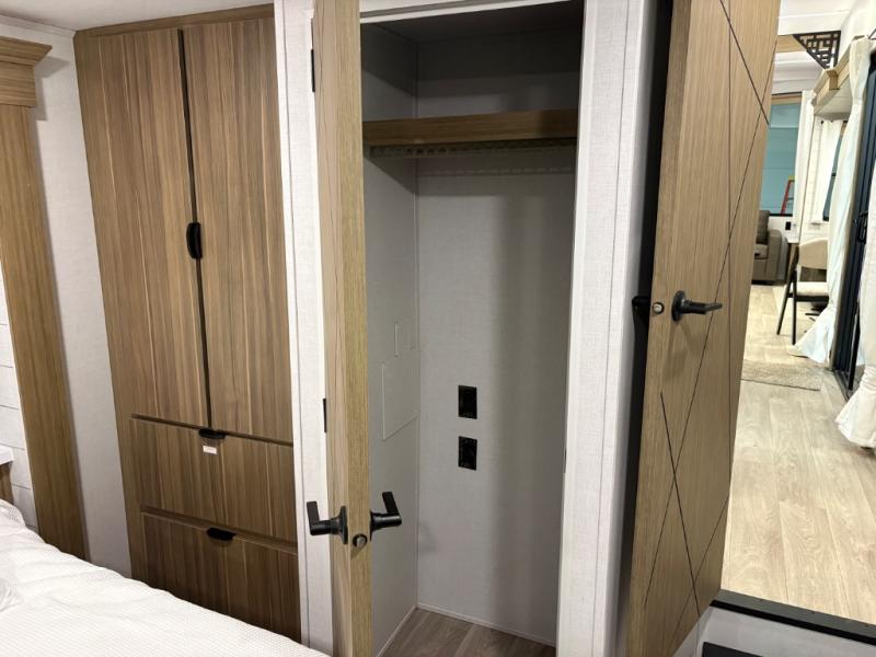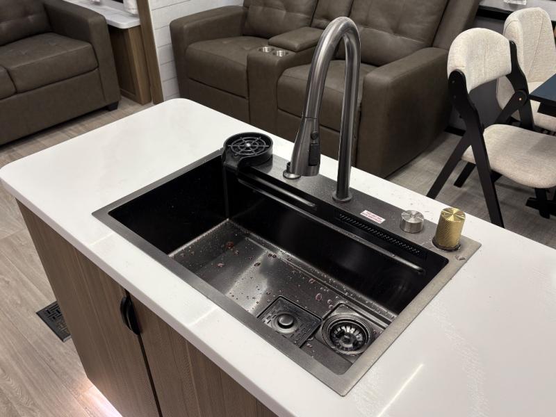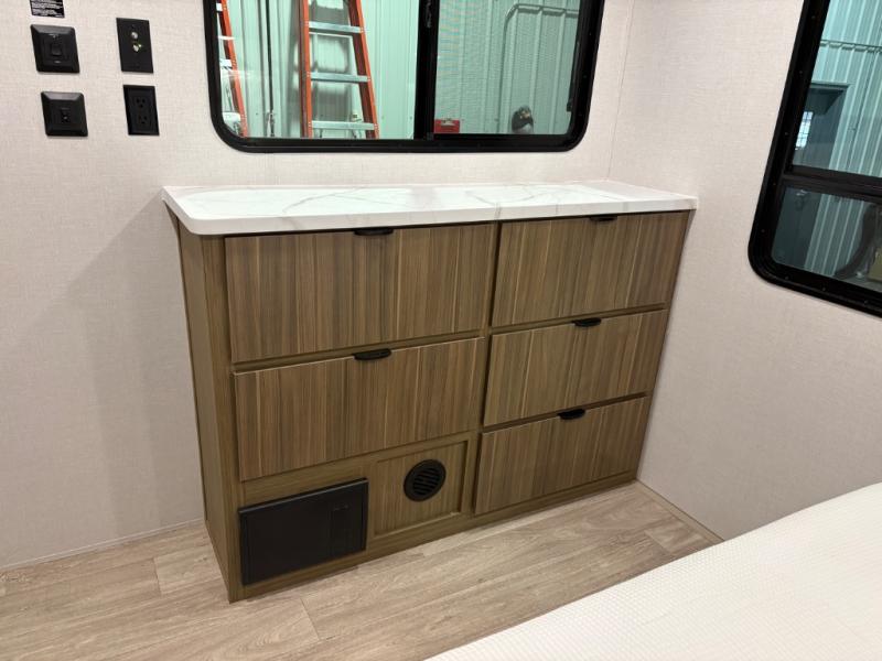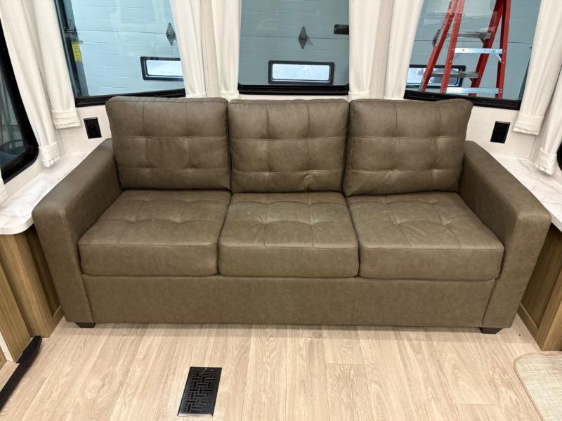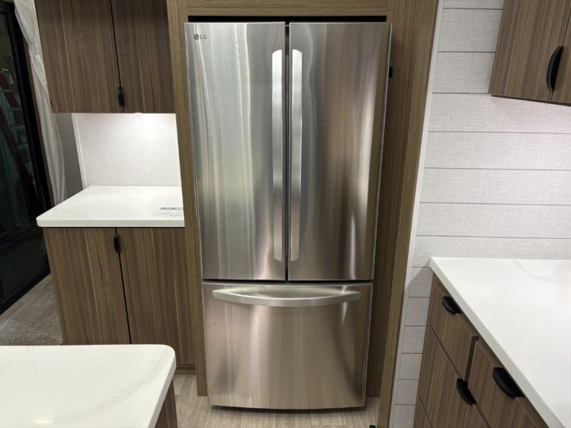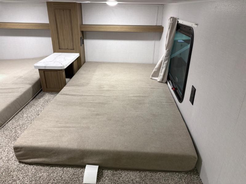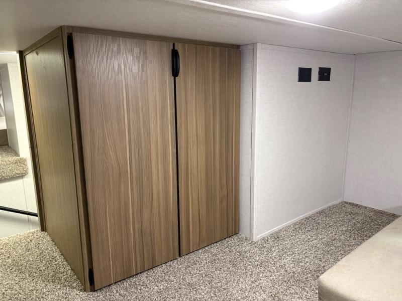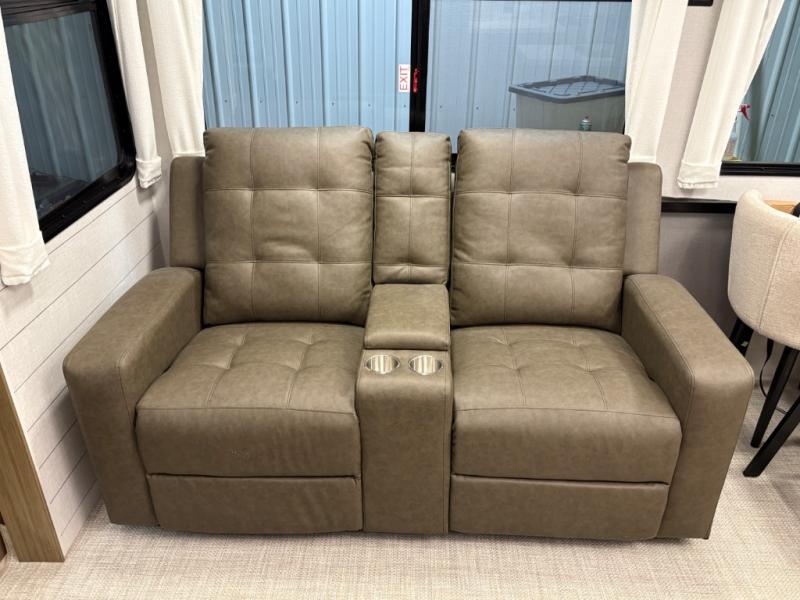The grandkids will be begging to come along with you on your next getaway in this destination trailer! It features a double loft with three 42" x 74" bunk mats in total above the rear private bedroom. Inside the bedroom, you will find a king bed with Versa-Tilt slide and overhead cabinets, and a closet with optional washer/dryer prep if you want. The walk-in shower with a seat will make it easy for everyone to stay fresh and clean as well. The living and kitchen area feature a kitchen island, a free standing dinette to enjoy meals and play games at, a front sofa, and theater seating across from the entertainment center with a fireplace for those crisp evenings!