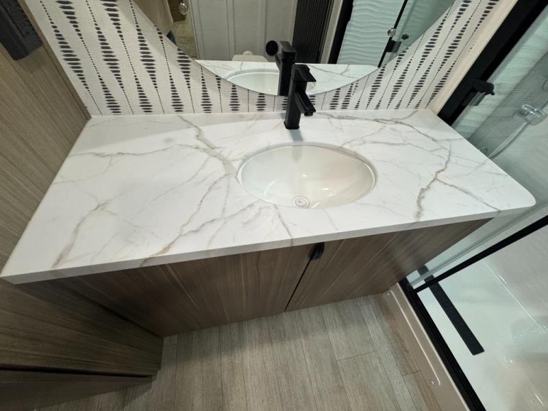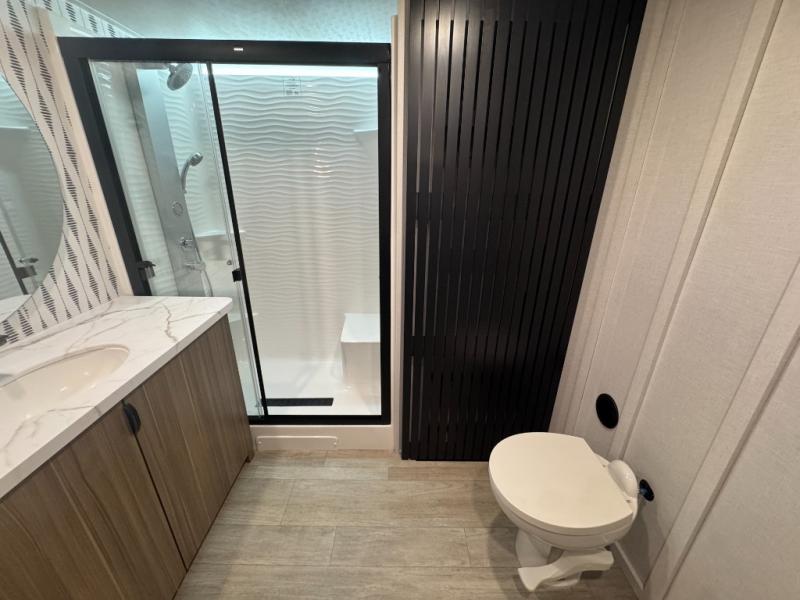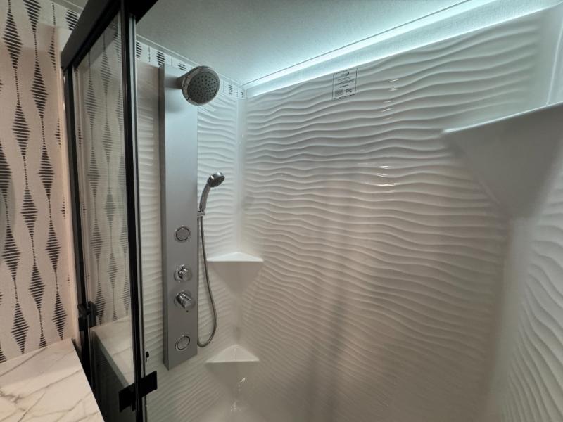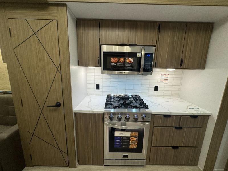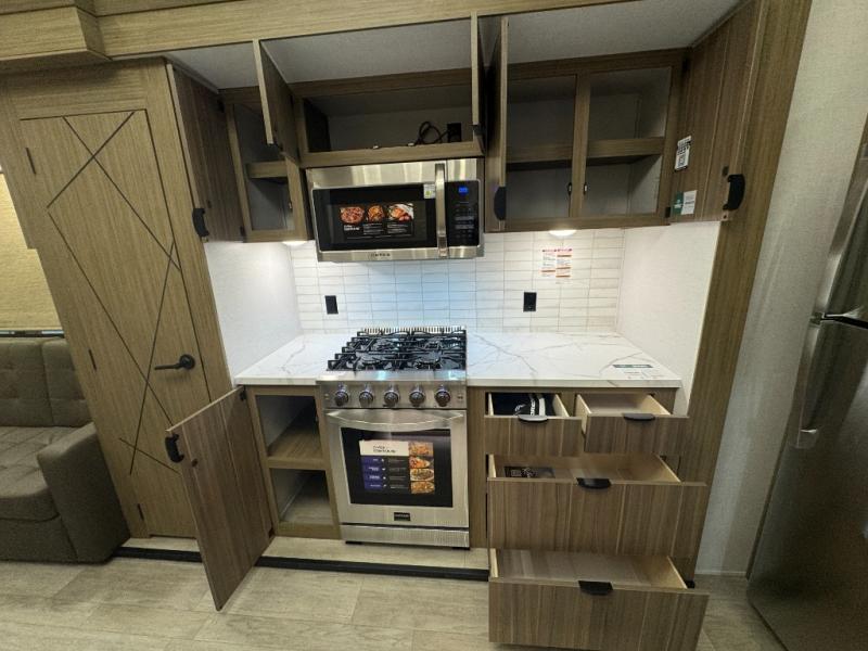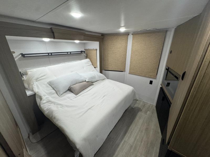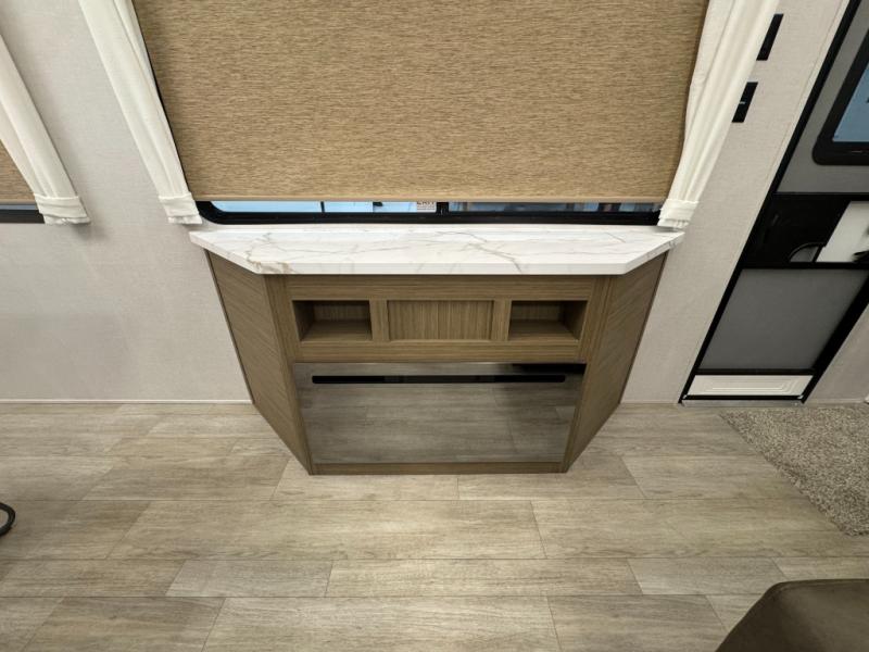 With any Salem Grand Villa destination trailer by Forest River, you can call home wherever you park it! There is a heated and enclosed Accessibelly for added protection, LED "Blade Lighting" under the awning, Lippert On-The-Go ladder prep, plus many more exterior conveniences. Elegant curtain rods and curtains will have you feeling right at home, along with stainless steel kitchen appliances, stylish roller shades, and enhanced floating shelves for added storage. Each model includes heavy duty cabinet hinges for safety and durability, a 60k on-demand tankless water heater for endless hot showers, a JBL 3-Zone media center, plus available options to further customize your trailer.