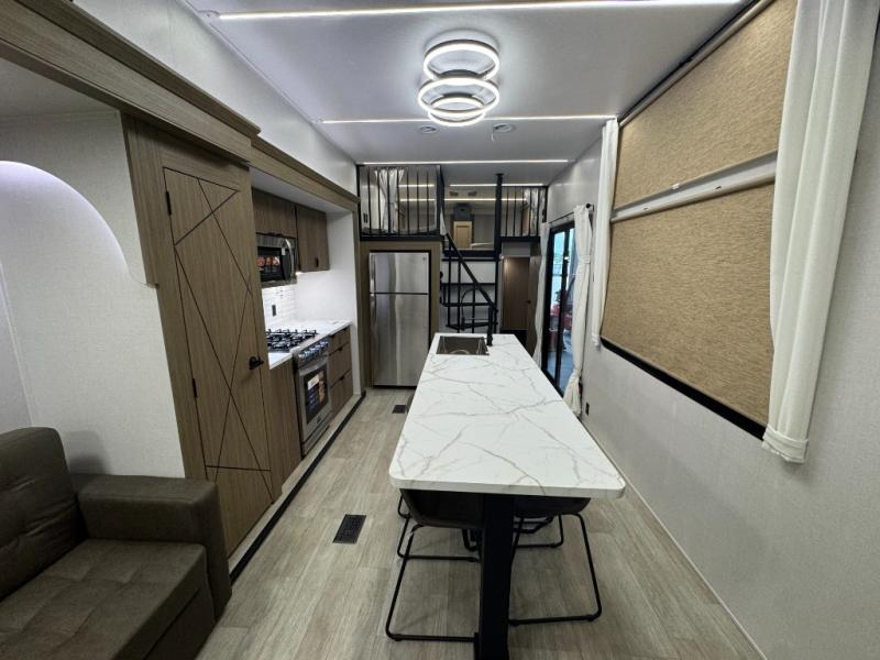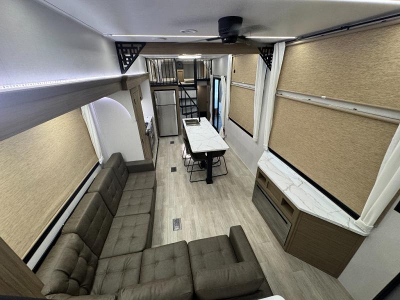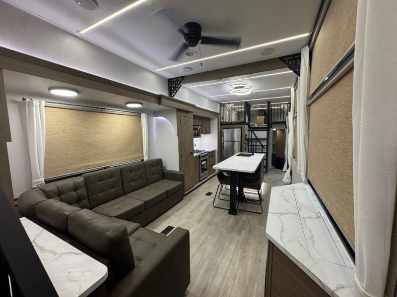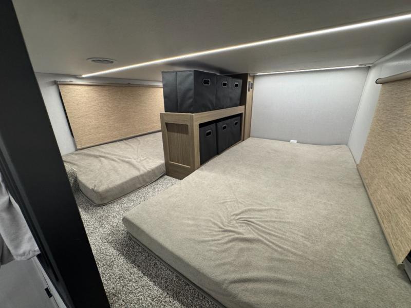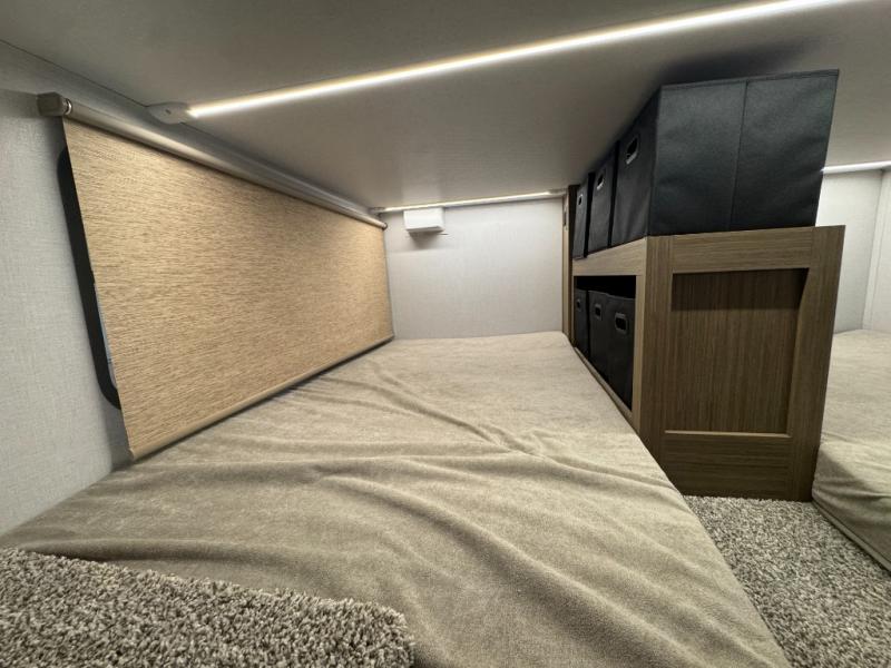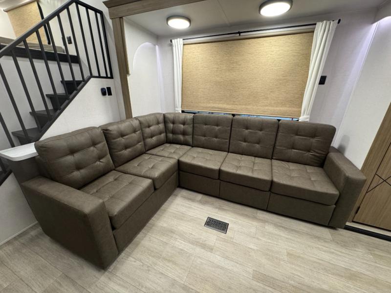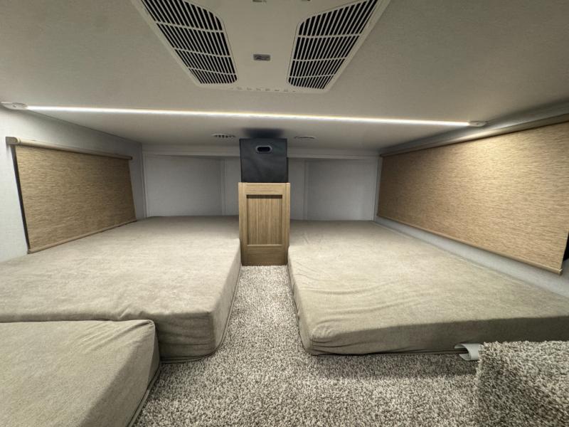 This trailer is built with comfort and convenience in mind, offering plenty of sleeping space for the whole gang. It has two spacious lofts, each equipped with two 42" x 72" bunk mats, plus an extra 36" x 38" bunk mat, providing cozy sleeping spots for everyone. Each loft also includes built-in storage for essentials, and instead of climbing a ladder, easy stair access makes getting in and out much safer. On the main floor, you’ll find a full rear bathroom with a walk-in shower and washer/dryer prep. The main living area has a large sectional sofa, perfect for gathering the group to watch the TV on the Televator or relaxing by the fireplace after a day outdoors. The kitchen is equipped with all the essentials, including a large pantry, overhead cabinets for snack storage, a fridge, and a kitchen island that adds prep space. Up front, the private bedroom has a king bed with Versa Tilt, a dresser, and shelves to keep your clothes and camp gear neatly organized. Regardless that you're adventuring about, this trailer is ready to make every trip feel like home.