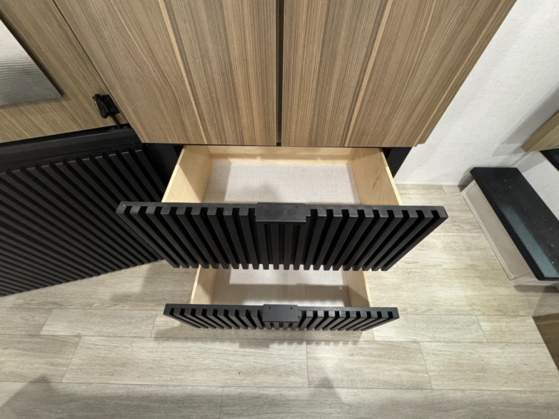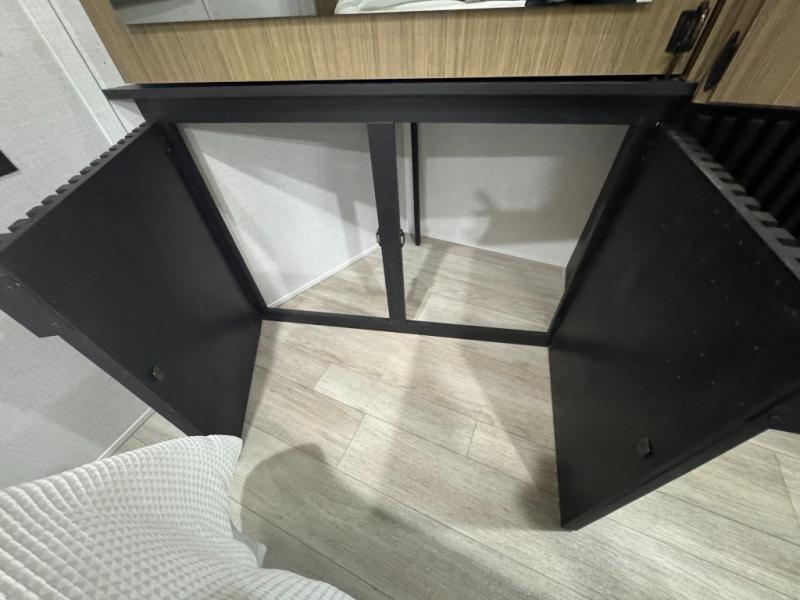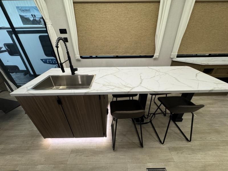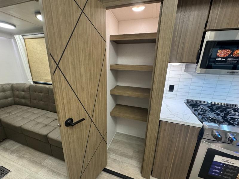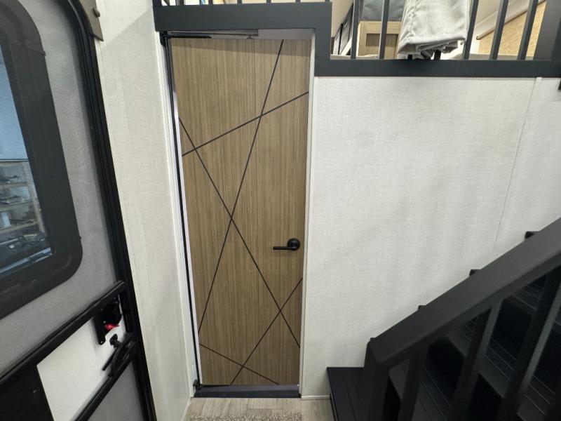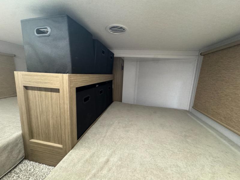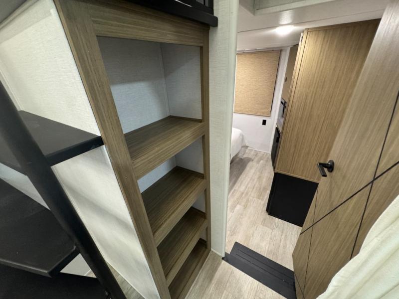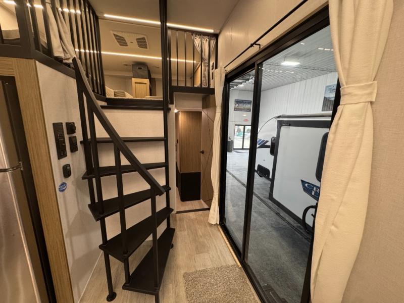 This trailer is built with comfort and convenience in mind, offering plenty of sleeping space for the whole gang. It has two spacious lofts, each equipped with two 42" x 72" bunk mats, plus an extra 36" x 38" bunk mat, providing cozy sleeping spots for everyone. Each loft also includes built-in storage for essentials, and instead of climbing a ladder, easy stair access makes getting in and out much safer. On the main floor, you’ll find a full rear bathroom with a walk-in shower and washer/dryer prep. The main living area has a large sectional sofa, perfect for gathering the group to watch the TV on the Televator or relaxing by the fireplace after a day outdoors. The kitchen is equipped with all the essentials, including a large pantry, overhead cabinets for snack storage, a fridge, and a kitchen island that adds prep space. Up front, the private bedroom has a king bed with Versa Tilt, a dresser, and shelves to keep your clothes and camp gear neatly organized. Regardless that you're adventuring about, this trailer is ready to make every trip feel like home.