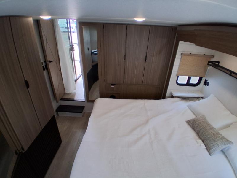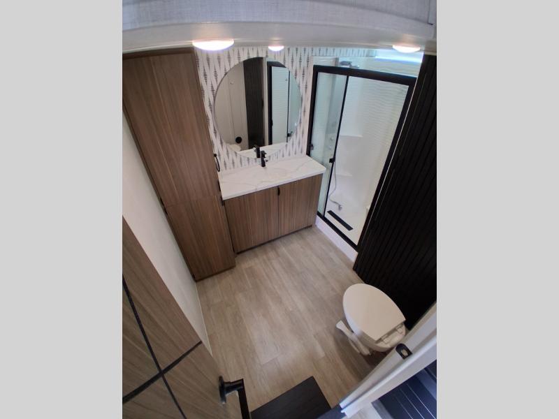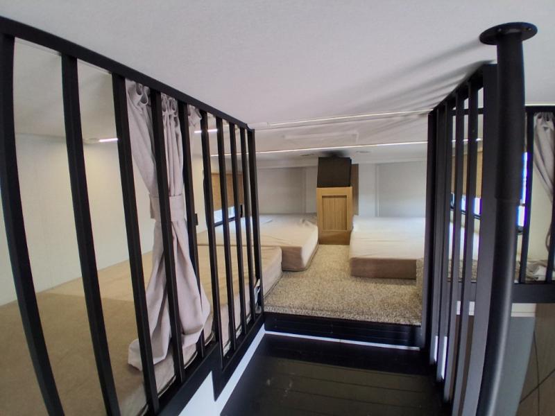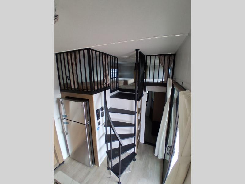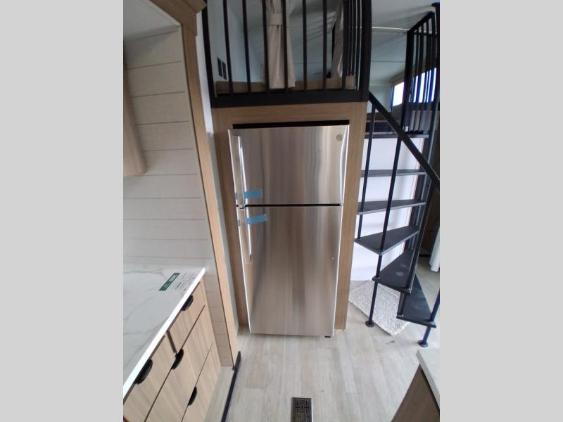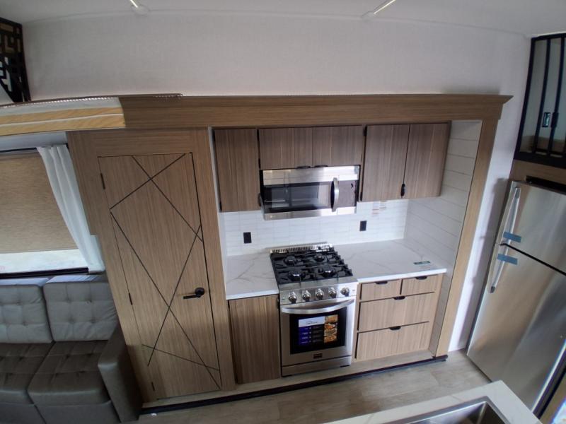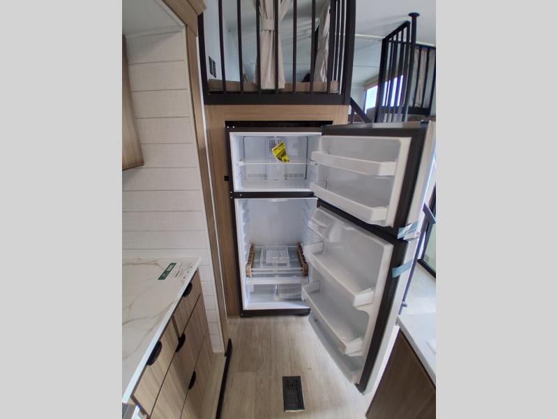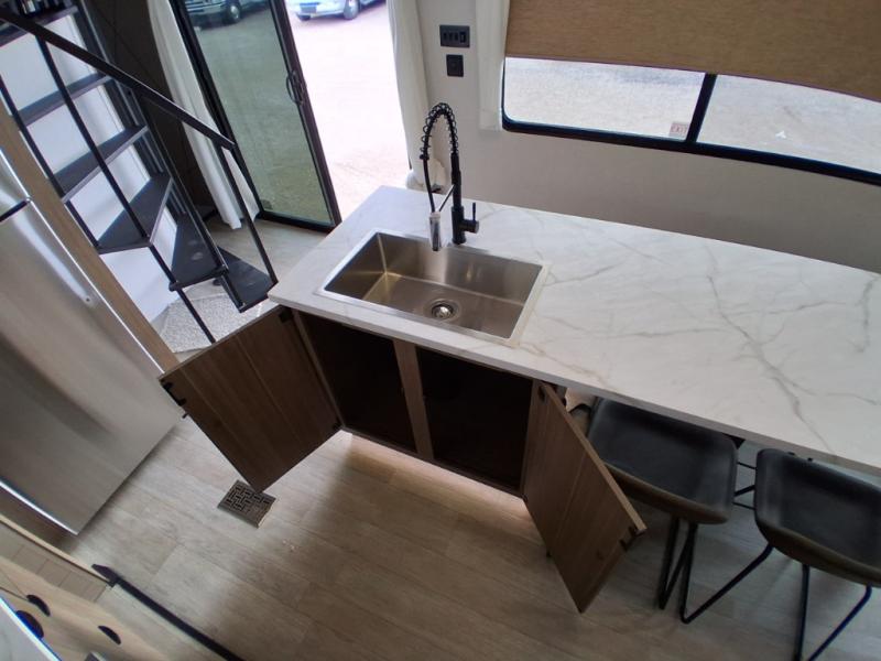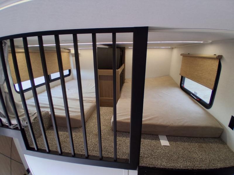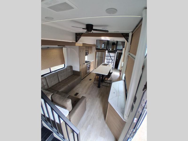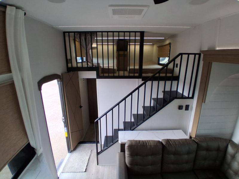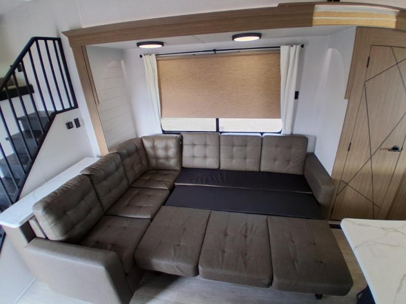 This trailer is built with comfort and convenience in mind, offering plenty of sleeping space for the whole gang. It has two spacious lofts, each equipped with two 42" x 72" bunk mats, plus an extra 36" x 38" bunk mat, providing cozy sleeping spots for everyone. Each loft also includes built-in storage for essentials, and instead of climbing a ladder, easy stair access makes getting in and out much safer. On the main floor, you’ll find a full rear bathroom with a walk-in shower and washer/dryer prep. The main living area has a large sectional sofa, perfect for gathering the group to watch the TV on the Televator or relaxing by the fireplace after a day outdoors. The kitchen is equipped with all the essentials, including a large pantry, overhead cabinets for snack storage, a fridge, and a kitchen island that adds prep space. Up front, the private bedroom has a king bed with Versa Tilt, a dresser, and shelves to keep your clothes and camp gear neatly organized. Regardless that you're adventuring about, this trailer is ready to make every trip feel like home.