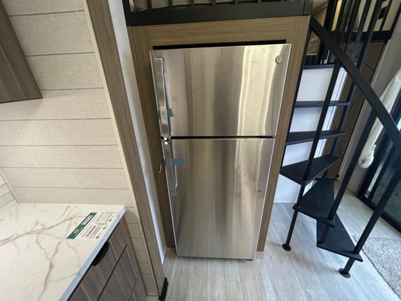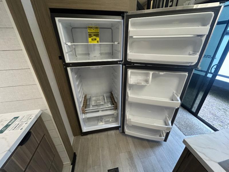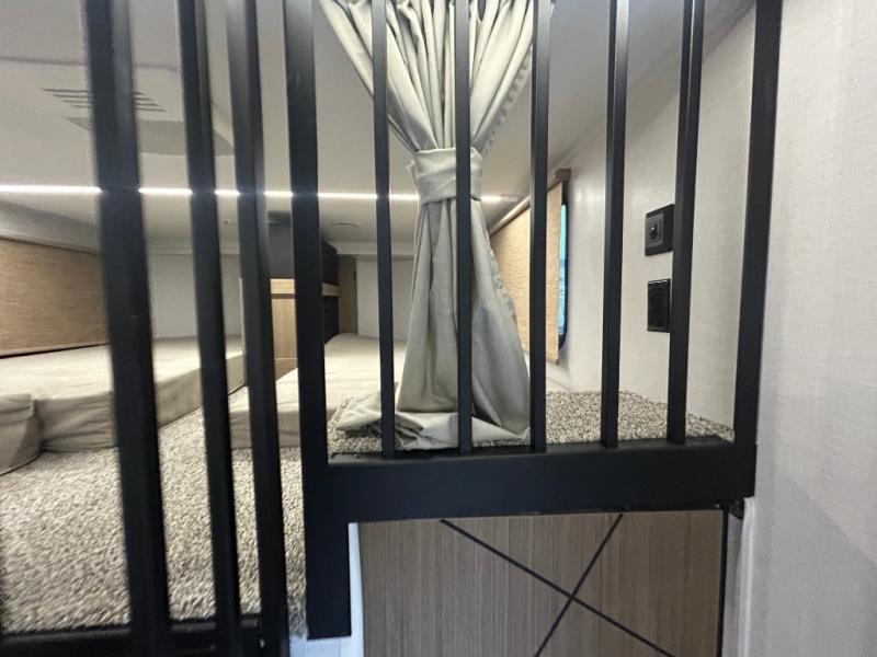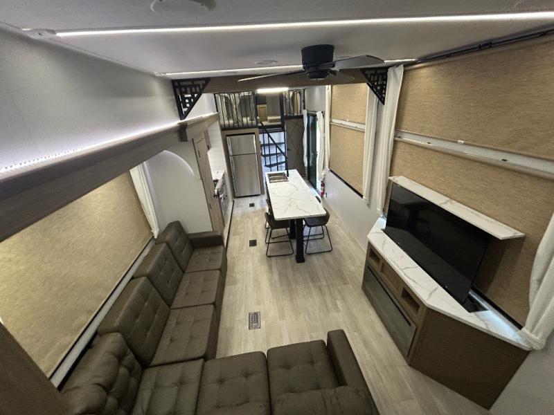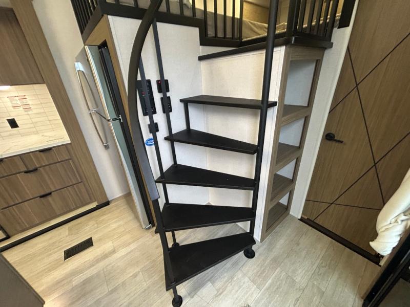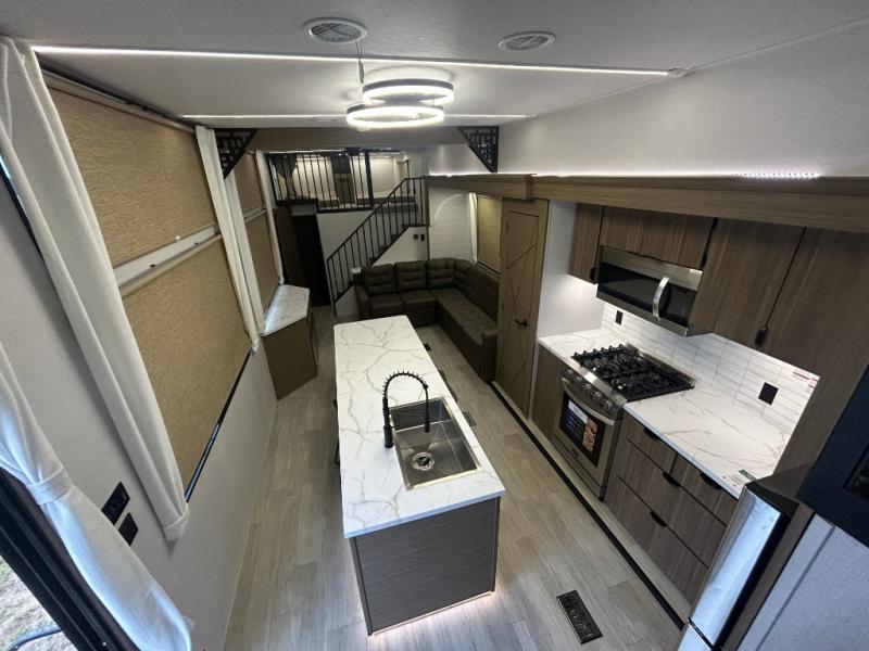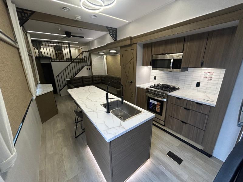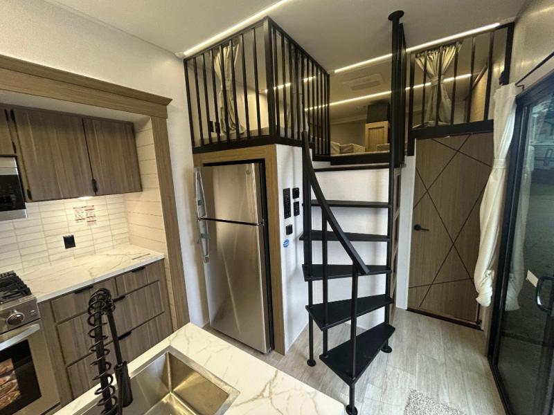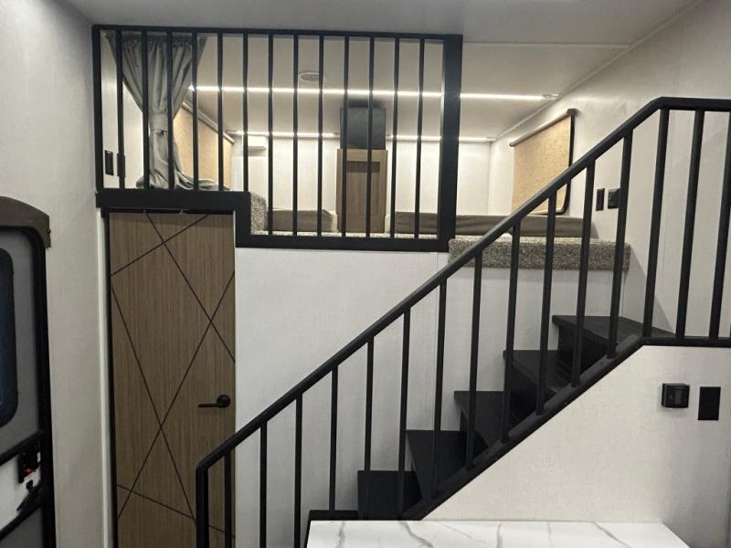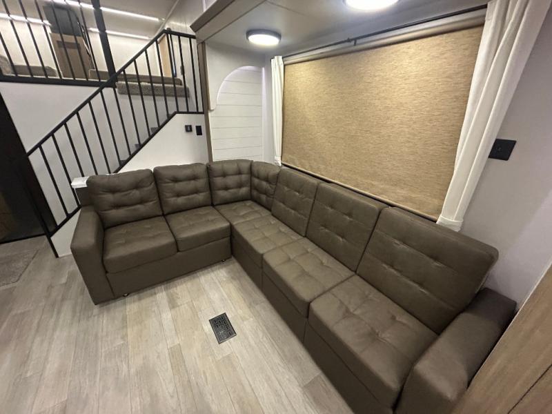 You will feel right at home in this destination trailer! It has not only has one loft in the rear with two 42" x 74" bunk mats, but also a second loft in the front with spiral steps leading up to two bunk mats. The front private bedroom features a king bed slide with Versa-Tilt to lay your head on at night with front windows to let in lots of natural lighting and sunshine in the morning. Relax in true comfort at night on the L-shaped sectional sofa across from the entertainment center with a fireplace. The kitchen island provides extra space to prepare delicious meals and comes with four bar stools to enjoy your breakfast each morning. Everyone will stay fresh and clean with a walk-in shower in the rear private bedroom, plus there is washer and dryer prep if you choose to add those appliances. Head outside through either the patio door or the second entry/exit door each day!