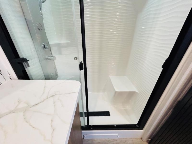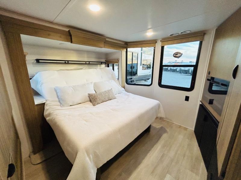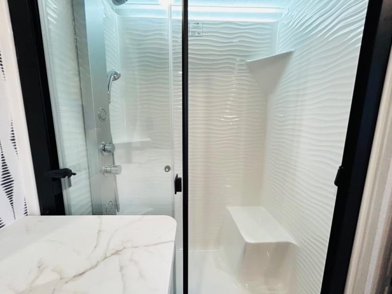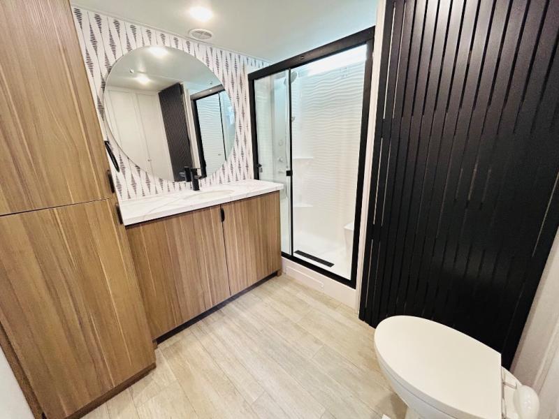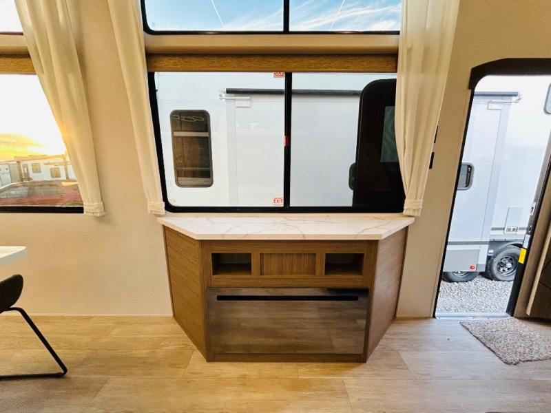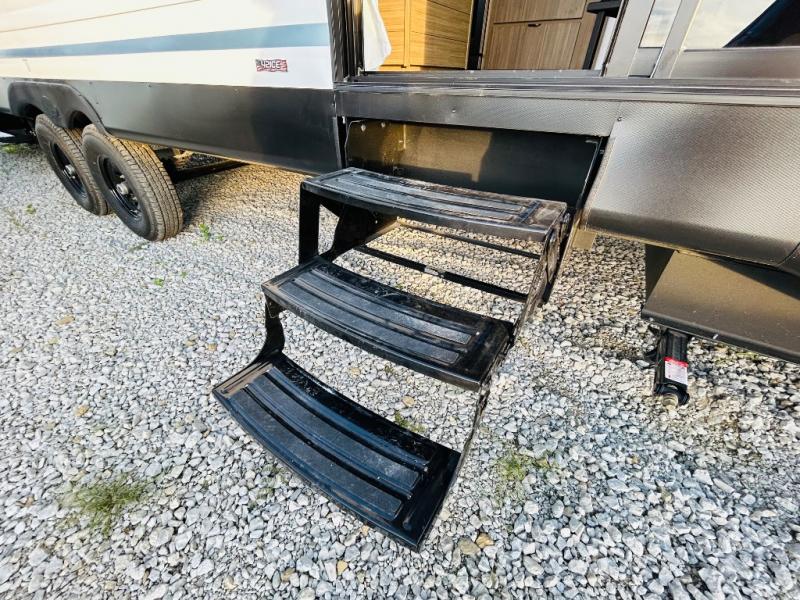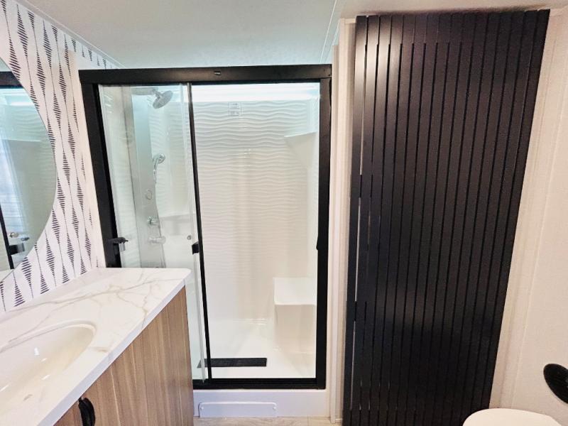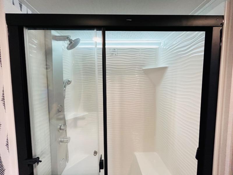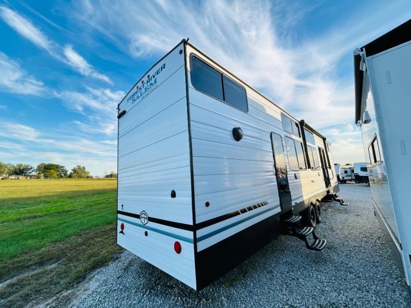 With any Salem Grand Villa destination trailer by Forest River, you can call home wherever you park it! There is a heated and enclosed Accessibelly for added protection, LED "Blade Lighting" under the awning, Lippert On-The-Go ladder prep, plus many more exterior conveniences. Elegant curtain rods and curtains will have you feeling right at home, along with stainless steel kitchen appliances, stylish roller shades, and enhanced floating shelves for added storage. Each model includes heavy duty cabinet hinges for safety and durability, a 60k on-demand tankless water heater for endless hot showers, a JBL 3-Zone media center, plus available options to further customize your trailer.