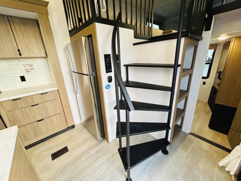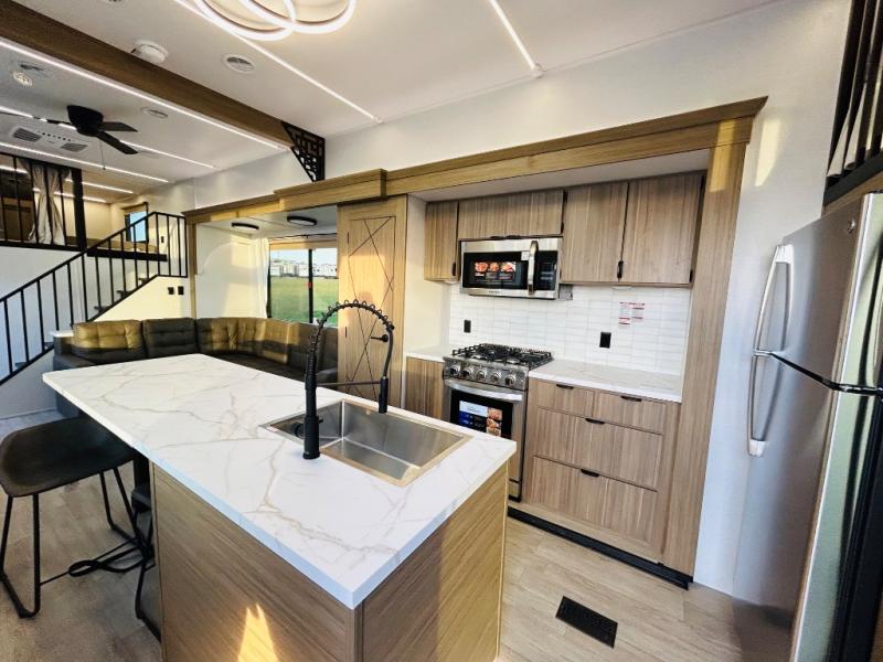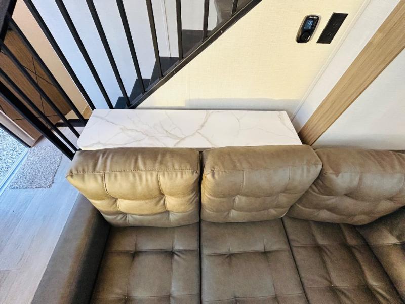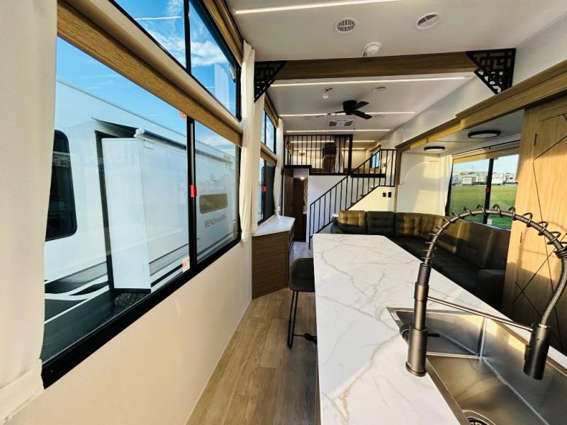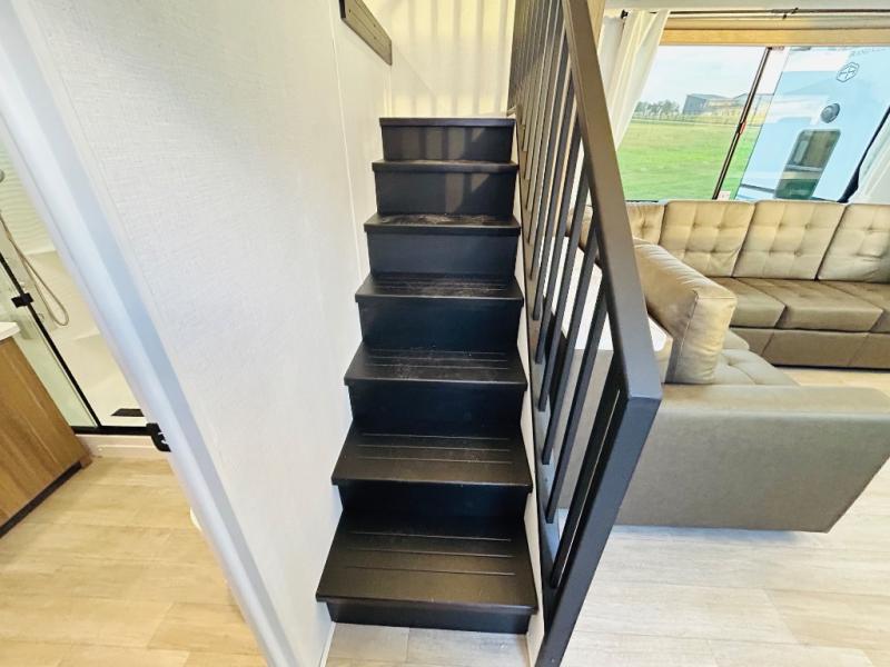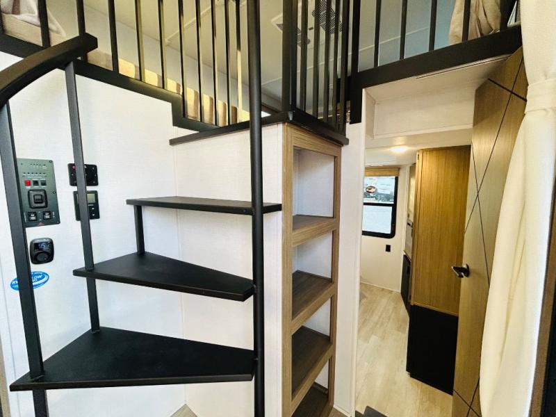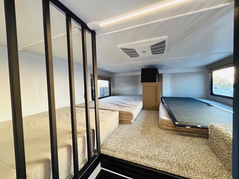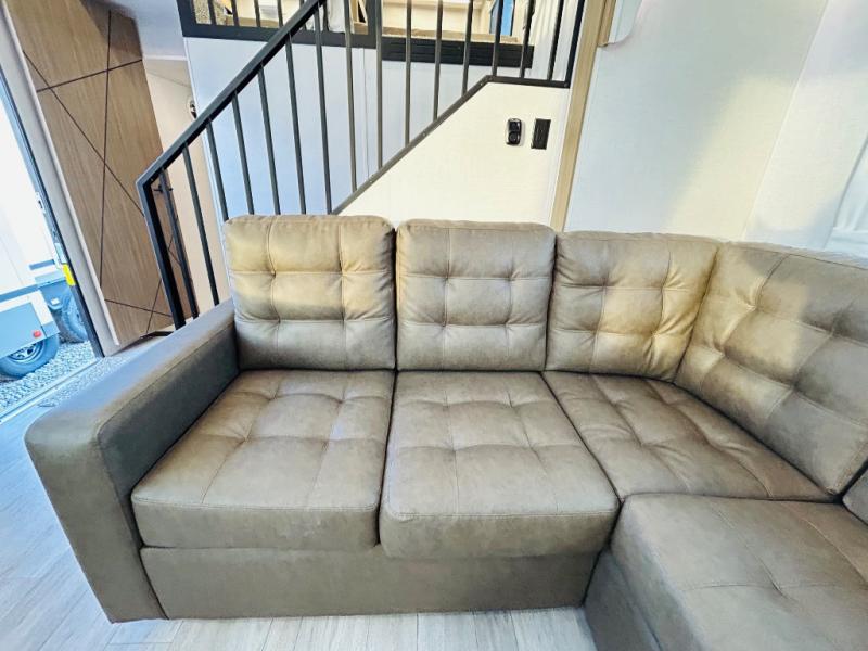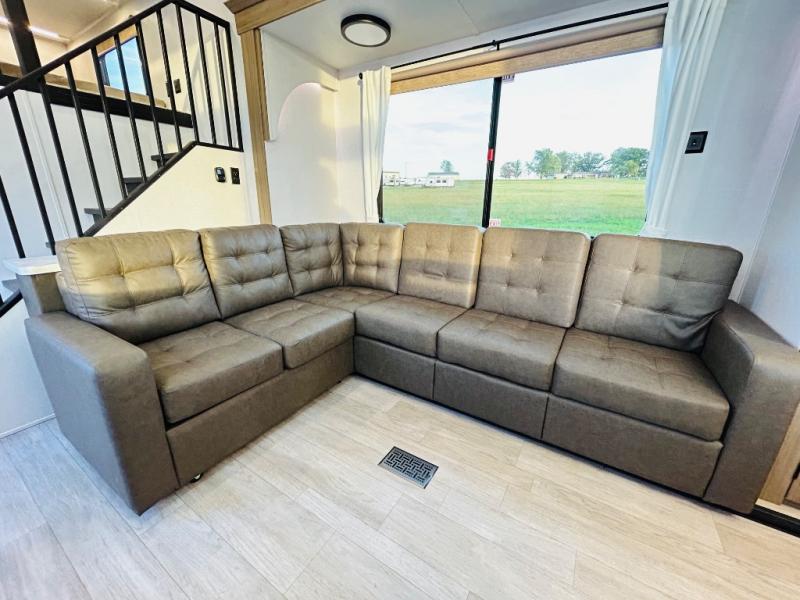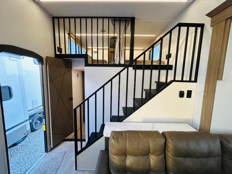 This trailer is built with comfort and convenience in mind, offering plenty of sleeping space for the whole gang. It has two spacious lofts, each equipped with two 42" x 72" bunk mats, plus an extra 36" x 38" bunk mat, providing cozy sleeping spots for everyone. Each loft also includes built-in storage for essentials, and instead of climbing a ladder, easy stair access makes getting in and out much safer. On the main floor, you’ll find a full rear bathroom with a walk-in shower and washer/dryer prep. The main living area has a large sectional sofa, perfect for gathering the group to watch the TV on the Televator or relaxing by the fireplace after a day outdoors. The kitchen is equipped with all the essentials, including a large pantry, overhead cabinets for snack storage, a fridge, and a kitchen island that adds prep space. Up front, the private bedroom has a king bed with Versa Tilt, a dresser, and shelves to keep your clothes and camp gear neatly organized. Regardless that you're adventuring about, this trailer is ready to make every trip feel like home.