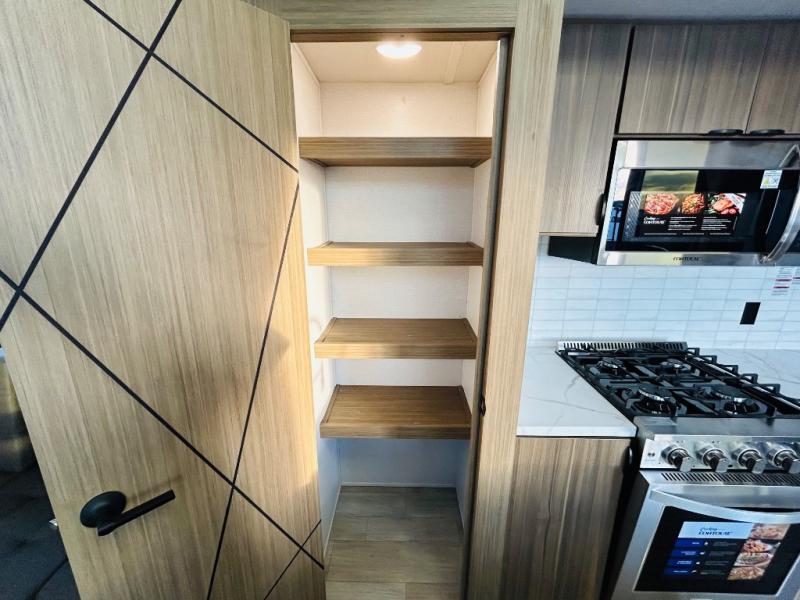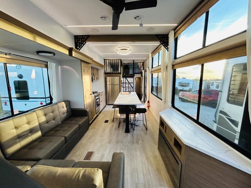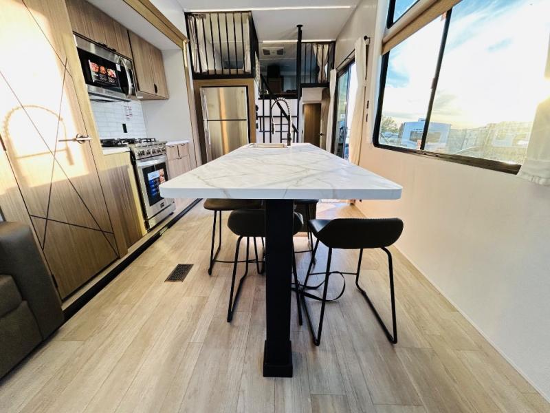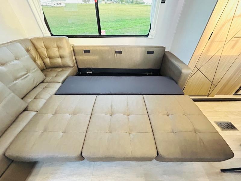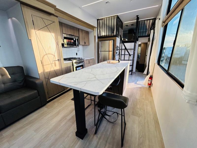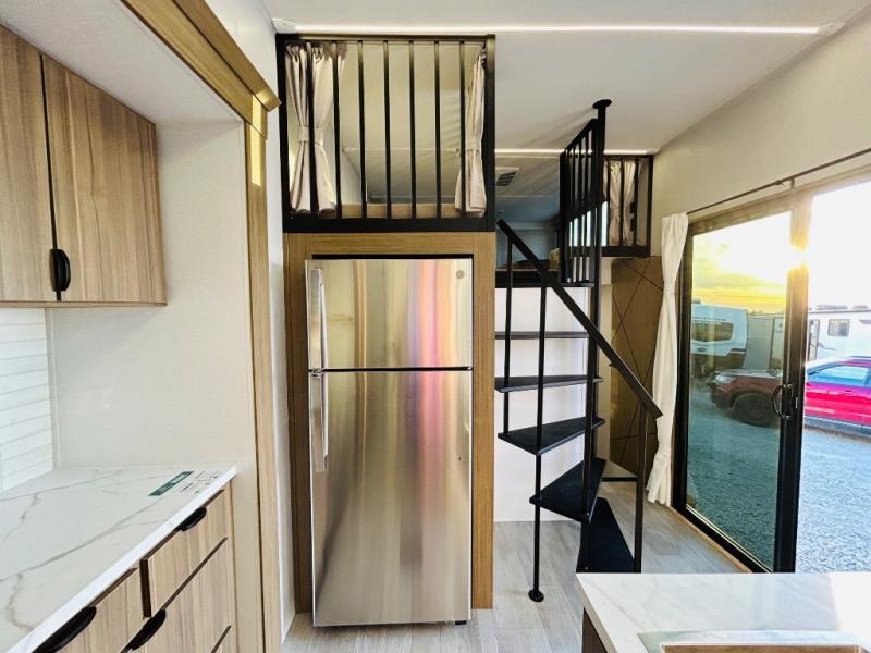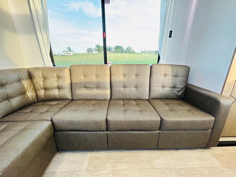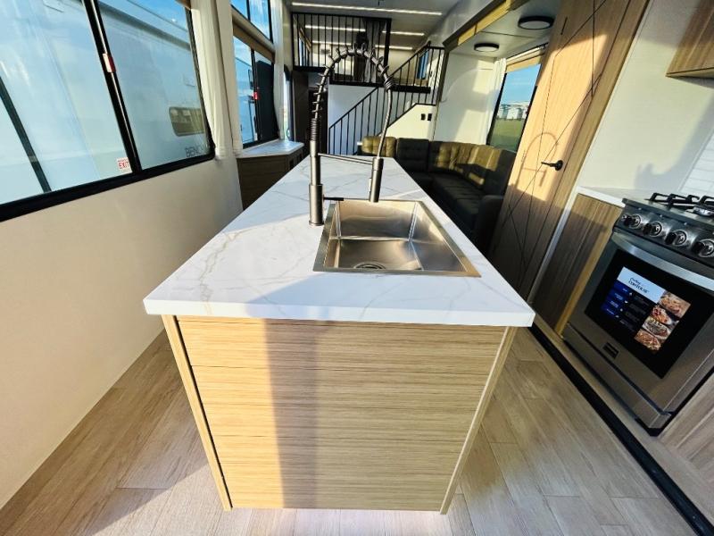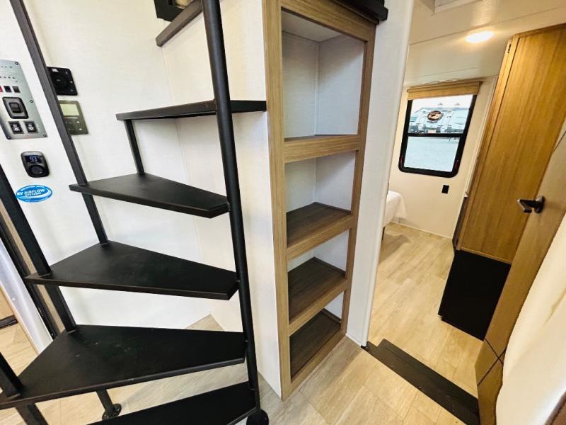This trailer is built with comfort and convenience in mind, offering plenty of sleeping space for the whole gang. It has two spacious lofts, each equipped with two 42" x 72" bunk mats, plus an extra 36" x 38" bunk mat, providing cozy sleeping spots for everyone. Each loft also includes built-in storage for essentials, and instead of climbing a ladder, easy stair access makes getting in and out much safer. On the main floor, you’ll find a full rear bathroom with a walk-in shower and washer/dryer prep. The main living area has a large sectional sofa, perfect for gathering the group to watch the TV on the Televator or relaxing by the fireplace after a day outdoors. The kitchen is equipped with all the essentials, including a large pantry, overhead cabinets for snack storage, a fridge, and a kitchen island that adds prep space. Up front, the private bedroom has a king bed with Versa Tilt, a dresser, and shelves to keep your clothes and camp gear neatly organized. Regardless that you're adventuring about, this trailer is ready to make every trip feel like home.