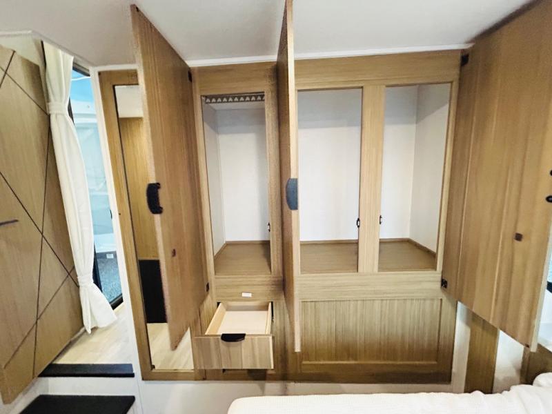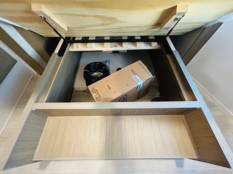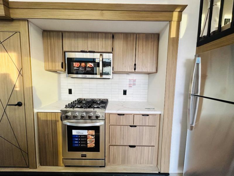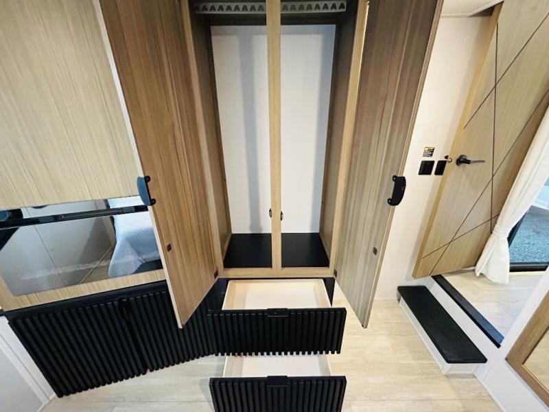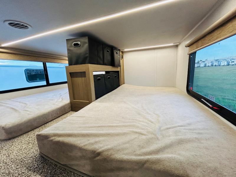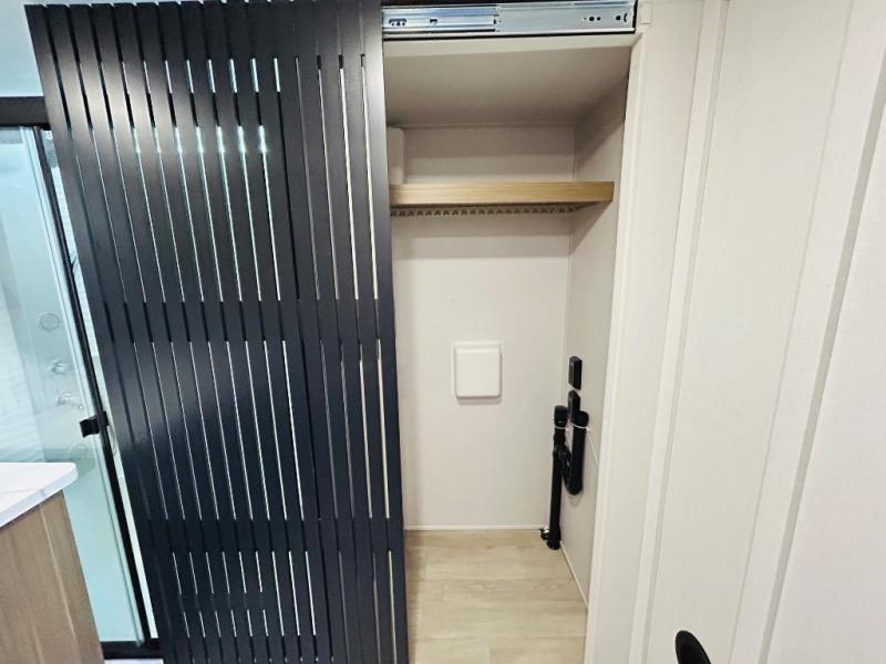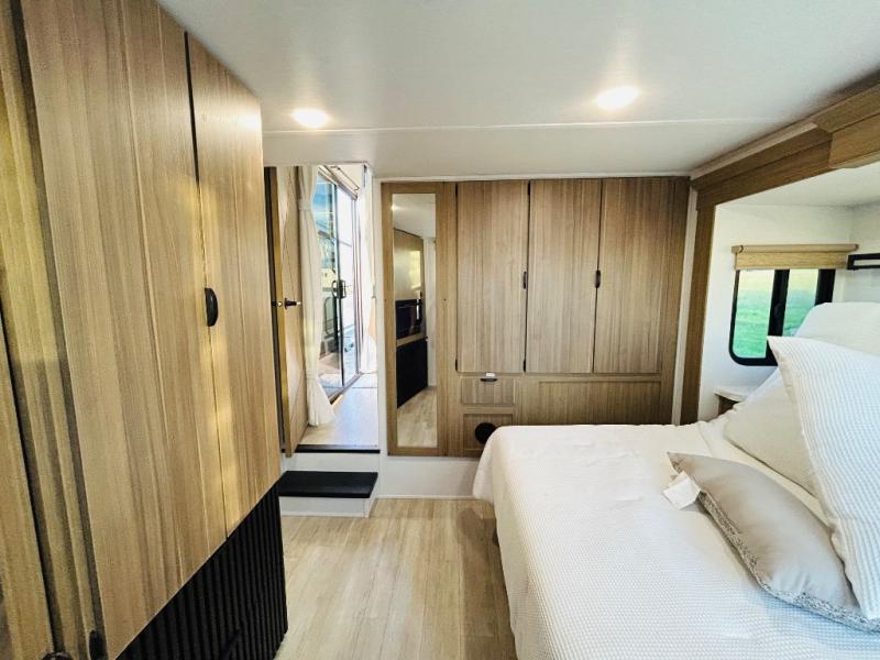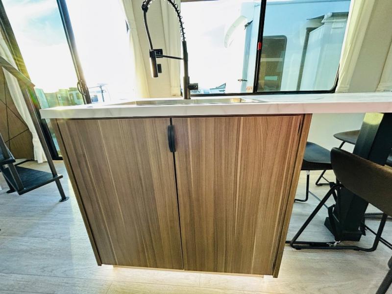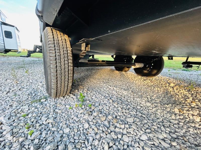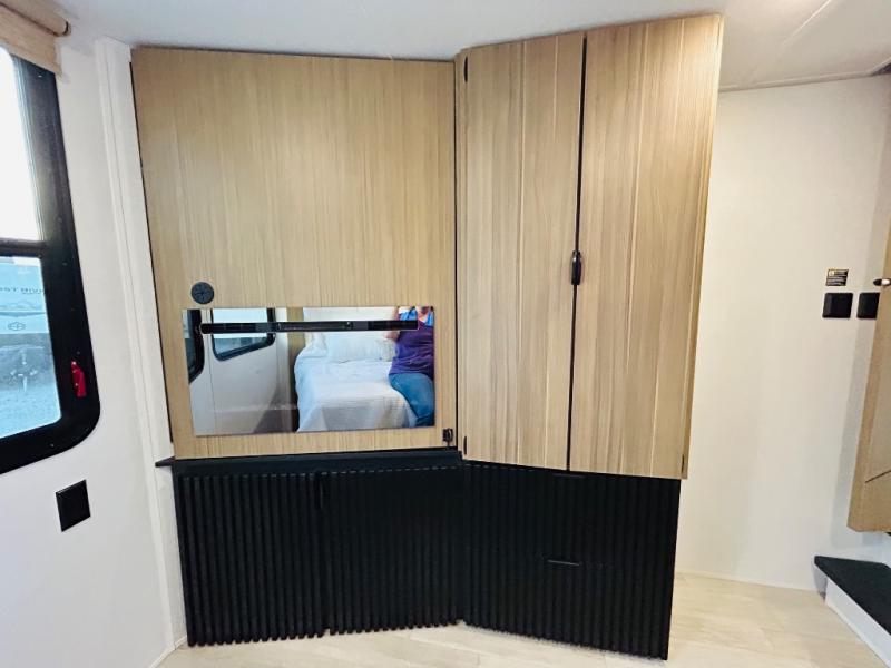 This trailer is built with comfort and convenience in mind, offering plenty of sleeping space for the whole gang. It has two spacious lofts, each equipped with two 42" x 72" bunk mats, plus an extra 36" x 38" bunk mat, providing cozy sleeping spots for everyone. Each loft also includes built-in storage for essentials, and instead of climbing a ladder, easy stair access makes getting in and out much safer. On the main floor, you’ll find a full rear bathroom with a walk-in shower and washer/dryer prep. The main living area has a large sectional sofa, perfect for gathering the group to watch the TV on the Televator or relaxing by the fireplace after a day outdoors. The kitchen is equipped with all the essentials, including a large pantry, overhead cabinets for snack storage, a fridge, and a kitchen island that adds prep space. Up front, the private bedroom has a king bed with Versa Tilt, a dresser, and shelves to keep your clothes and camp gear neatly organized. Regardless that you're adventuring about, this trailer is ready to make every trip feel like home.