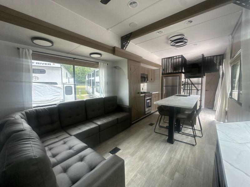 With any Salem Grand Villa destination trailer by Forest River, you can call home wherever you park it! There is a heated and enclosed Accessibelly for added protection, LED "Blade Lighting" under the awning, Lippert On-The-Go ladder prep, plus many more exterior conveniences. Elegant curtain rods and curtains will have you feeling right at home, along with stainless steel kitchen appliances, stylish roller shades, and enhanced floating shelves for added storage. Each model includes heavy duty cabinet hinges for safety and durability, a 60k on-demand tankless water heater for endless hot showers, a JBL 3-Zone media center, plus available options to further customize your trailer.