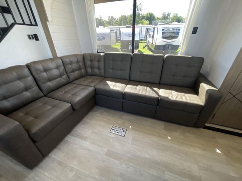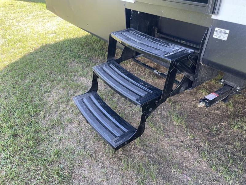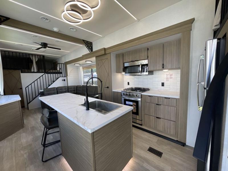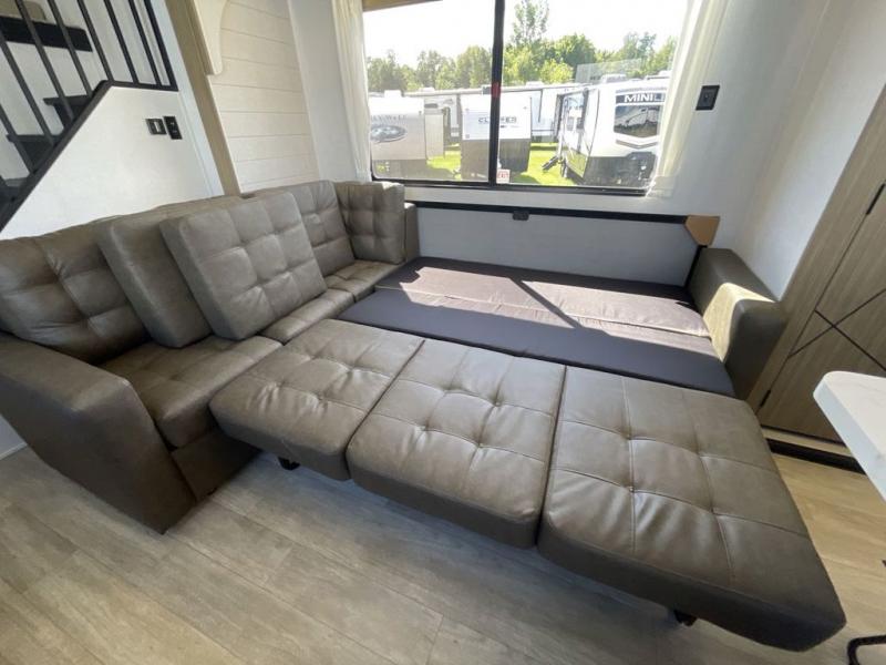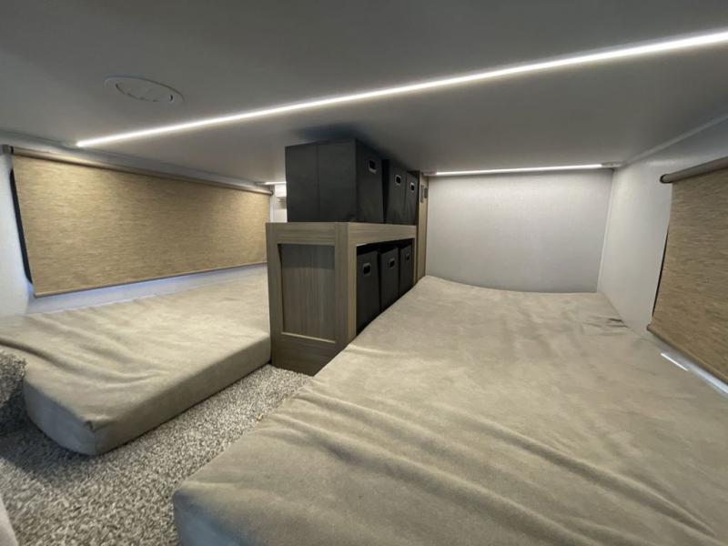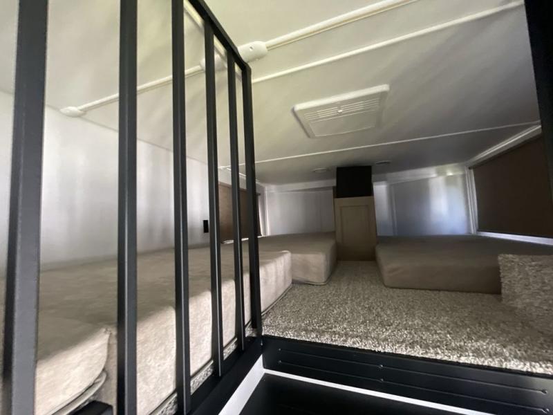 This trailer is built with comfort and convenience in mind, offering plenty of sleeping space for the whole gang. It has two spacious lofts, each equipped with two 42" x 72" bunk mats, plus an extra 36" x 38" bunk mat, providing cozy sleeping spots for everyone. Each loft also includes built-in storage for essentials, and instead of climbing a ladder, easy stair access makes getting in and out much safer. On the main floor, you’ll find a full rear bathroom with a walk-in shower and washer/dryer prep. The main living area has a large sectional sofa, perfect for gathering the group to watch the TV on the Televator or relaxing by the fireplace after a day outdoors. The kitchen is equipped with all the essentials, including a large pantry, overhead cabinets for snack storage, a fridge, and a kitchen island that adds prep space. Up front, the private bedroom has a king bed with Versa Tilt, a dresser, and shelves to keep your clothes and camp gear neatly organized. Regardless that you're adventuring about, this trailer is ready to make every trip feel like home.