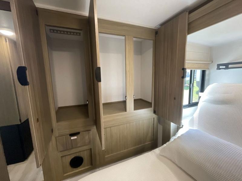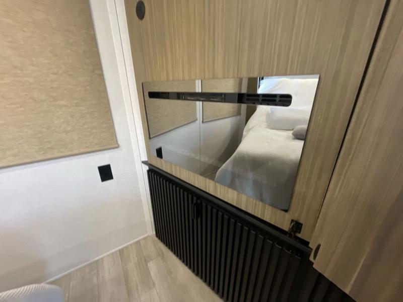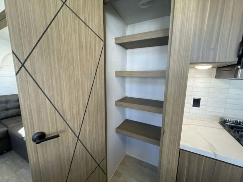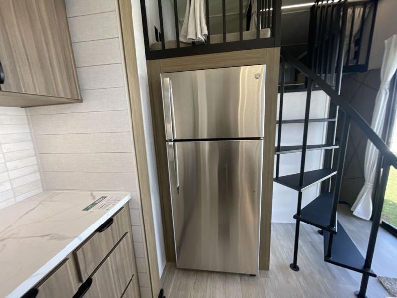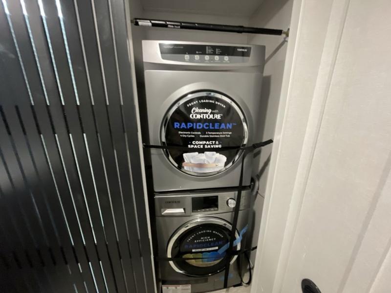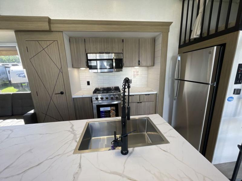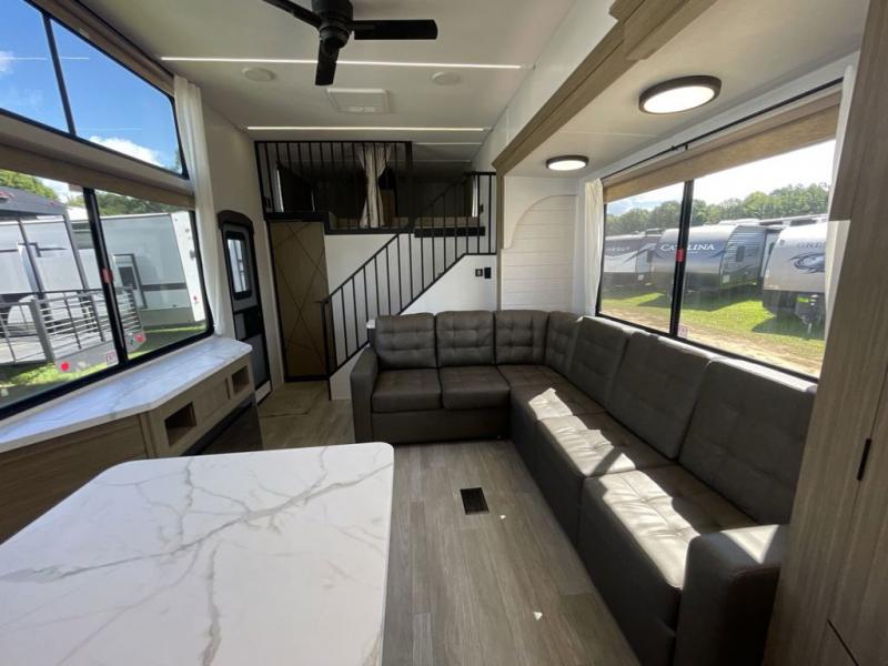 This trailer is built with comfort and convenience in mind, offering plenty of sleeping space for the whole gang. It has two spacious lofts, each equipped with two 42" x 72" bunk mats, plus an extra 36" x 38" bunk mat, providing cozy sleeping spots for everyone. Each loft also includes built-in storage for essentials, and instead of climbing a ladder, easy stair access makes getting in and out much safer. On the main floor, you’ll find a full rear bathroom with a walk-in shower and washer/dryer prep. The main living area has a large sectional sofa, perfect for gathering the group to watch the TV on the Televator or relaxing by the fireplace after a day outdoors. The kitchen is equipped with all the essentials, including a large pantry, overhead cabinets for snack storage, a fridge, and a kitchen island that adds prep space. Up front, the private bedroom has a king bed with Versa Tilt, a dresser, and shelves to keep your clothes and camp gear neatly organized. Regardless that you're adventuring about, this trailer is ready to make every trip feel like home.
