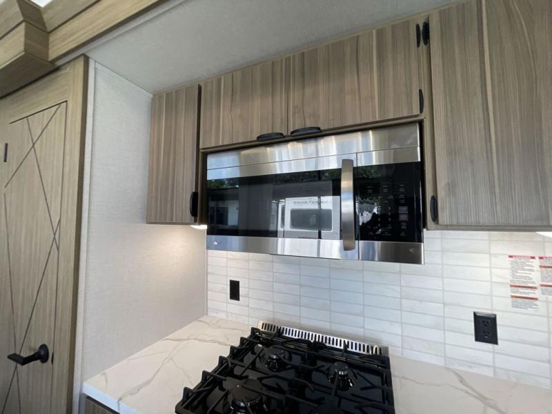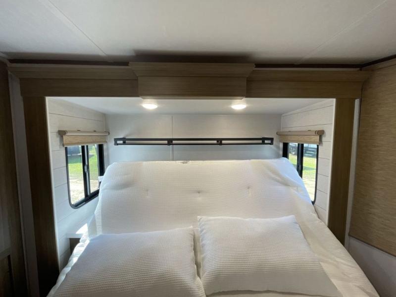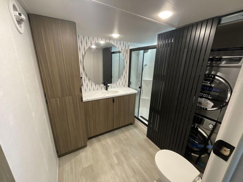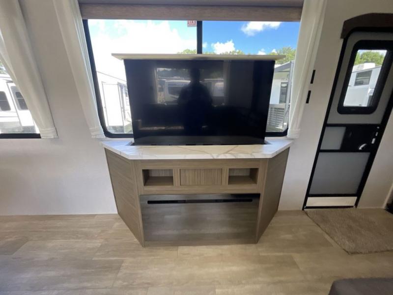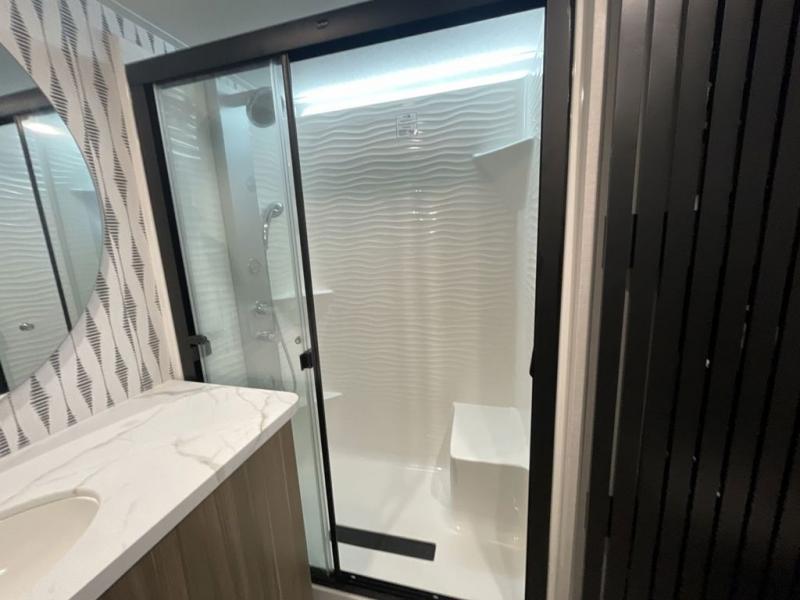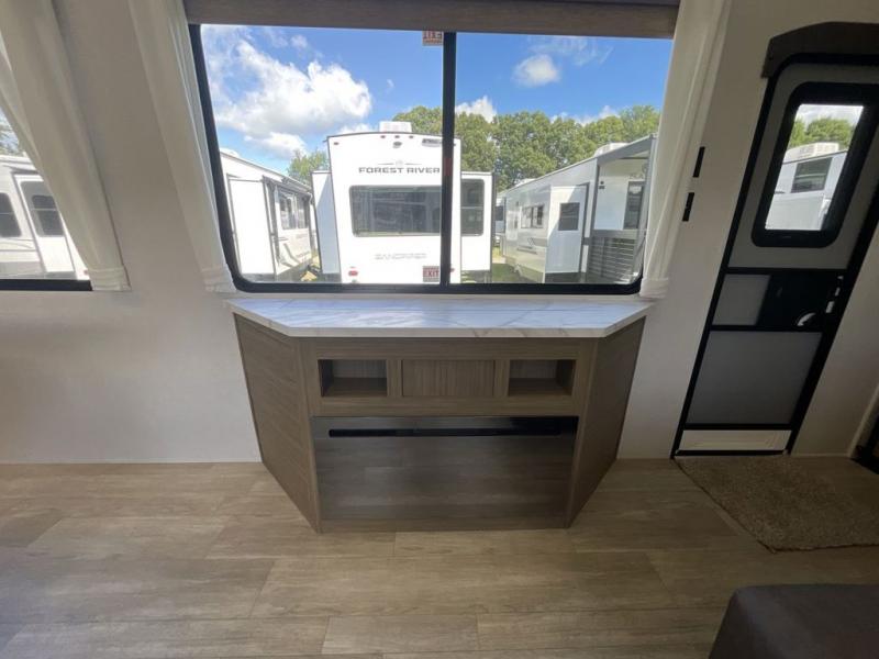 With any Salem Grand Villa destination trailer by Forest River, you can call home wherever you park it! There is a heated and enclosed Accessibelly for added protection, LED "Blade Lighting" under the awning, Lippert On-The-Go ladder prep, plus many more exterior conveniences. Elegant curtain rods and curtains will have you feeling right at home, along with stainless steel kitchen appliances, stylish roller shades, and enhanced floating shelves for added storage. Each model includes heavy duty cabinet hinges for safety and durability, a 60k on-demand tankless water heater for endless hot showers, a JBL 3-Zone media center, plus available options to further customize your trailer.