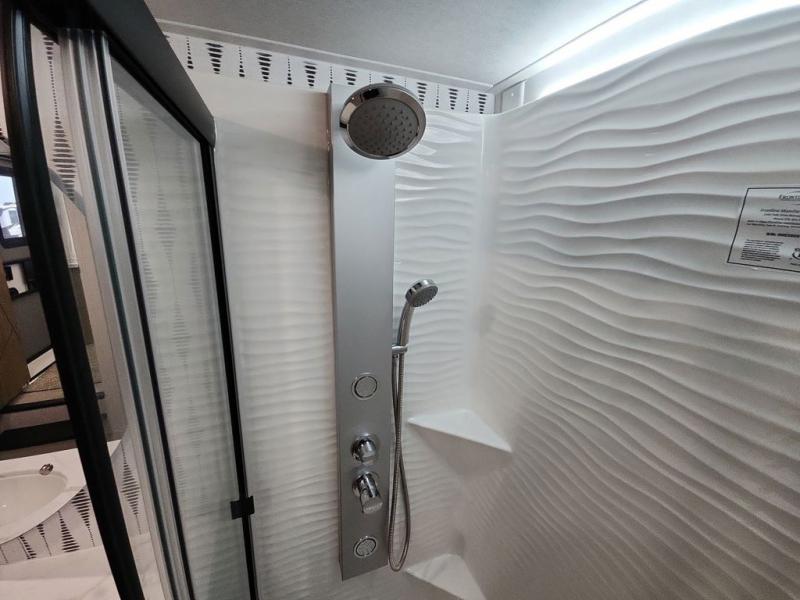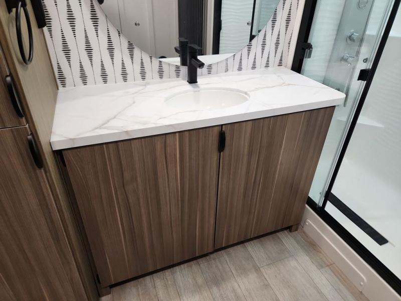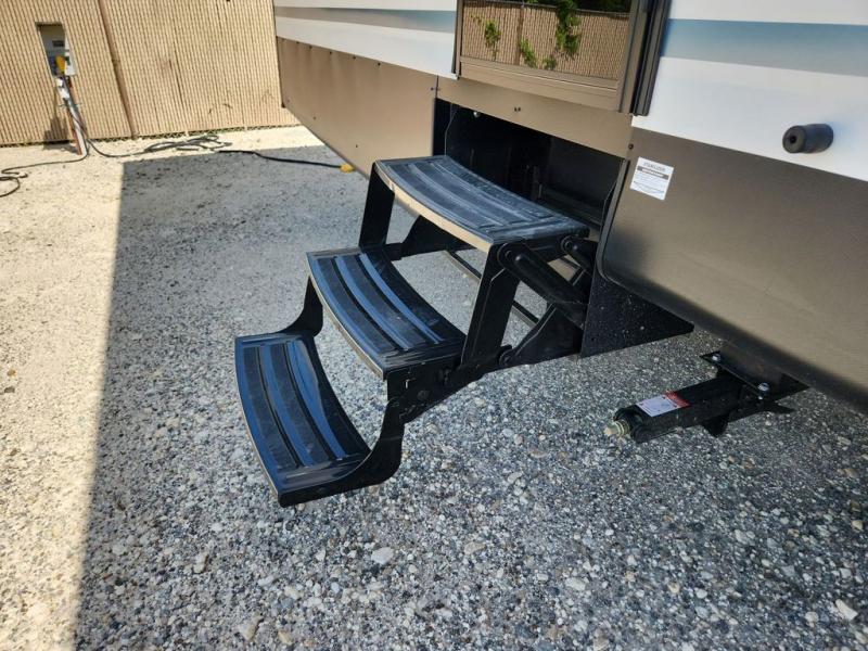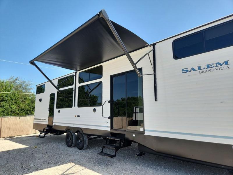 With any Salem Grand Villa destination trailer by Forest River, you can call home wherever you park it! There is a heated and enclosed Accessibelly for added protection, LED "Blade Lighting" under the awning, Lippert On-The-Go ladder prep, plus many more exterior conveniences. Elegant curtain rods and curtains will have you feeling right at home, along with stainless steel kitchen appliances, stylish roller shades, and enhanced floating shelves for added storage. Each model includes heavy duty cabinet hinges for safety and durability, a 60k on-demand tankless water heater for endless hot showers, a JBL 3-Zone media center, plus available options to further customize your trailer.