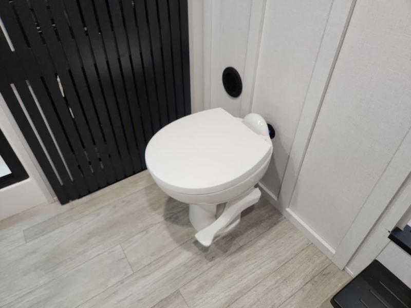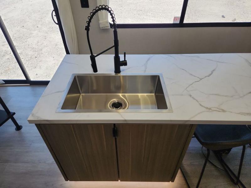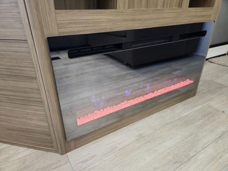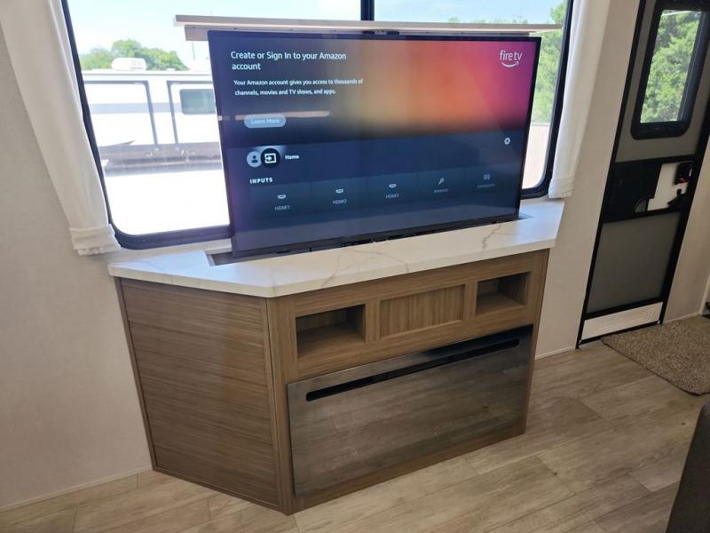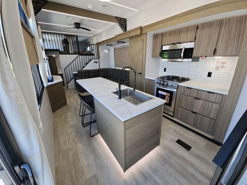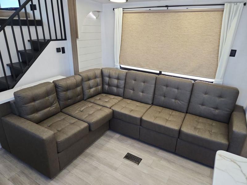 This trailer is built with comfort and convenience in mind, offering plenty of sleeping space for the whole gang. It has two spacious lofts, each equipped with two 42" x 72" bunk mats, plus an extra 36" x 38" bunk mat, providing cozy sleeping spots for everyone. Each loft also includes built-in storage for essentials, and instead of climbing a ladder, easy stair access makes getting in and out much safer. On the main floor, you’ll find a full rear bathroom with a walk-in shower and washer/dryer prep. The main living area has a large sectional sofa, perfect for gathering the group to watch the TV on the Televator or relaxing by the fireplace after a day outdoors. The kitchen is equipped with all the essentials, including a large pantry, overhead cabinets for snack storage, a fridge, and a kitchen island that adds prep space. Up front, the private bedroom has a king bed with Versa Tilt, a dresser, and shelves to keep your clothes and camp gear neatly organized. Regardless that you're adventuring about, this trailer is ready to make every trip feel like home.
