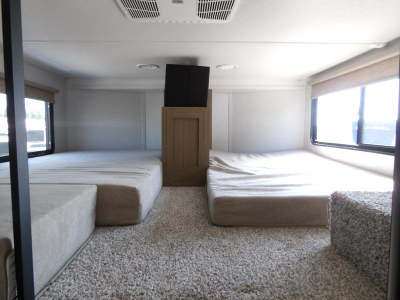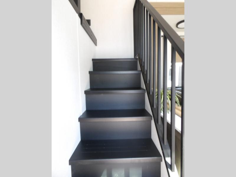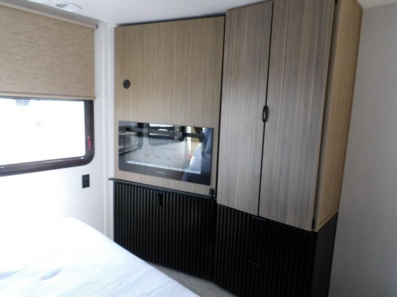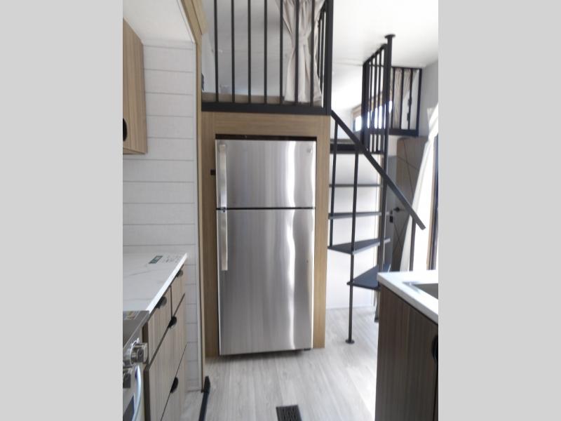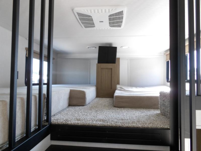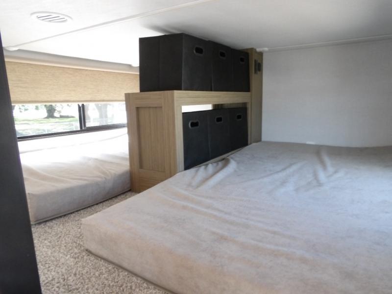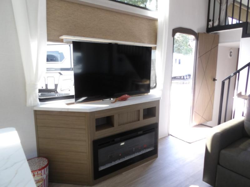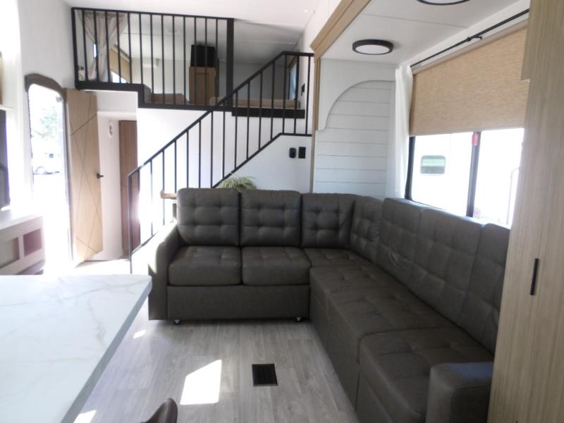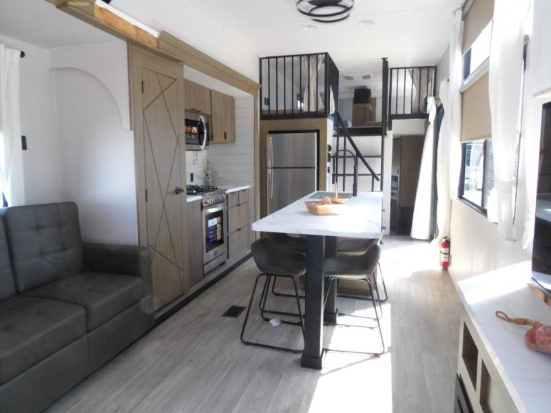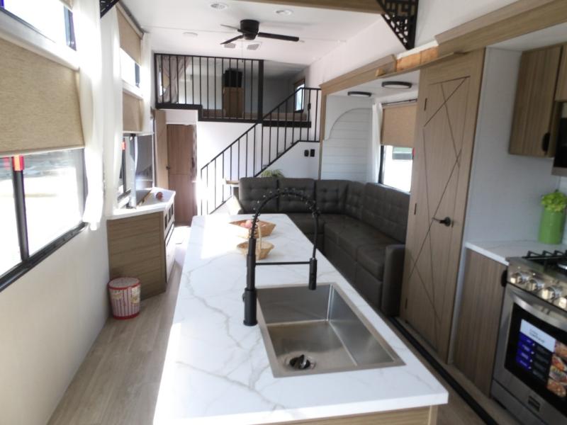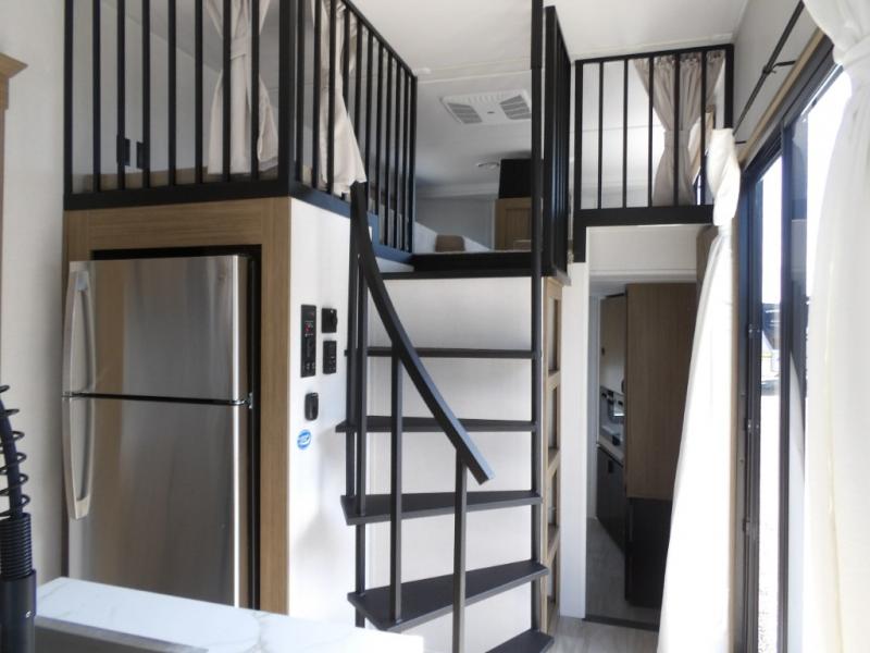 This trailer is built with comfort and convenience in mind, offering plenty of sleeping space for the whole gang. It has two spacious lofts, each equipped with two 42" x 72" bunk mats, plus an extra 36" x 38" bunk mat, providing cozy sleeping spots for everyone. Each loft also includes built-in storage for essentials, and instead of climbing a ladder, easy stair access makes getting in and out much safer. On the main floor, you’ll find a full rear bathroom with a walk-in shower and washer/dryer prep. The main living area has a large sectional sofa, perfect for gathering the group to watch the TV on the Televator or relaxing by the fireplace after a day outdoors. The kitchen is equipped with all the essentials, including a large pantry, overhead cabinets for snack storage, a fridge, and a kitchen island that adds prep space. Up front, the private bedroom has a king bed with Versa Tilt, a dresser, and shelves to keep your clothes and camp gear neatly organized. Regardless that you're adventuring about, this trailer is ready to make every trip feel like home.