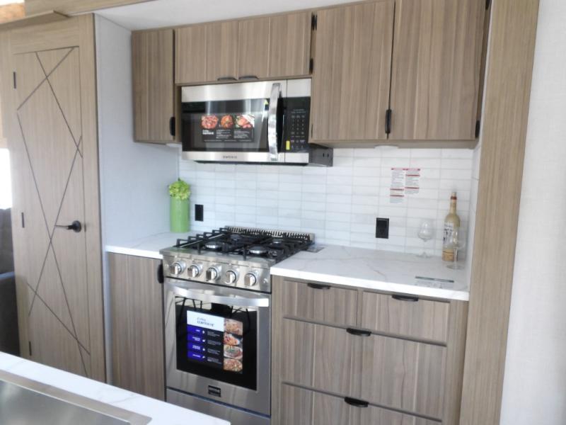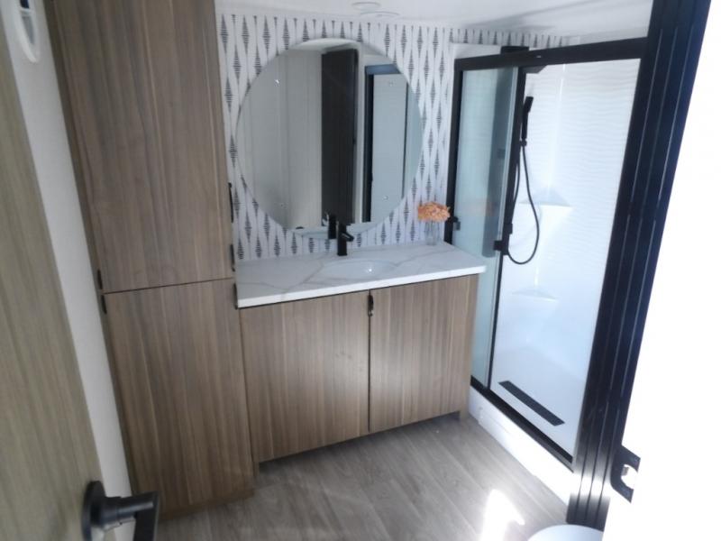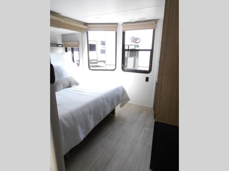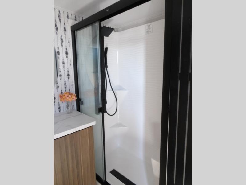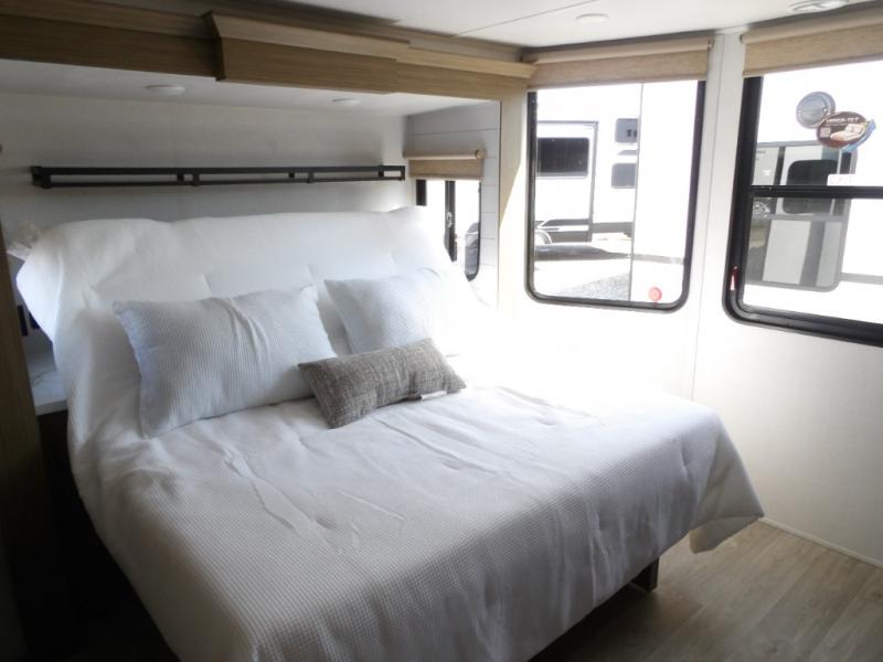 With any Salem Grand Villa destination trailer by Forest River, you can call home wherever you park it! There is a heated and enclosed Accessibelly for added protection, LED "Blade Lighting" under the awning, Lippert On-The-Go ladder prep, plus many more exterior conveniences. Elegant curtain rods and curtains will have you feeling right at home, along with stainless steel kitchen appliances, stylish roller shades, and enhanced floating shelves for added storage. Each model includes heavy duty cabinet hinges for safety and durability, a 60k on-demand tankless water heater for endless hot showers, a JBL 3-Zone media center, plus available options to further customize your trailer.