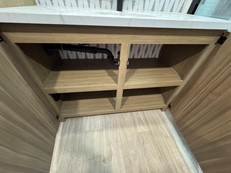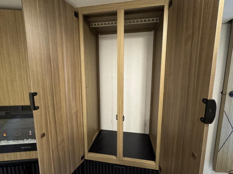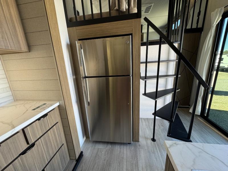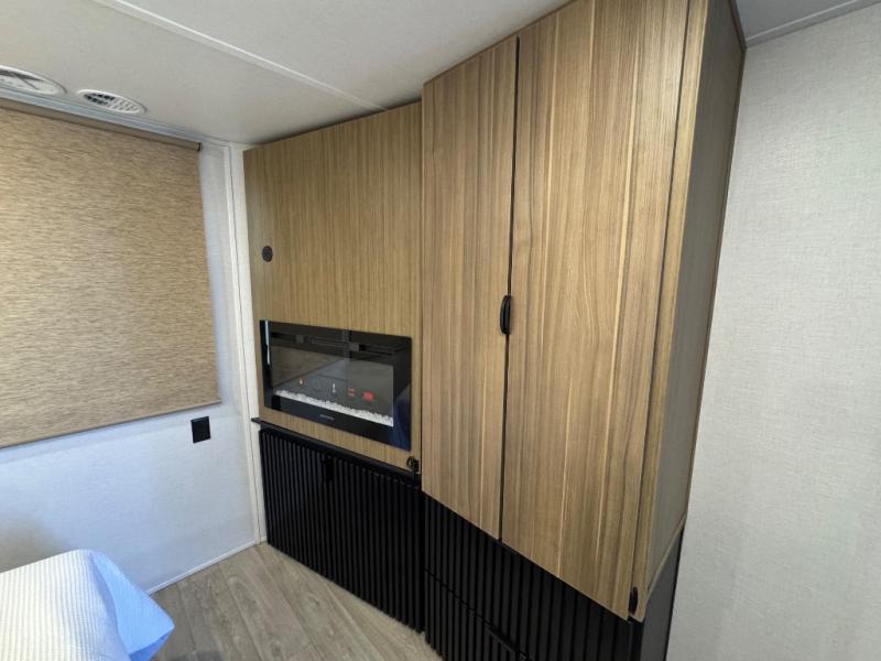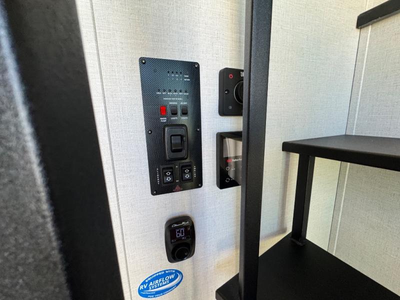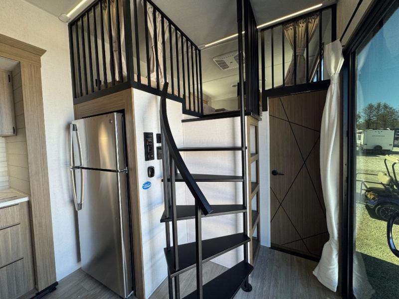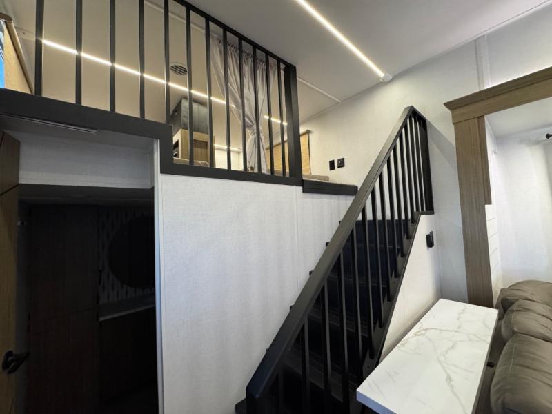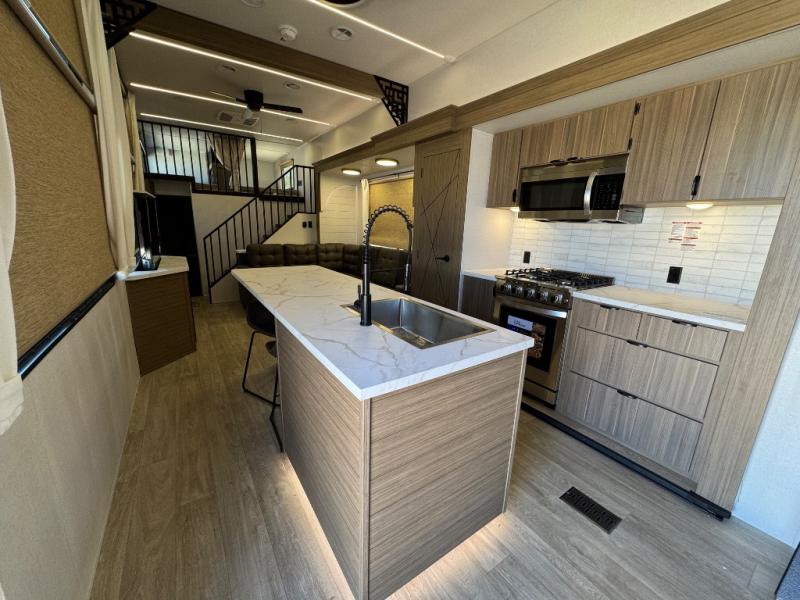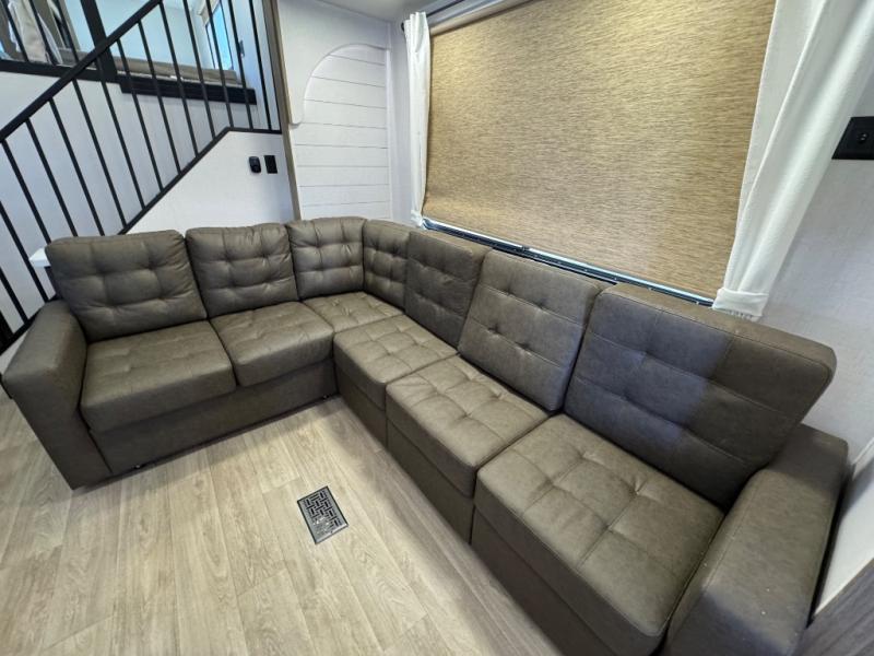 This trailer is built with comfort and convenience in mind, offering plenty of sleeping space for the whole gang. It has two spacious lofts, each equipped with two 42" x 72" bunk mats, plus an extra 36" x 38" bunk mat, providing cozy sleeping spots for everyone. Each loft also includes built-in storage for essentials, and instead of climbing a ladder, easy stair access makes getting in and out much safer. On the main floor, you’ll find a full rear bathroom with a walk-in shower and washer/dryer prep. The main living area has a large sectional sofa, perfect for gathering the group to watch the TV on the Televator or relaxing by the fireplace after a day outdoors. The kitchen is equipped with all the essentials, including a large pantry, overhead cabinets for snack storage, a fridge, and a kitchen island that adds prep space. Up front, the private bedroom has a king bed with Versa Tilt, a dresser, and shelves to keep your clothes and camp gear neatly organized. Regardless that you're adventuring about, this trailer is ready to make every trip feel like home.