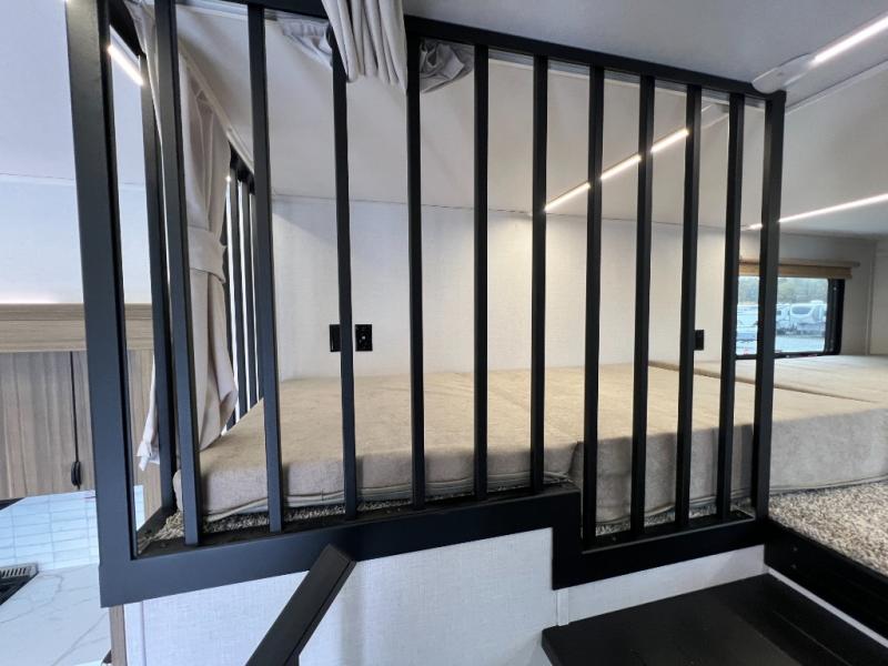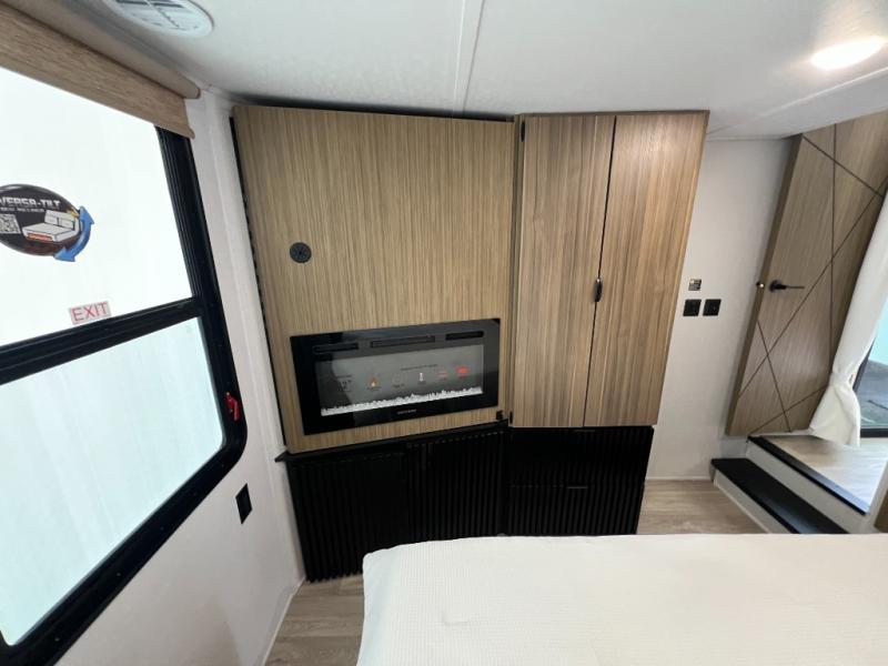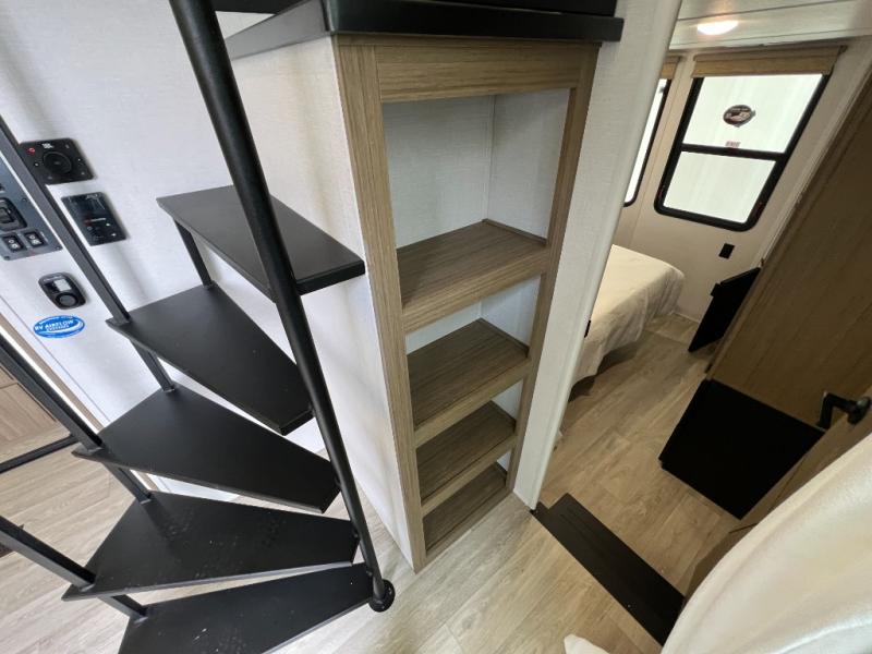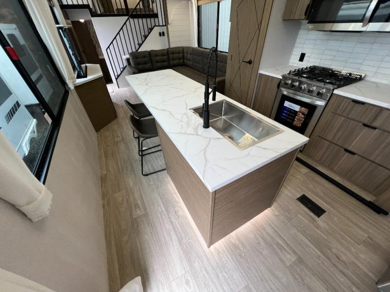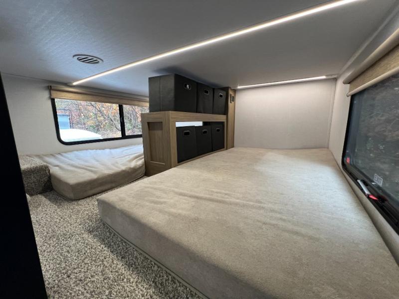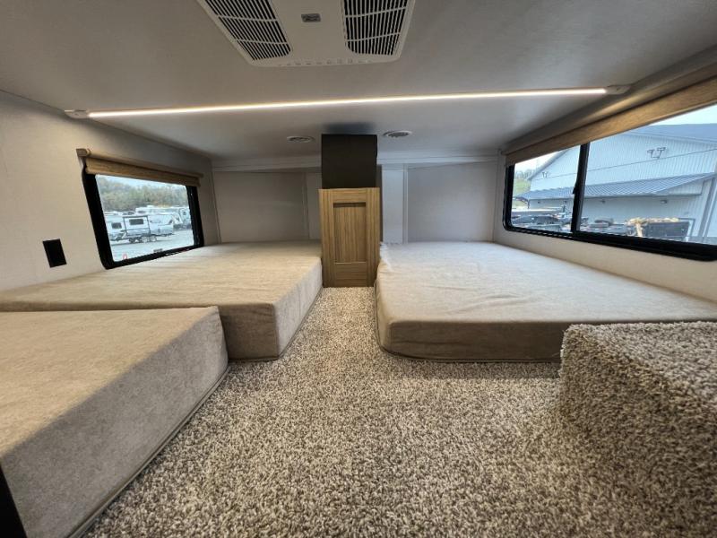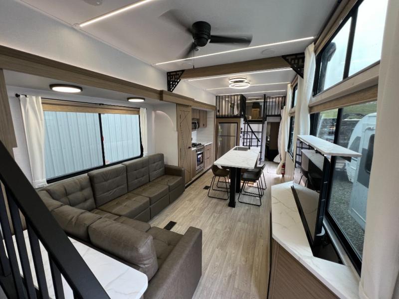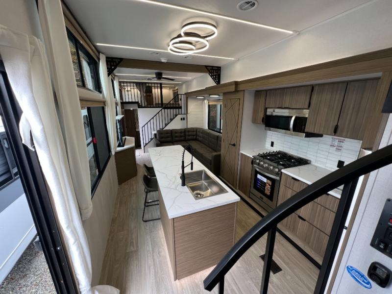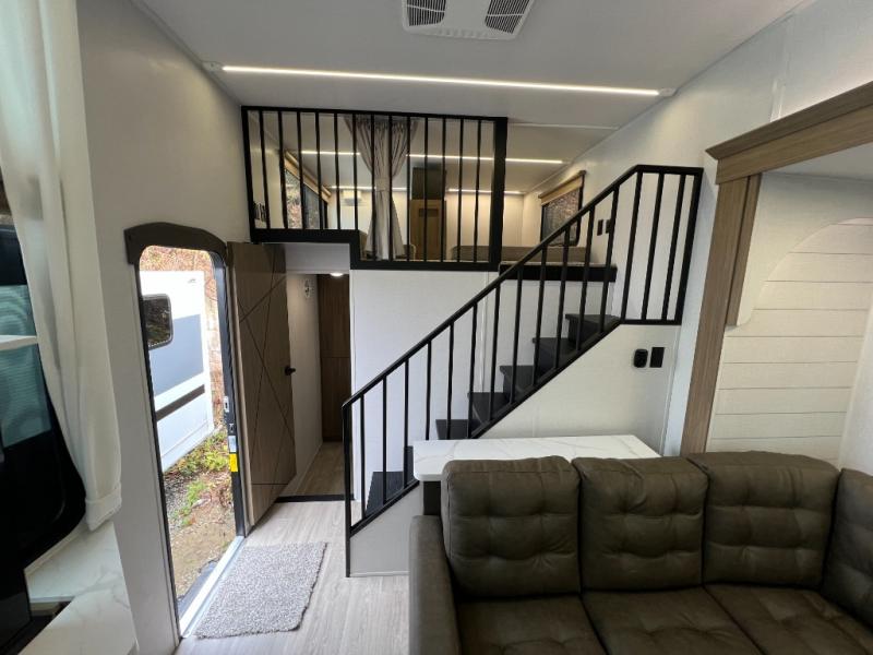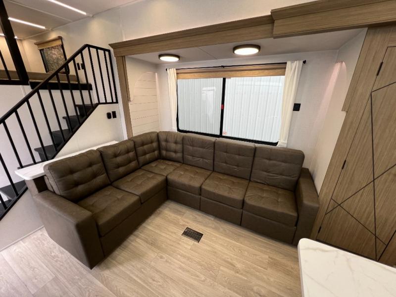 This trailer is built with comfort and convenience in mind, offering plenty of sleeping space for the whole gang. It has two spacious lofts, each equipped with two 42" x 72" bunk mats, plus an extra 36" x 38" bunk mat, providing cozy sleeping spots for everyone. Each loft also includes built-in storage for essentials, and instead of climbing a ladder, easy stair access makes getting in and out much safer. On the main floor, you’ll find a full rear bathroom with a walk-in shower and washer/dryer prep. The main living area has a large sectional sofa, perfect for gathering the group to watch the TV on the Televator or relaxing by the fireplace after a day outdoors. The kitchen is equipped with all the essentials, including a large pantry, overhead cabinets for snack storage, a fridge, and a kitchen island that adds prep space. Up front, the private bedroom has a king bed with Versa Tilt, a dresser, and shelves to keep your clothes and camp gear neatly organized. Regardless that you're adventuring about, this trailer is ready to make every trip feel like home.