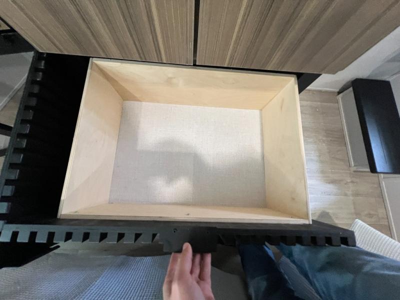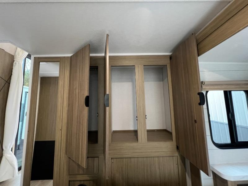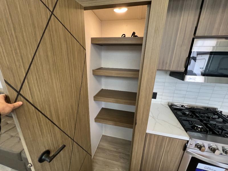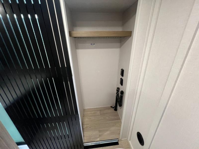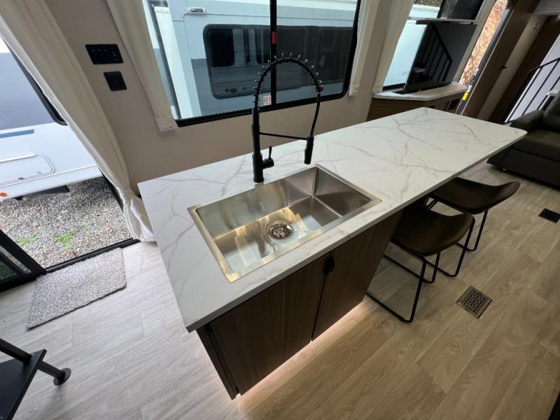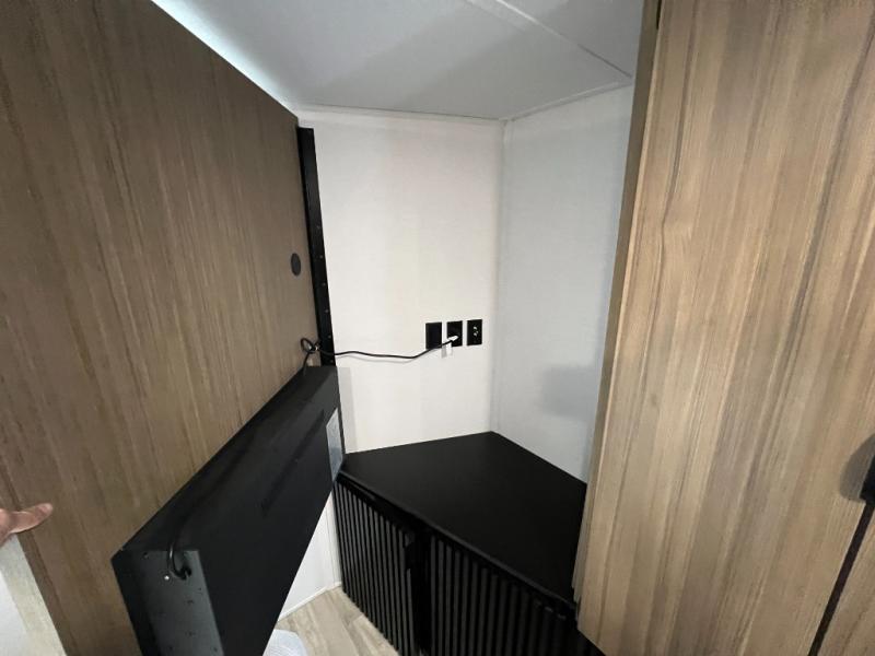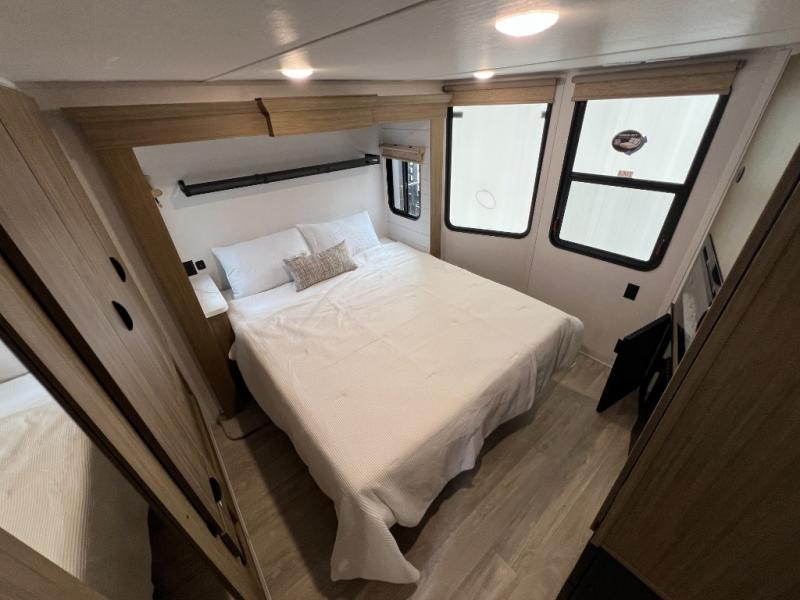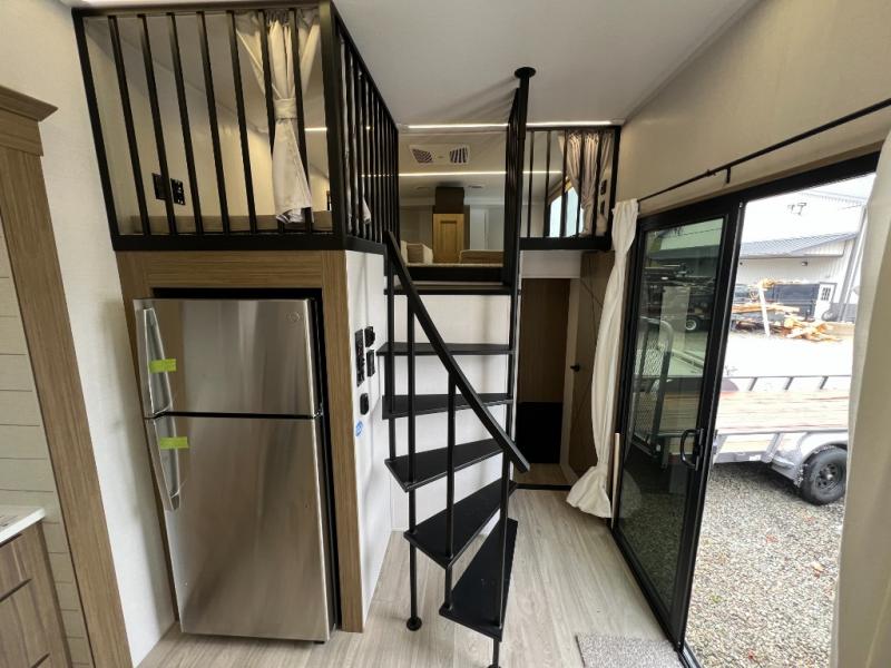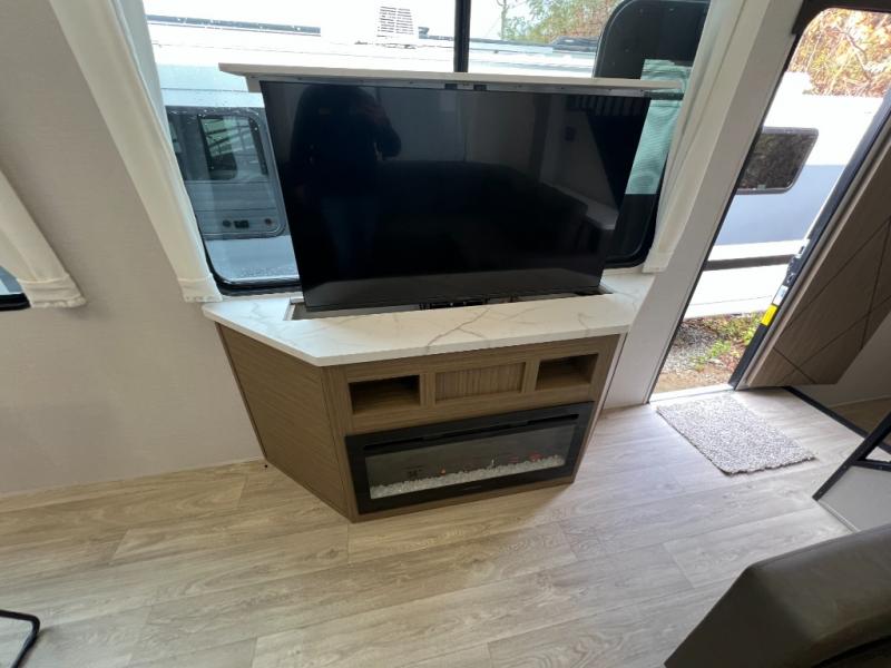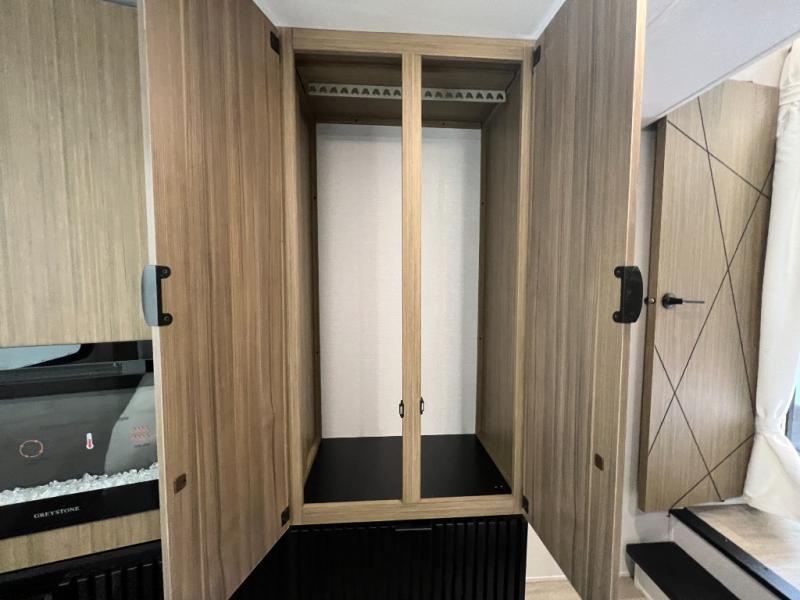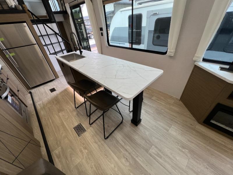 This trailer is built with comfort and convenience in mind, offering plenty of sleeping space for the whole gang. It has two spacious lofts, each equipped with two 42" x 72" bunk mats, plus an extra 36" x 38" bunk mat, providing cozy sleeping spots for everyone. Each loft also includes built-in storage for essentials, and instead of climbing a ladder, easy stair access makes getting in and out much safer. On the main floor, you’ll find a full rear bathroom with a walk-in shower and washer/dryer prep. The main living area has a large sectional sofa, perfect for gathering the group to watch the TV on the Televator or relaxing by the fireplace after a day outdoors. The kitchen is equipped with all the essentials, including a large pantry, overhead cabinets for snack storage, a fridge, and a kitchen island that adds prep space. Up front, the private bedroom has a king bed with Versa Tilt, a dresser, and shelves to keep your clothes and camp gear neatly organized. Regardless that you're adventuring about, this trailer is ready to make every trip feel like home.