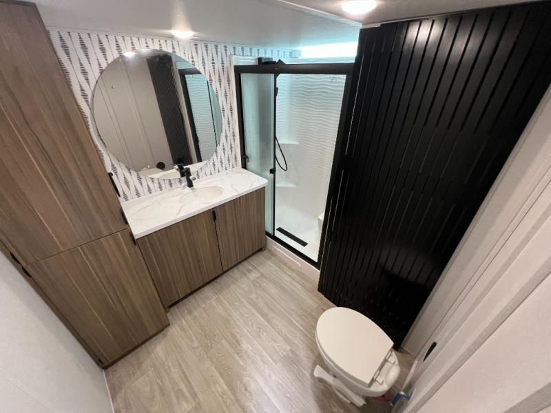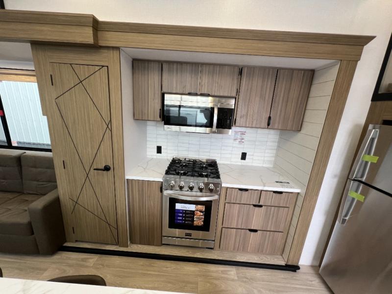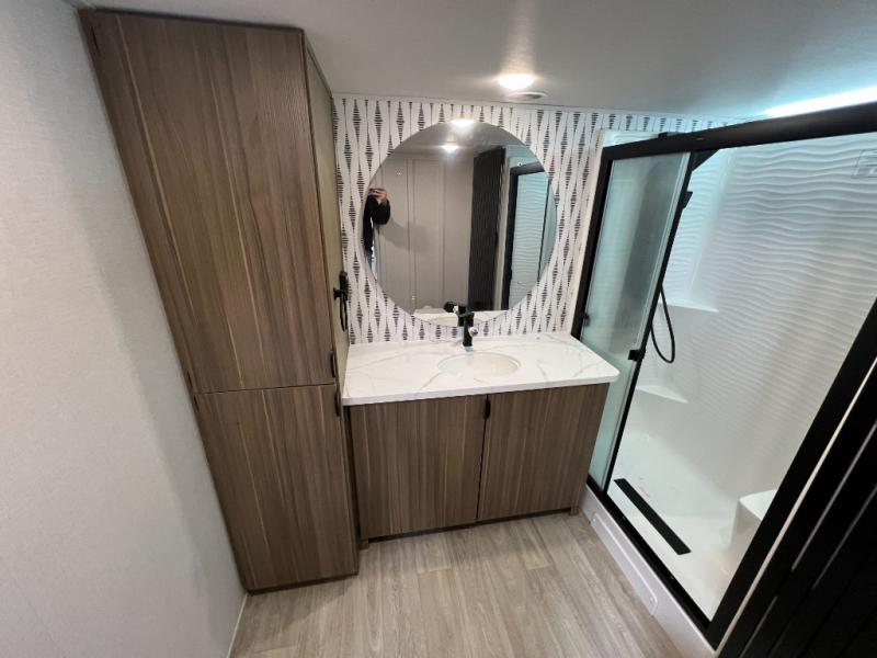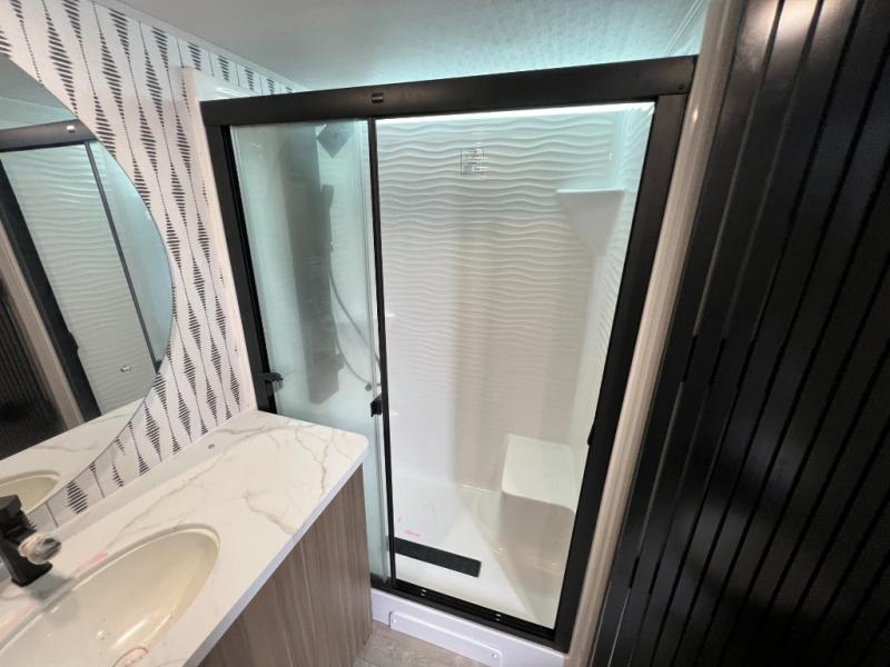 With any Salem Grand Villa destination trailer by Forest River, you can call home wherever you park it! There is a heated and enclosed Accessibelly for added protection, LED "Blade Lighting" under the awning, Lippert On-The-Go ladder prep, plus many more exterior conveniences. Elegant curtain rods and curtains will have you feeling right at home, along with stainless steel kitchen appliances, stylish roller shades, and enhanced floating shelves for added storage. Each model includes heavy duty cabinet hinges for safety and durability, a 60k on-demand tankless water heater for endless hot showers, a JBL 3-Zone media center, plus available options to further customize your trailer.