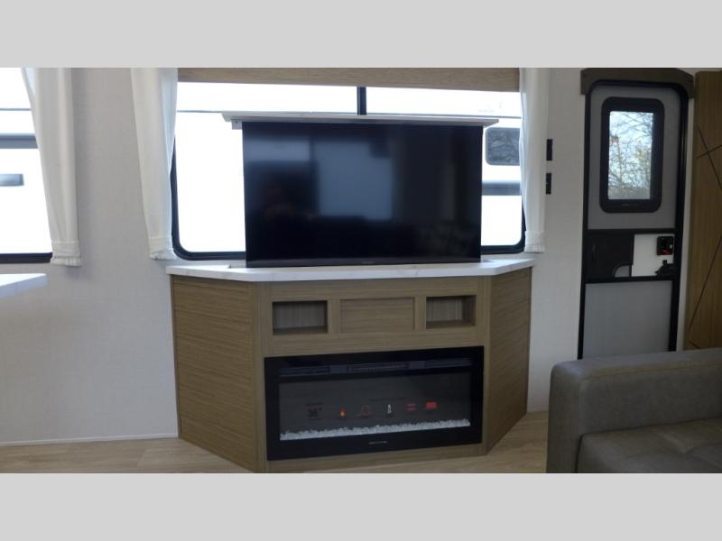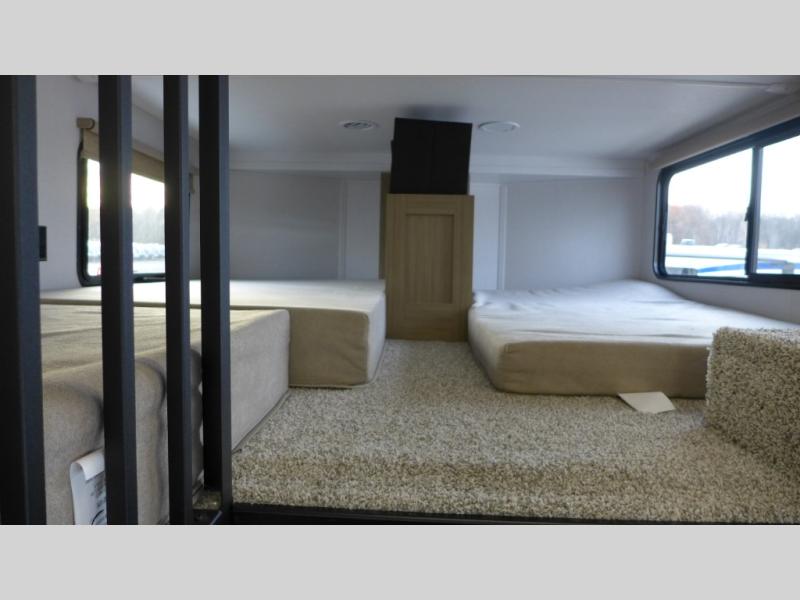 This trailer is built with comfort and convenience in mind, offering plenty of sleeping space for the whole gang. It has two spacious lofts, each equipped with two 42" x 72" bunk mats, plus an extra 36" x 38" bunk mat, providing cozy sleeping spots for everyone. Each loft also includes built-in storage for essentials, and instead of climbing a ladder, easy stair access makes getting in and out much safer. On the main floor, you’ll find a full rear bathroom with a walk-in shower and washer/dryer prep. The main living area has a large sectional sofa, perfect for gathering the group to watch the TV on the Televator or relaxing by the fireplace after a day outdoors. The kitchen is equipped with all the essentials, including a large pantry, overhead cabinets for snack storage, a fridge, and a kitchen island that adds prep space. Up front, the private bedroom has a king bed with Versa Tilt, a dresser, and shelves to keep your clothes and camp gear neatly organized. Regardless that you're adventuring about, this trailer is ready to make every trip feel like home.
