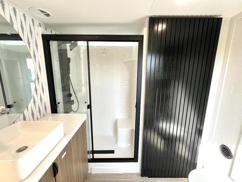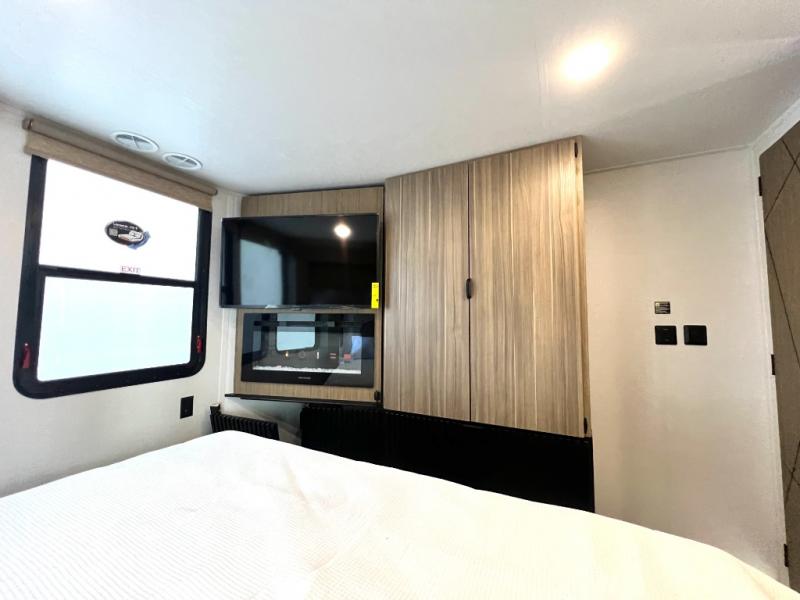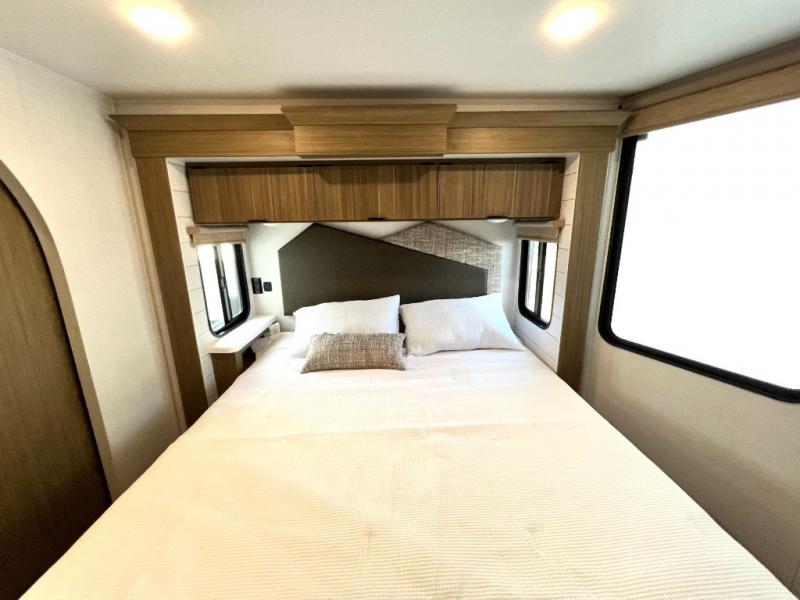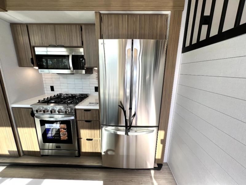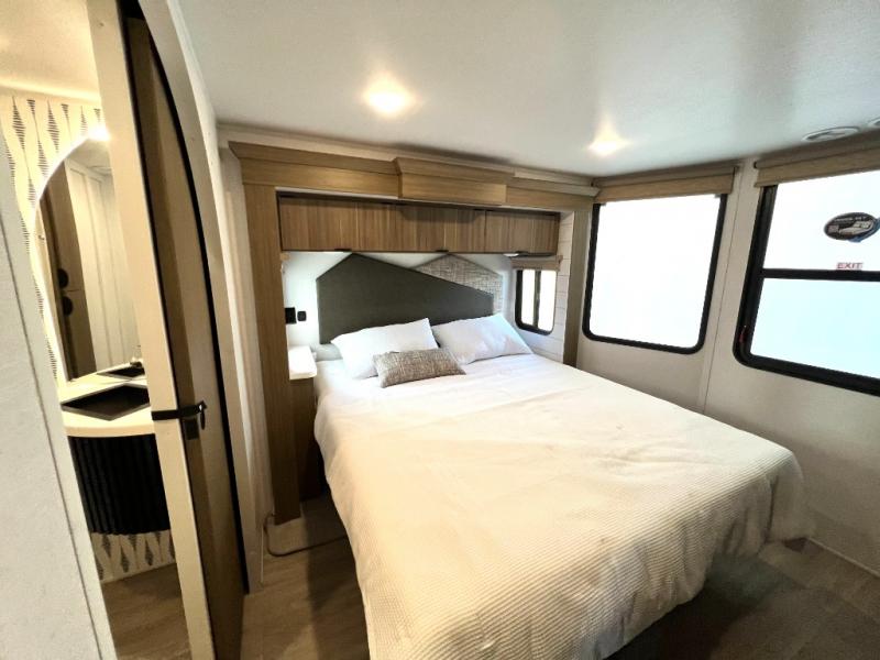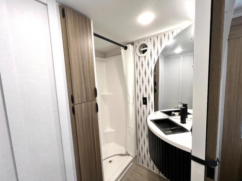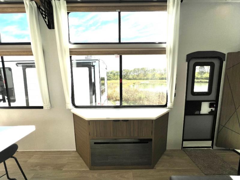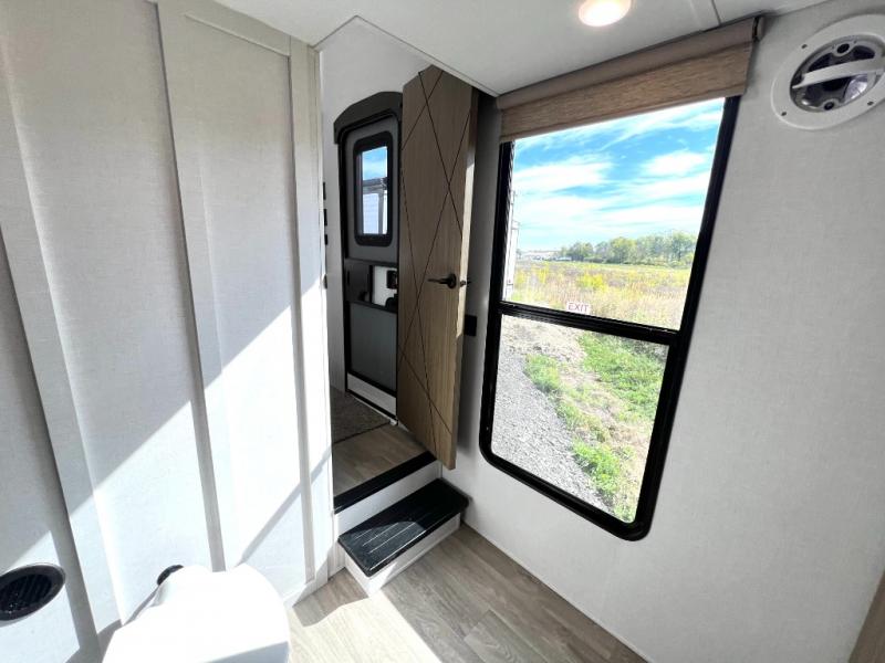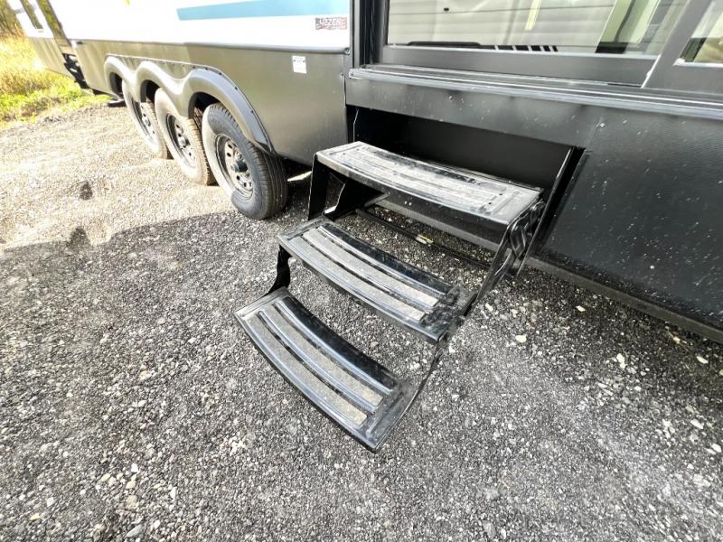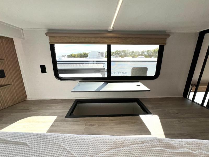 With any Salem Grand Villa destination trailer by Forest River, you can call home wherever you park it! There is a heated and enclosed Accessibelly for added protection, LED "Blade Lighting" under the awning, Lippert On-The-Go ladder prep, plus many more exterior conveniences. Elegant curtain rods and curtains will have you feeling right at home, along with stainless steel kitchen appliances, stylish roller shades, and enhanced floating shelves for added storage. Each model includes heavy duty cabinet hinges for safety and durability, a 60k on-demand tankless water heater for endless hot showers, a JBL 3-Zone media center, plus available options to further customize your trailer.